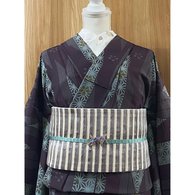 ・商品名:「滅紫色に矢絣・桜文様の洗える小紋着物」 リユースの袷仕立てのお着物です。 ・素材:ポリエステル100% ・衿の仕立て:広衿 ・色柄説明:縮緬風な滅紫色(灰みのある暗い紫色)に ミントグレー、カラシ色、抹茶色の 矢絣にストライプ、麻の葉文様、桜文様がデザインされたお渋でレトロ可愛い小紋着物です☺︎ (1番近い色の写真は3枚目です) ・八掛の色柄:ワインレッド ・サイズ 身長165㎝くらいまでの方(それ以上の方は対丈や靴と組み合わせる等がオススメです) 身丈:160㎝ 袖丈:49㎝ 裄丈:66㎝ 前幅:23.5㎝ 後ろ幅:31㎝ ・汚れ/キズ:状態は非常に良いです。 表裏共に目立ったシミや汚れはありません。 ※こちらは着物単品での出品になります。 帯、その他小物等はついておりませんのでご注意下さいませ。 ※リユース・ヴィンテージの着物は全て一点ものの為再販はございません。