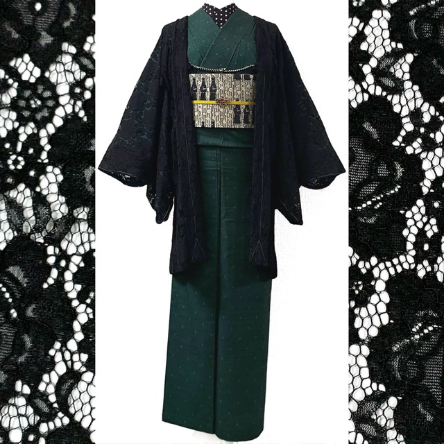 ・商品名:「新品 単衣仕立ての総レース羽織り(ブラック)」 新品の単衣仕立ての羽織です。 ・素材:ナイロン 47% 綿 37% レーヨン 16% 中国縫製 ・色柄説明:通常と異なるサイズ展開のお品物の為、数量限定特価でのご紹介です。 大小の花模様を敷き詰めたデザインの黒色総レース羽織です☺︎ (1番近い色の写真は4枚目です) ・裏布の色柄:単衣仕立ての為裏地は付いておりません。 ・サイズ 身丈:約91㎝ 袖丈:約48㎝ 裄丈:約66㎝ 伸縮性のある生地の為、若干の誤差が生じる場合がございます。 予めご了承下さいませ。 ・汚れ/キズ:新品の為コンディション良好です。 タグ、しつけ付きです。 【注意事項】 ※レース生地は、非常にデリケートです。 ひっかかりにご注意下さいませ。 ※濃色生地は、濡れた状態や、着用中の摩擦により移染する恐れがございます。 淡い色と合わせる着用には十分注意して下さいませ。 ▲▲▲▲▲▲▲ 【お手入れについて】 レース着物のお手入れに慣れた方でしたら、 ご自宅でのお洗濯も可能です。 軽く畳み、目の細かい洗濯ネットに入れて洗濯機の手洗いモードで、 おしゃれ着用の中性洗剤を使用 手洗いモードの最短時間にてお洗濯下さい。 すすぎは十分行なって下さい。 ※濃色は色落ち、色移りする場合がございます。必ず単独で洗って下さい。 また、若干縮みがございます。気になる箇所を伸ばしながらアイロンして頂きますと大体な復活致します。 ・・ご注意・・ レース着物のお手入れ未経験の方や不慣れな方は 着物専門業者のドライクリーニングをオススメします。 ※こちらは羽織単品での出品になります。 羽織紐、着物、帯、その為小物等はついておりません。 その他商品につきましては、お気軽にお問い合わせくださいませ☺︎