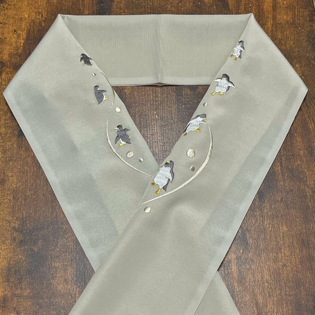 商品名:ペンギン刺繍半衿(グレー) 状態:新品 素材:衿地 ポリエステル100% 刺繍糸 レーヨン100% (金属糸使用の場合あり) サイズ:長さ 約115㎝ 幅 約16.5㎝ 色・質感:さらりとしたセミマッドの節分草色(やや黄緑みのライトグレー)地に 光沢のある刺繍糸で グレー、白色、からし色、グレージュの よちよちと歩くペンギン柄が刺繍された可愛らしい半衿です☺︎ アシンメトリーなデザインで、右側はペンギンが前向き。左側はペンギンが後ろ向きにデザインされています。 ※半衿単品でのご紹介です。 着物、帯、その他小物は付属しておりません。ご注意下さいませ。 ※この製品は加工の性質上、汗や水分、強い摩擦などにより色落ちが生じる場合がございます。 お洗濯の際はドライクリーニングをお勧めいたします。