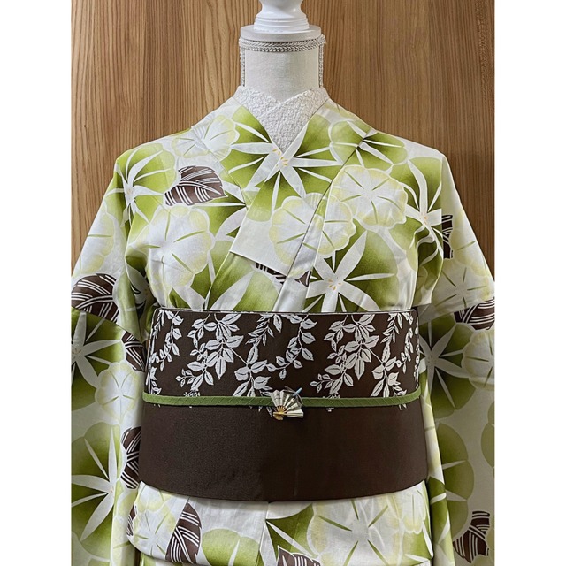 商品名:「新品 格子織柄入り 海松色の朝顔文様の綿浴衣」 状態:新品タグ付き 素材:綿100% 中国製 サイズ:フリーサイズ 身丈約163㎝ 袖丈約49㎝ 裄丈約67㎝ 前幅約25㎝ 後幅約31㎝ 色柄説明:格子柄の変わり織が施されたオフホワイト地へ 海松色(茶みを帯びた深い黄緑色)、若芽色(淡い黄緑色)、モカブラウン(灰みの焦茶)の暈しを効かせた朝顔文様がデザインされた爽やか可愛い一枚です☺︎ (1番近い色の写真は3枚目です) 真夏は浴衣として、初夏や秋口には襦袢と合わせて綿の単衣として長くご着用頂けます。 ◎お洗濯は手洗い又はネットに入れてのお洒落着洗いがオススメです。(洗濯機ご使用の際は脱水はかけ過ぎず、水分を含んだ状態で陰干して頂くとシワになりにくいです) ※写真は着用例です。 帯、三分紐、帯留め等は付属しておりません。ご注意下さいませ。