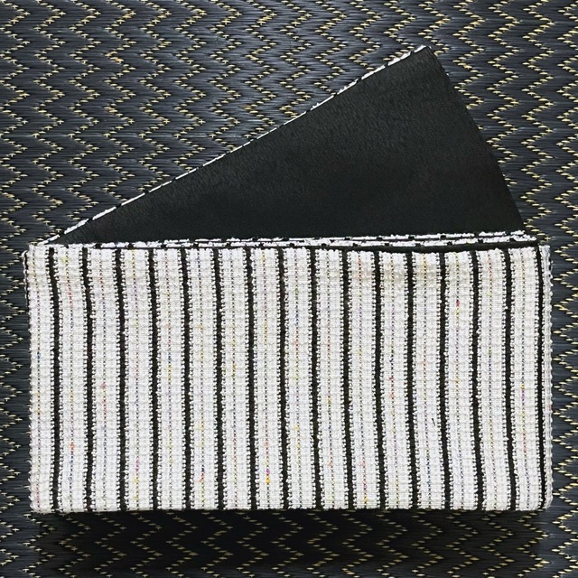 商品名:「ラメ糸入りツイード素材のストライプ柄リバーシブル半幅帯(モノトーン×レインボー) 」 状態:新品 素材:表地…ポリエステル43% 綿48% ポリウレタン2% 銀糸7% 裏地…ポリエステル100% 帯芯…綿100% 日本製 サイズ:長さ約390㎝ 巾約17㎝ 色柄説明:銀糸を織り込んだ白色と、黒色、レインボーカラーのストライプ柄に織り込まれたツイード素材が上品でモダンな洋装MIXにもオススメな半幅帯です☺︎ リバーシブルの裏側はシンプルな墨黒の細かな雨縞模様です。 小紋や紬に如何でしょうか☺︎ ※帯単品でのご紹介です。 着物、三分紐、帯留めは付属しておりません。ご注意下さいませ。