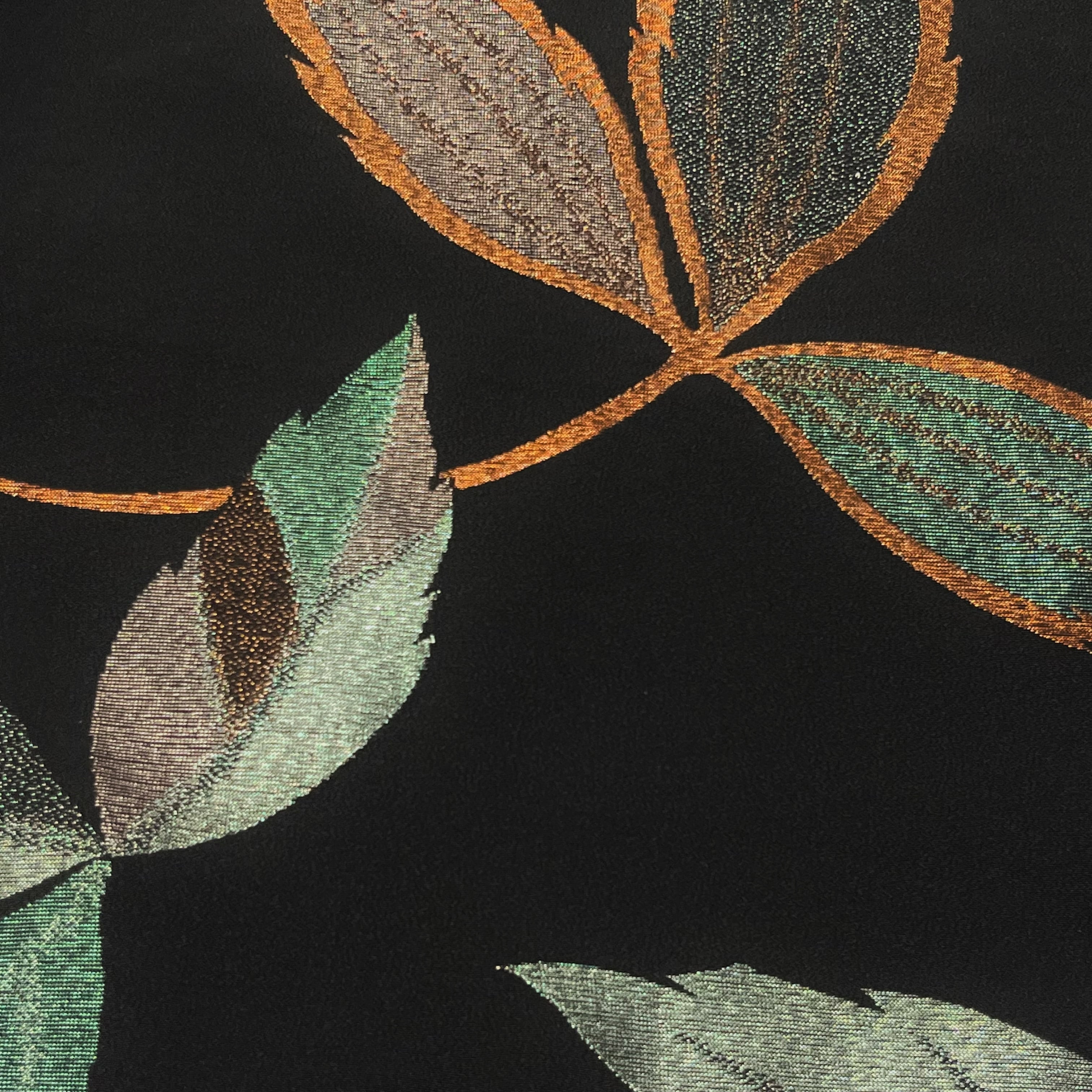 ブロンズカラー、銀色、エメラルドグリーン、桜色のラメ糸で大きな葉模様がデザインされた