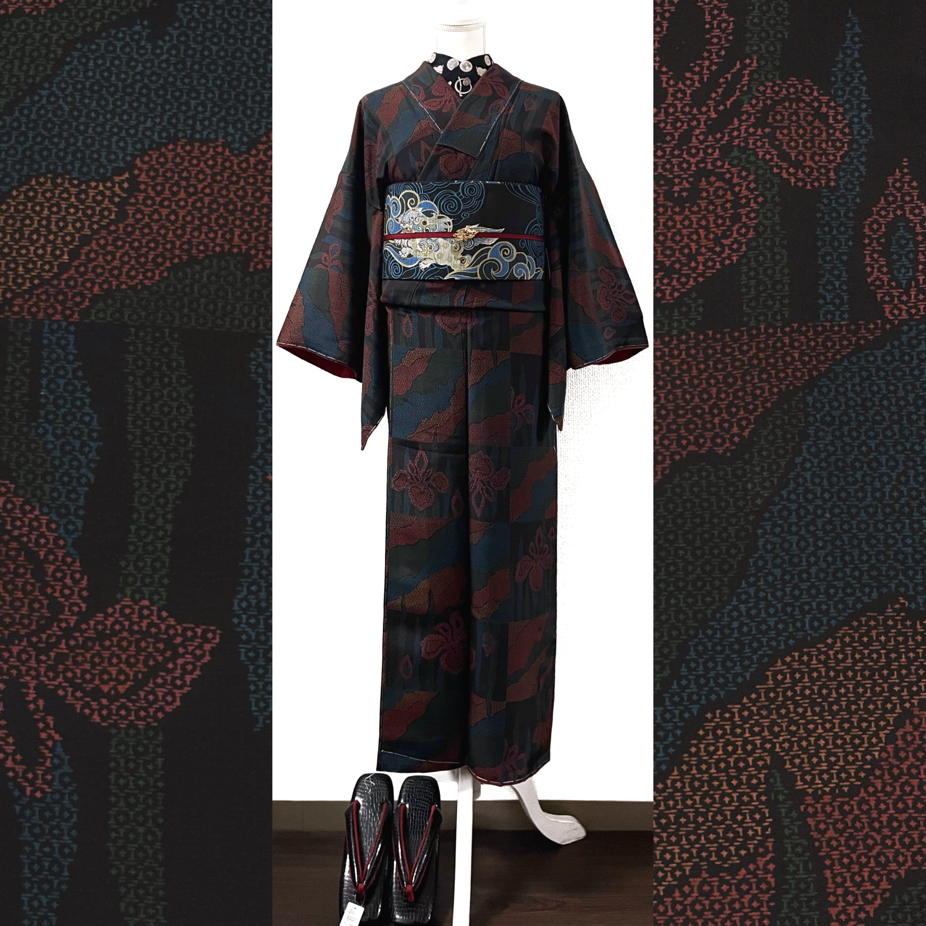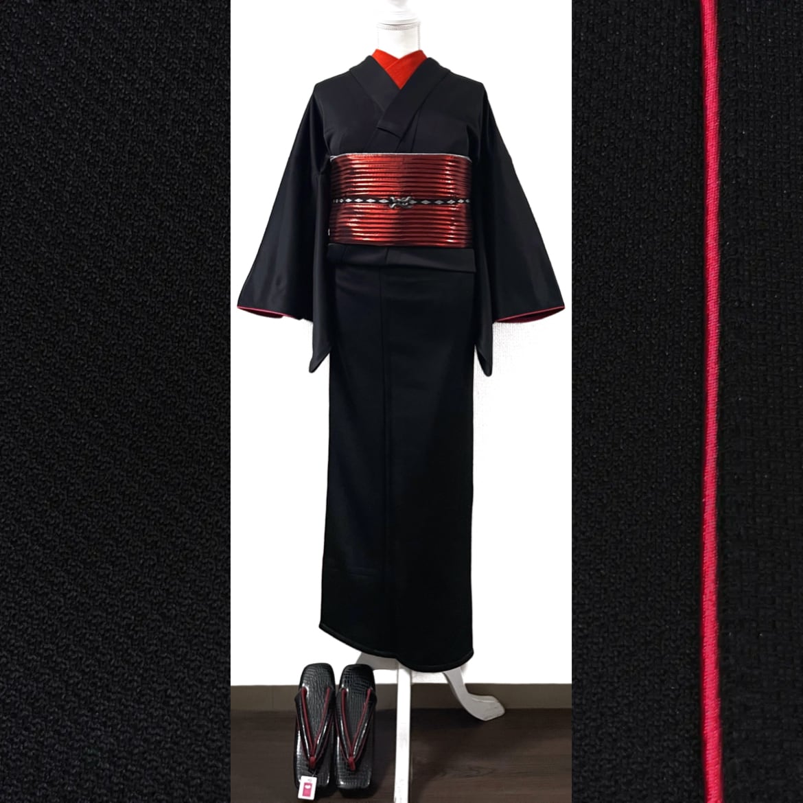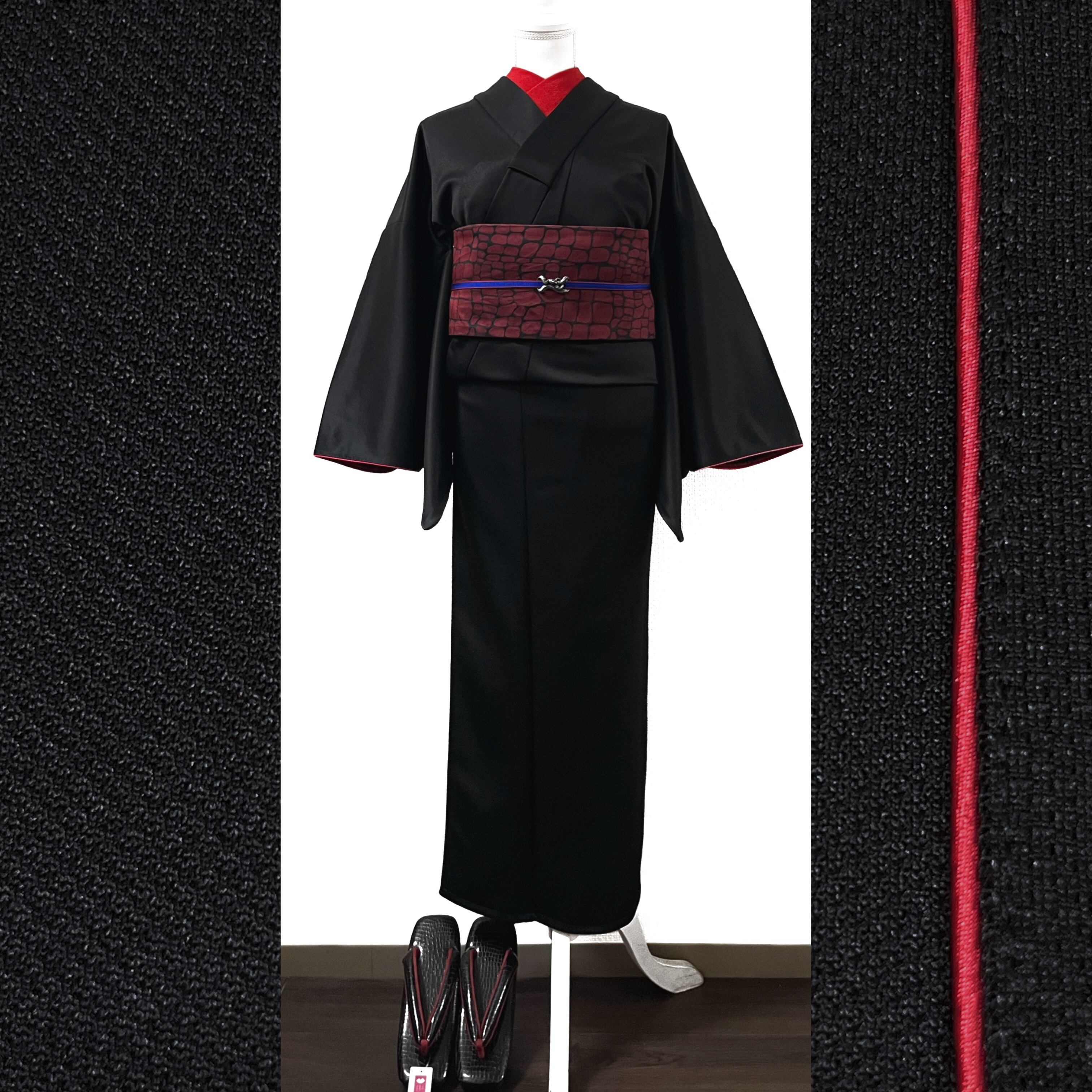 鼻緒…台とお揃いの黒色のクロコ型押しフェイスレザーにスエード調の苺色(やや紫みがかった赤色)