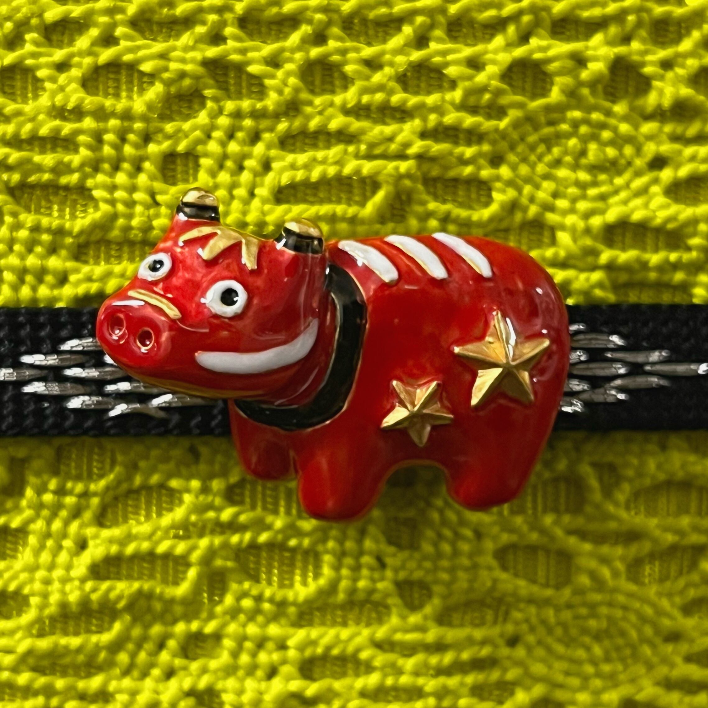 マットなイエローゴールドカラーにツヤ感のある赤色、ミルクホワイト、黒色で彩色された