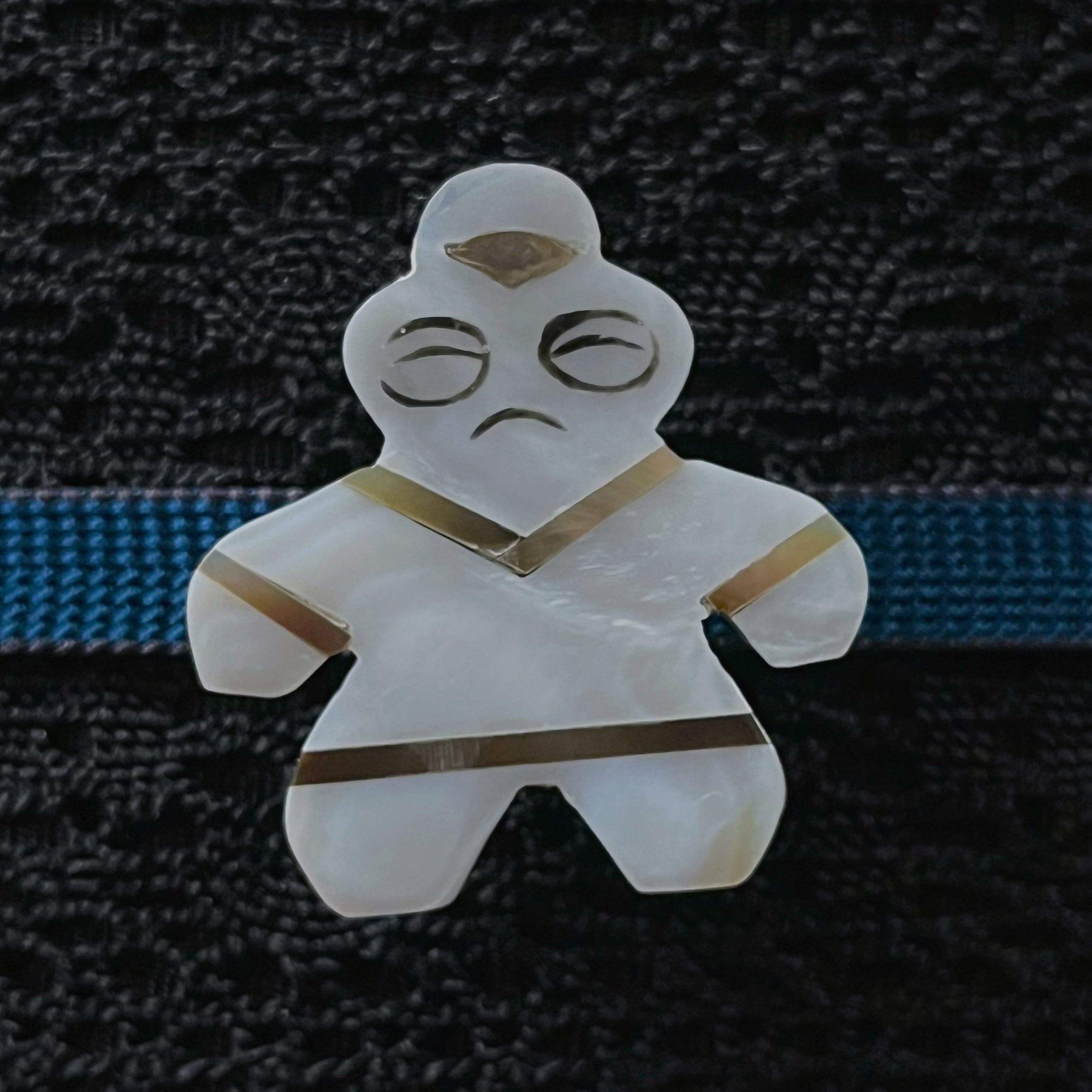 黒色のお顔のパーツと潤色(うるみ色:赤みのグレー)の体の模様が象嵌された埴輪デザインの個性派帯留めです☺︎