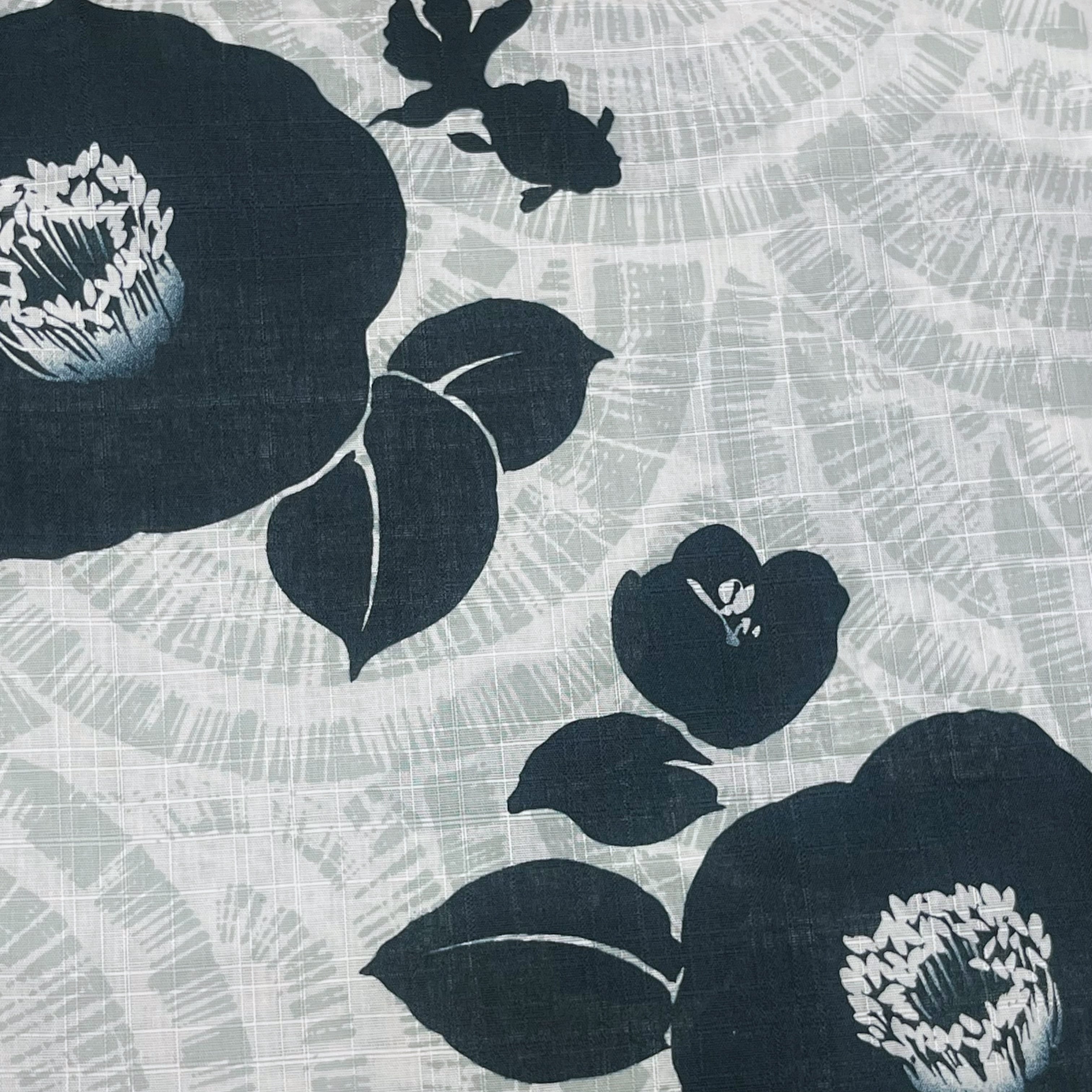 褐色(かち色:黒に近い程濃い青緑色)と素鼠色(他の色味を含まないグレー)の金魚と大きな椿文様がデザインされた