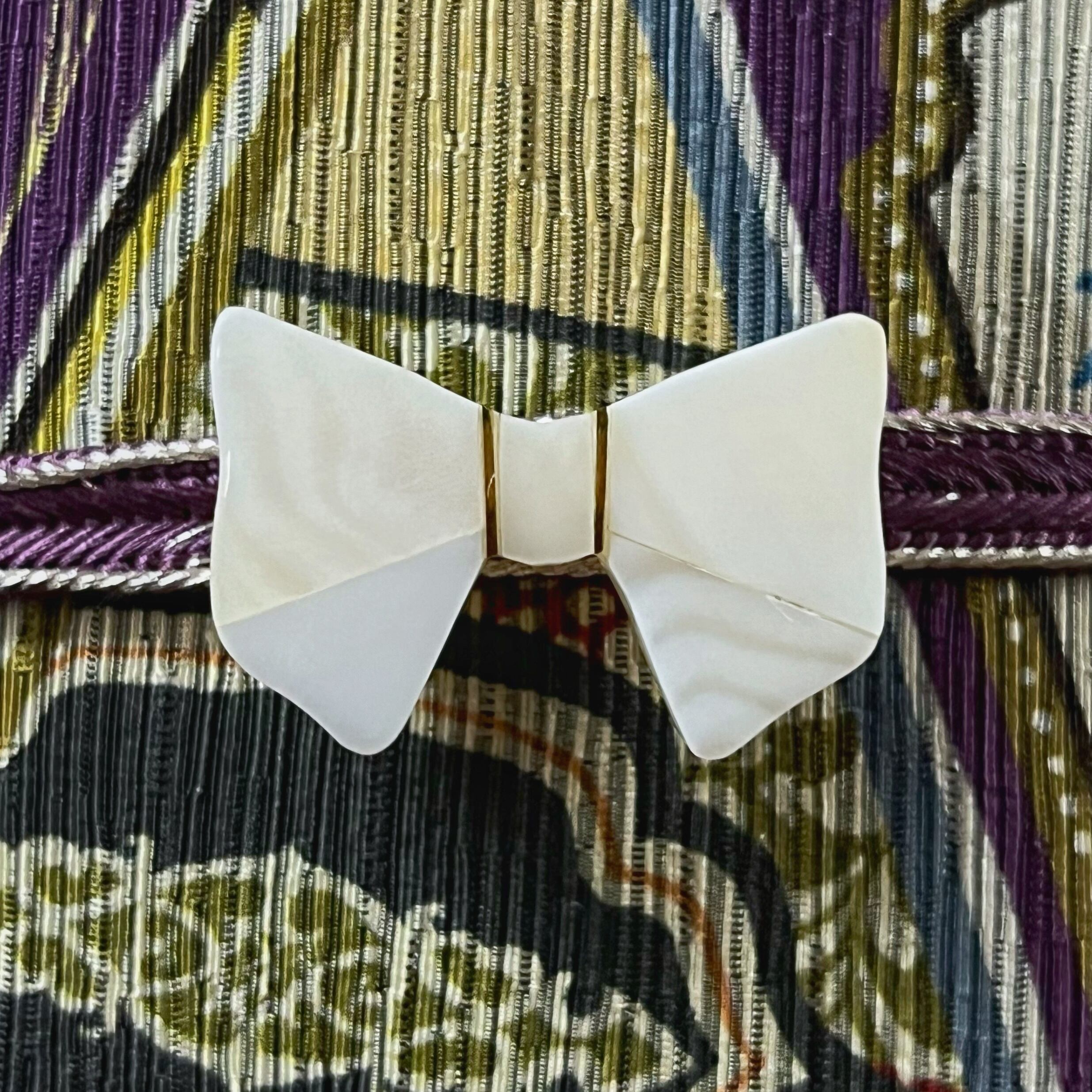 色・質感:向きによって虹色に輝く、乳白色の天然貝に金彩を象嵌したリボンモチーフのガーリーな帯留めです☺︎