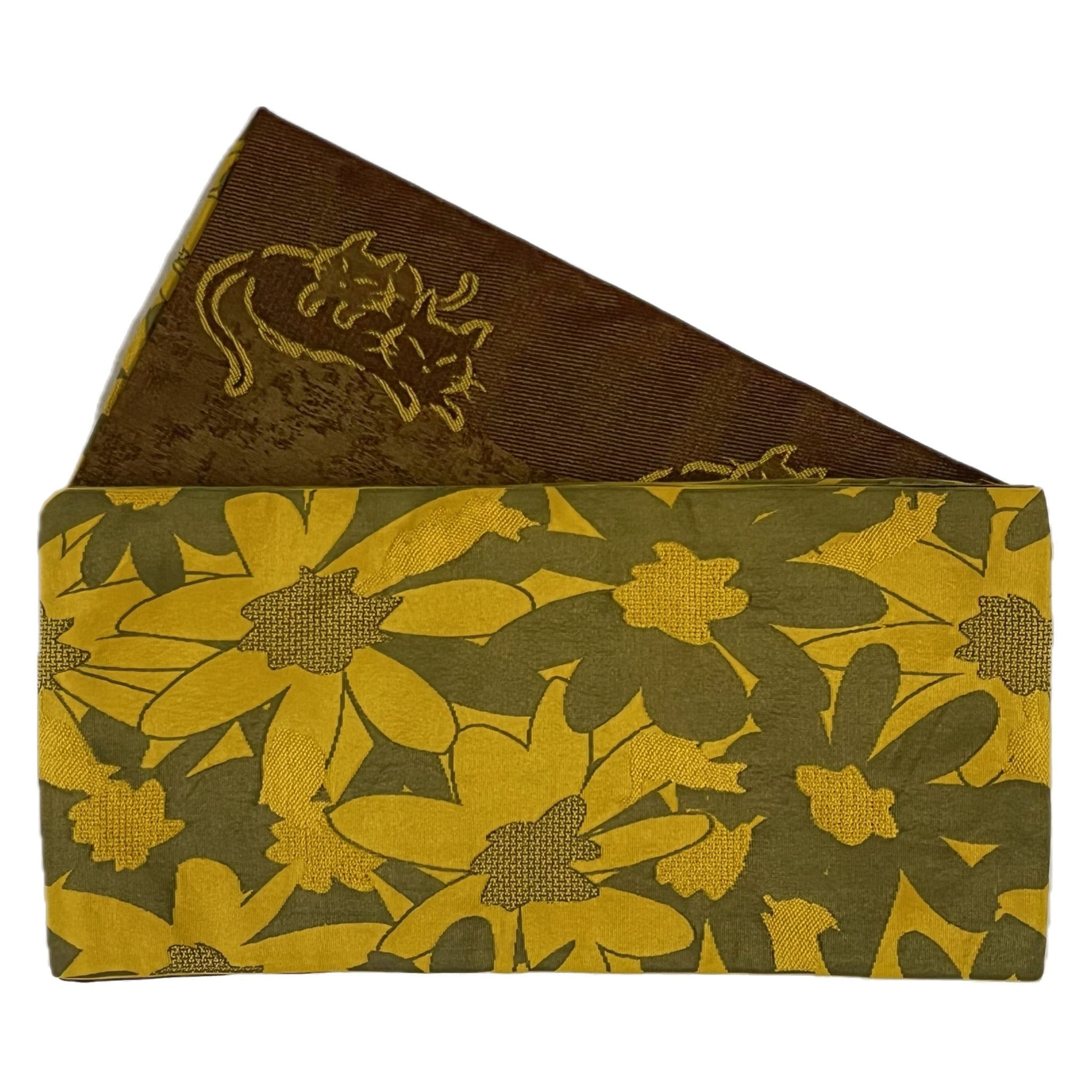 リバーシブルの裏側はチョコレートブラウン地に、深支子色(こきくちなし色:赤みの淡い黄橙色)のデフォルメされた2匹の猫が戯れているデザインです。