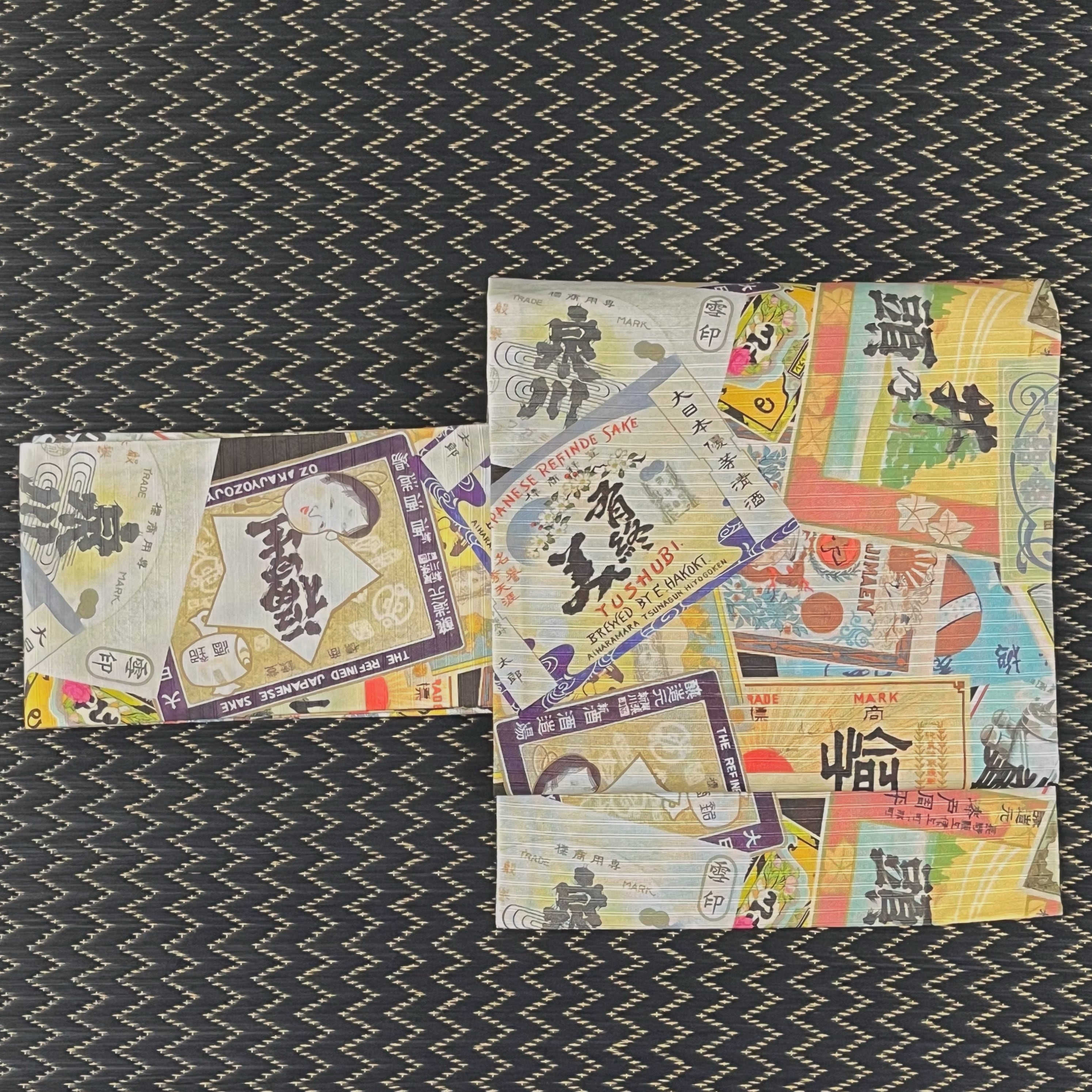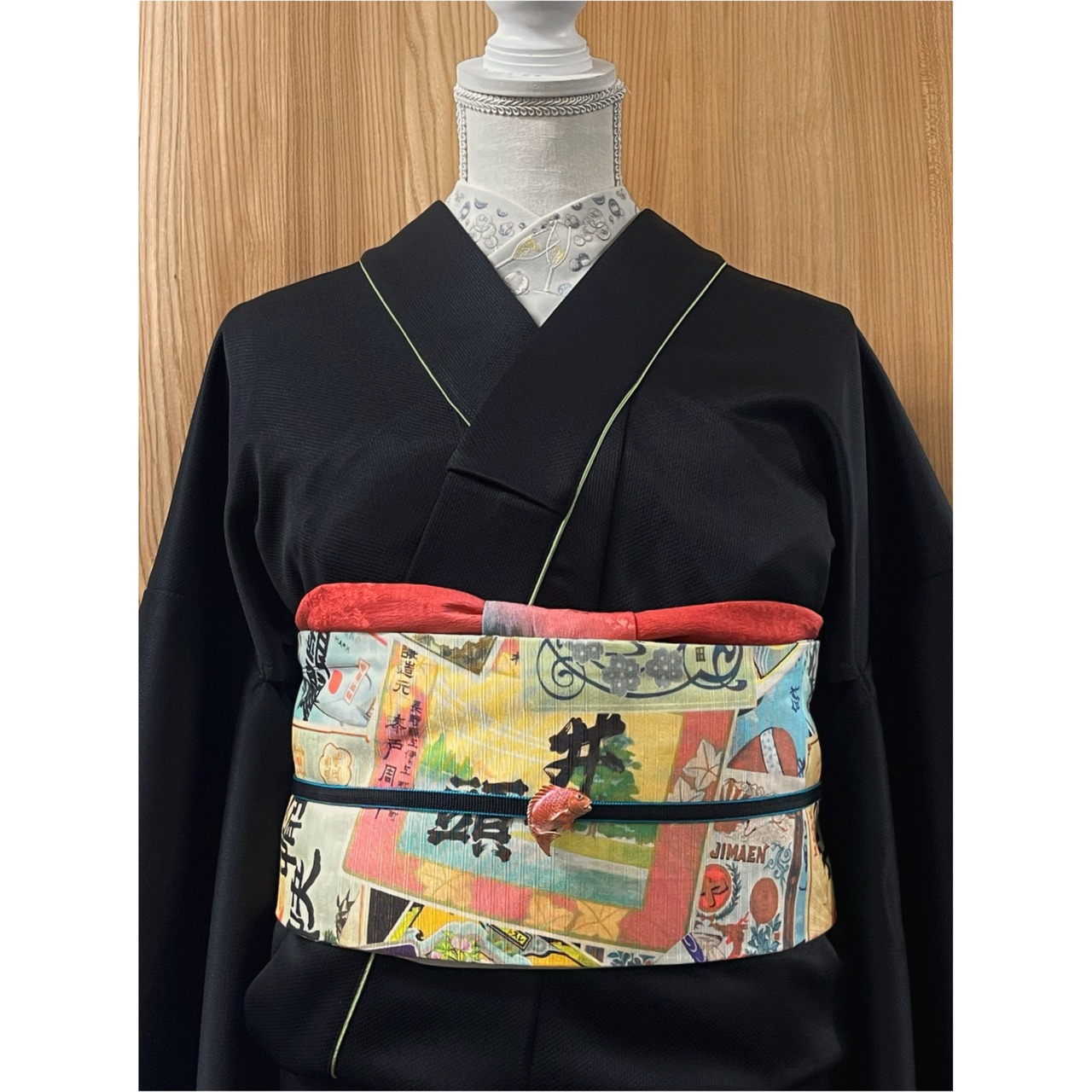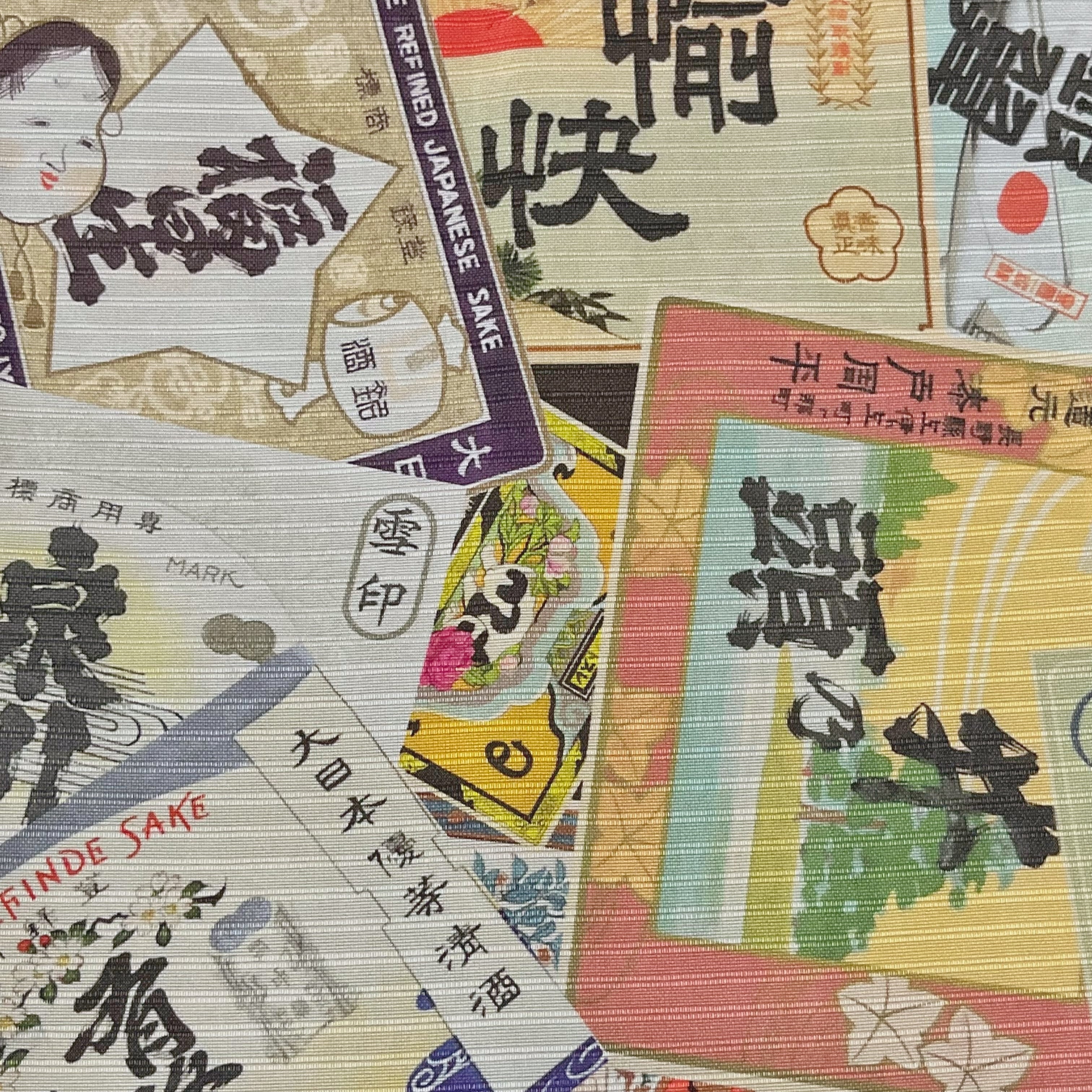 日本酒のラベルをコラージュしたようなデザインの帯芯のない柔らかなお仕立ての
