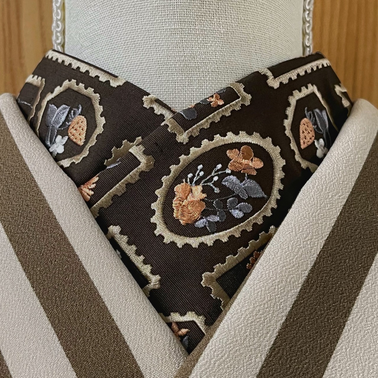 【新品】花柄の切手模様 刺繍半衿(チョコレートブラウン)