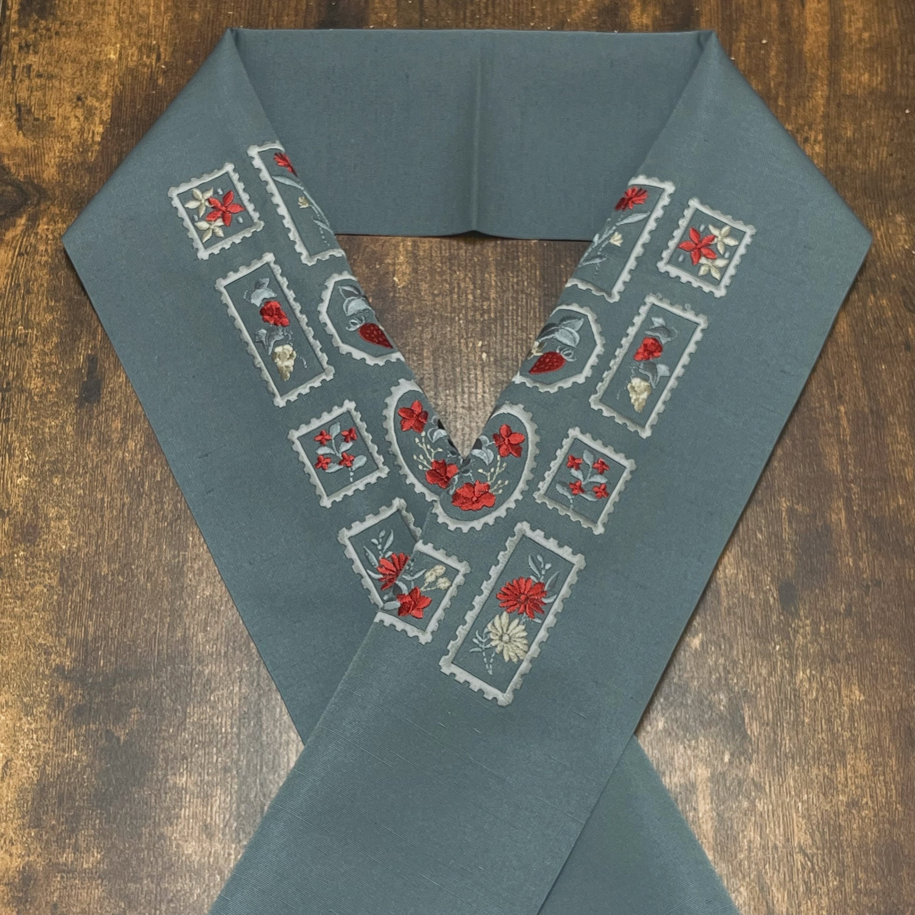 【新品】花柄の切手模様 刺繍半衿(湊鼠色)