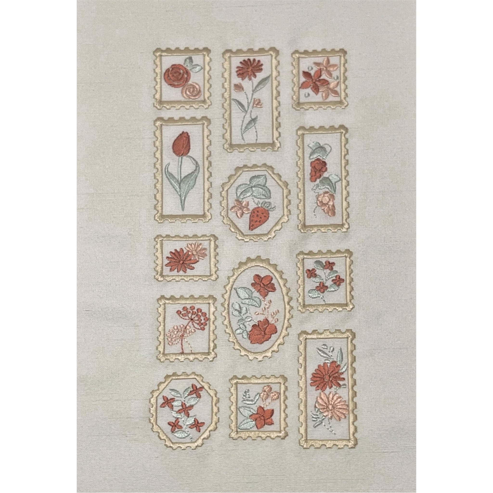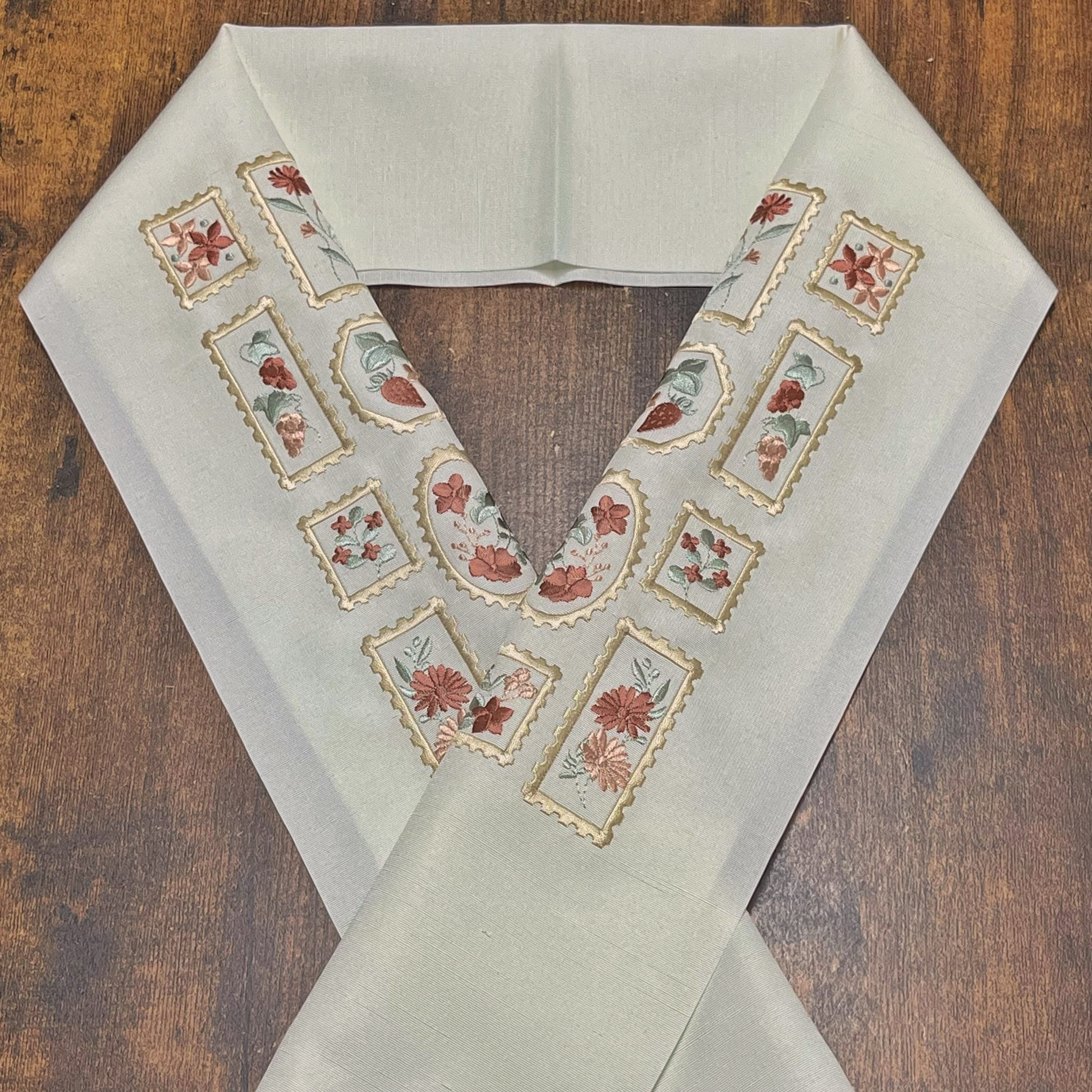 商品名:花柄の切手模様 刺繍半衿(水柿色)