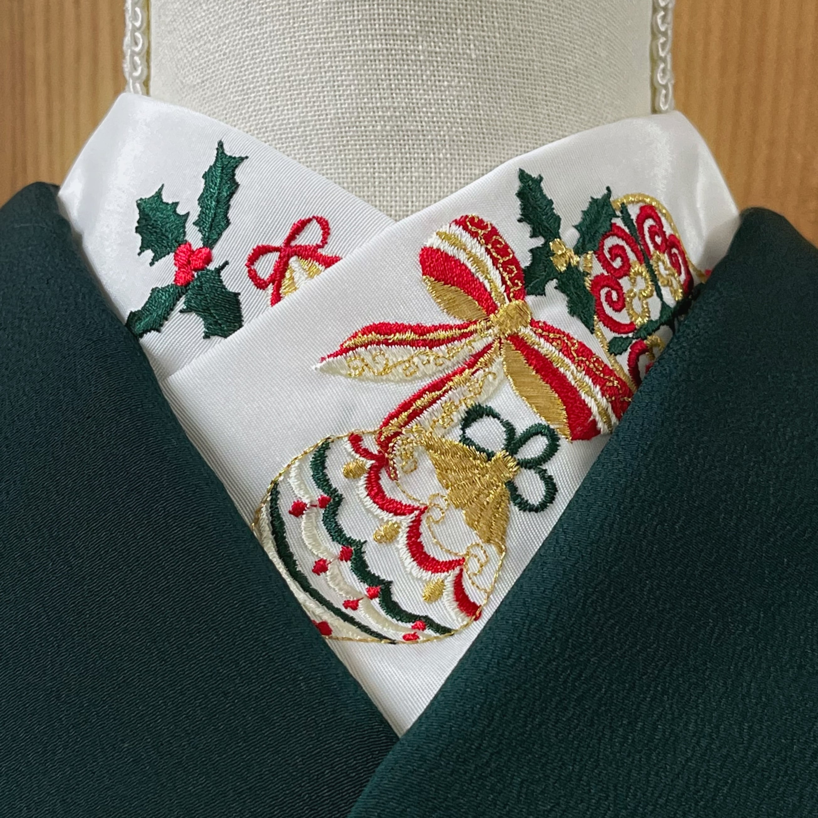 柊やリボン、ベル等のクリスマスオーナメント柄が刺繍された華やかで可愛らしい半衿です☺︎