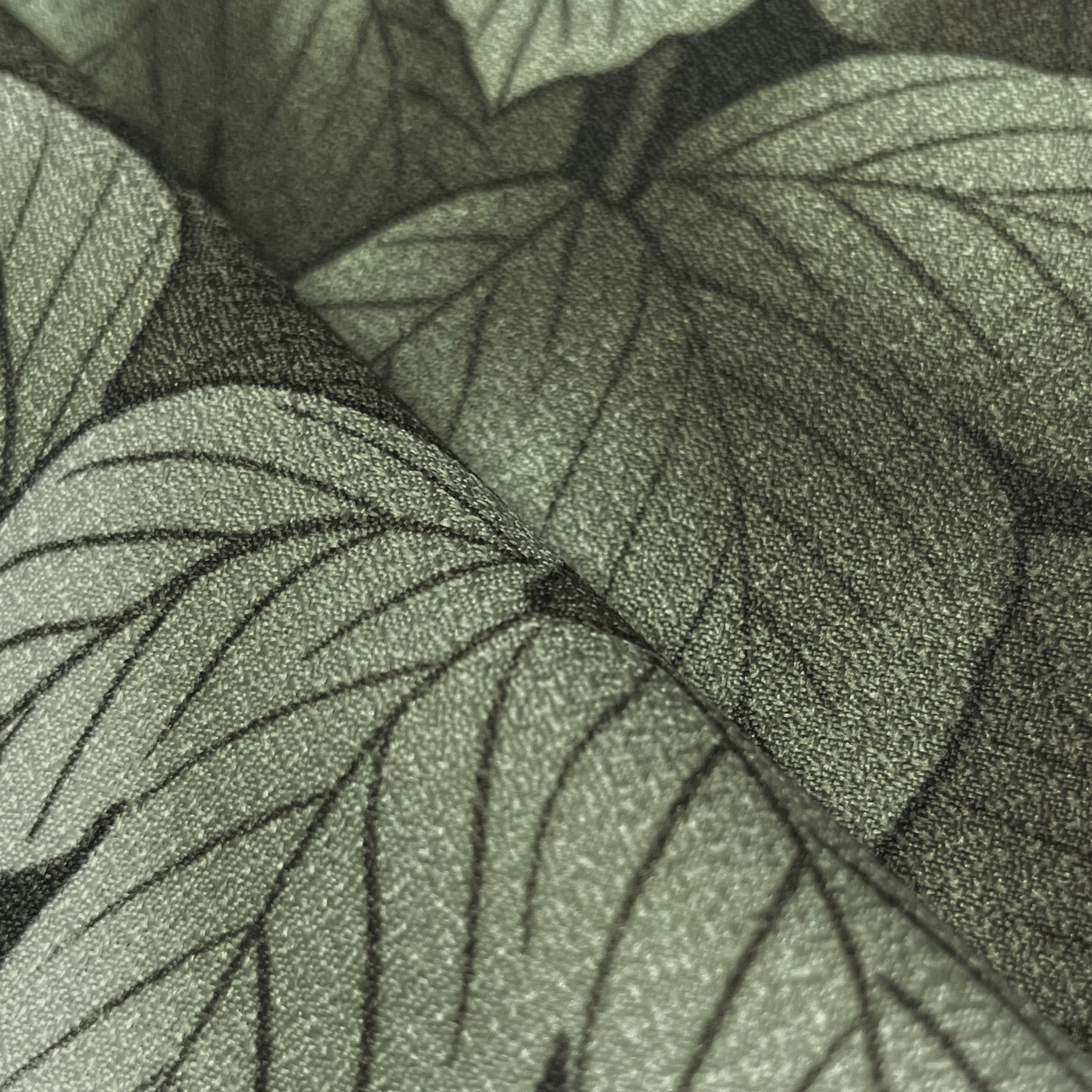 ライトグレーから柳煤竹色(やなぎすすたけ色:灰色みがかった暗い黄緑色)へのぼかしを効かせた枝葉模様がデザインされた