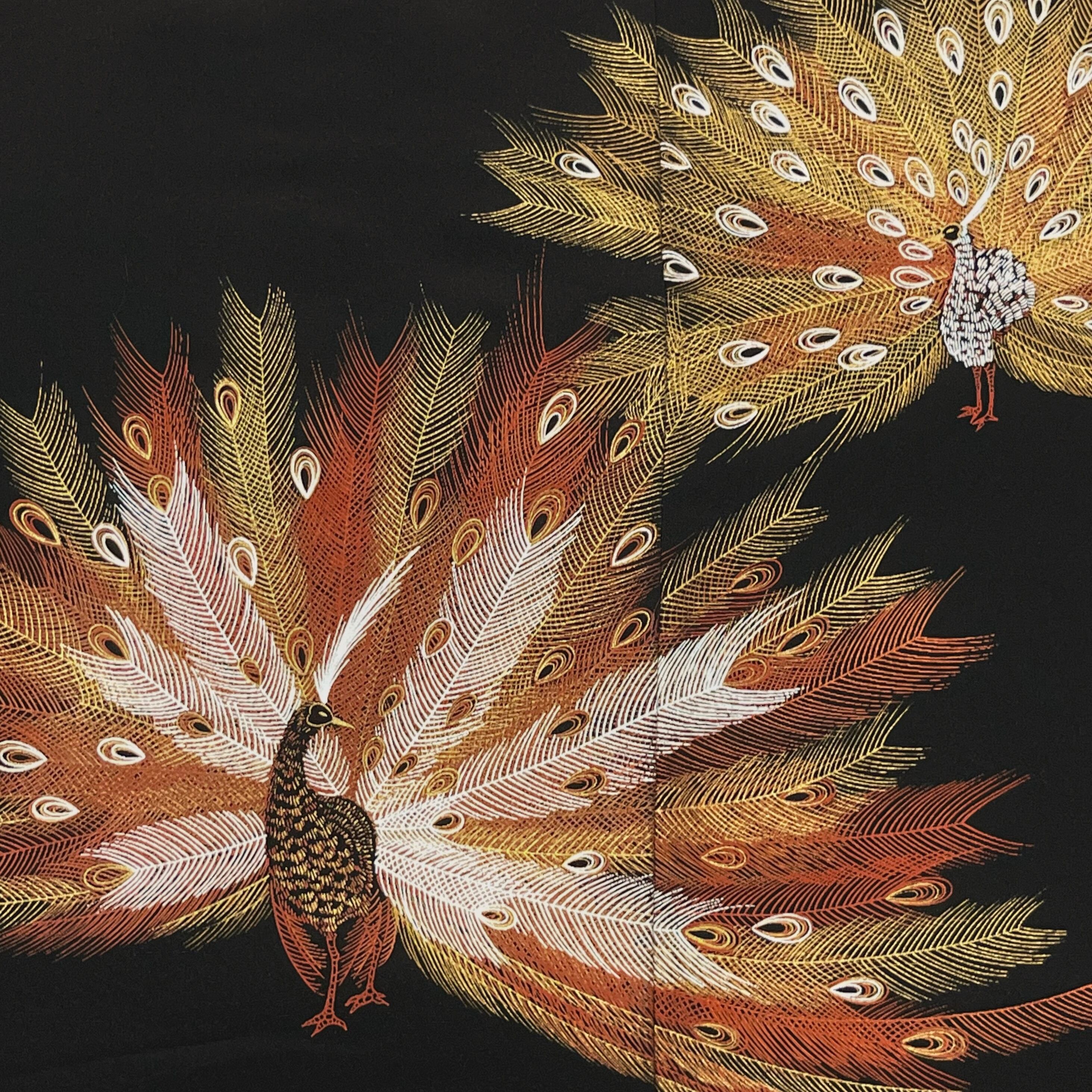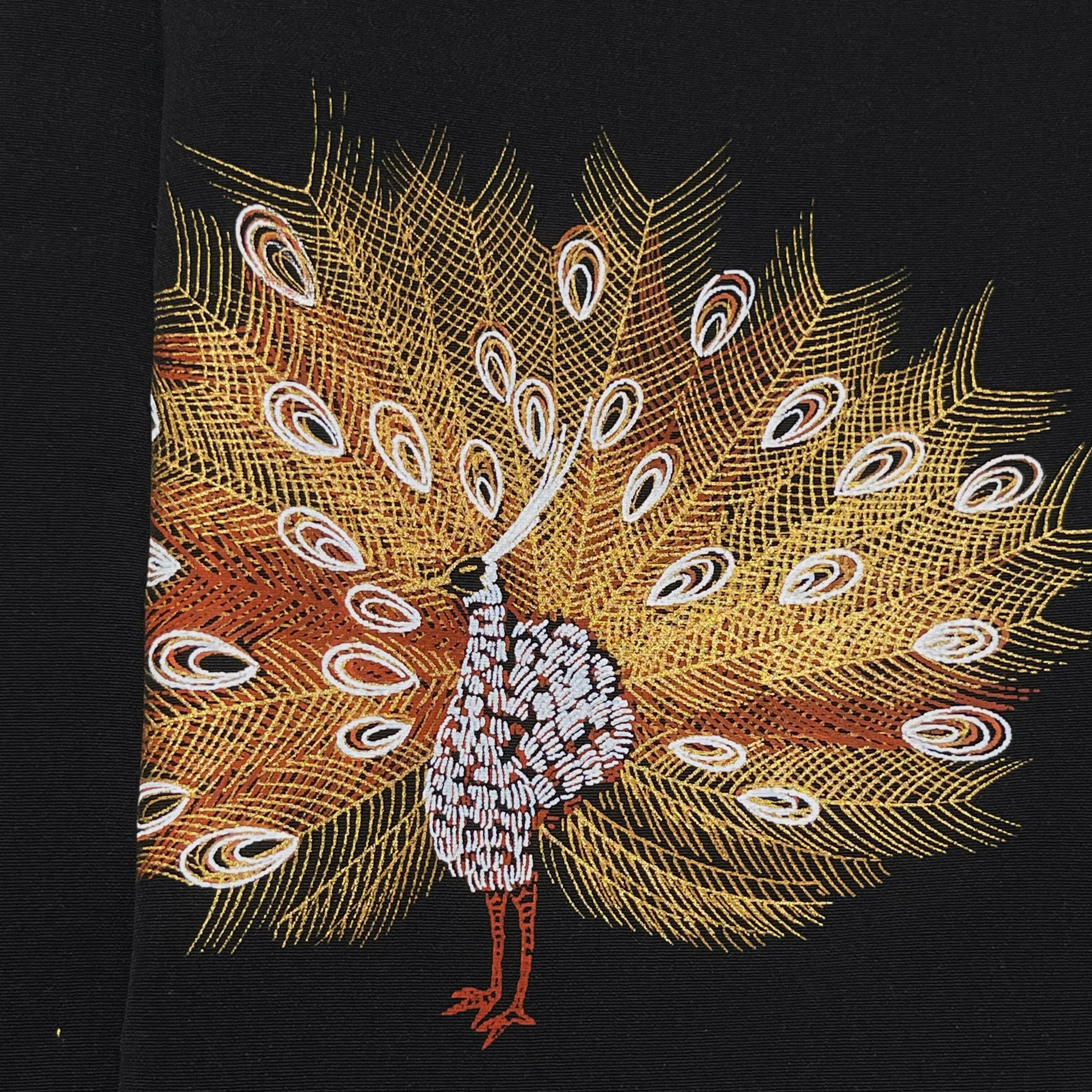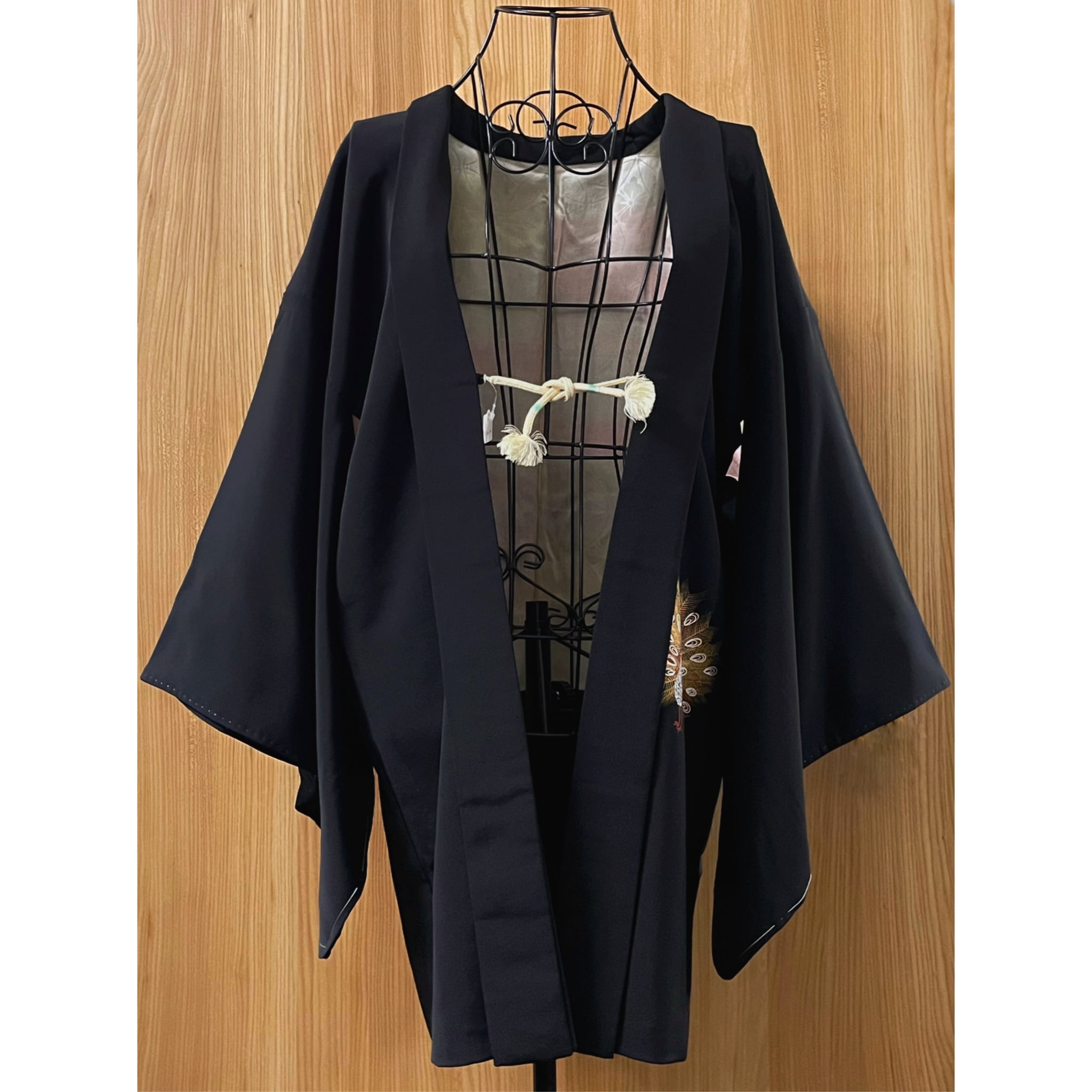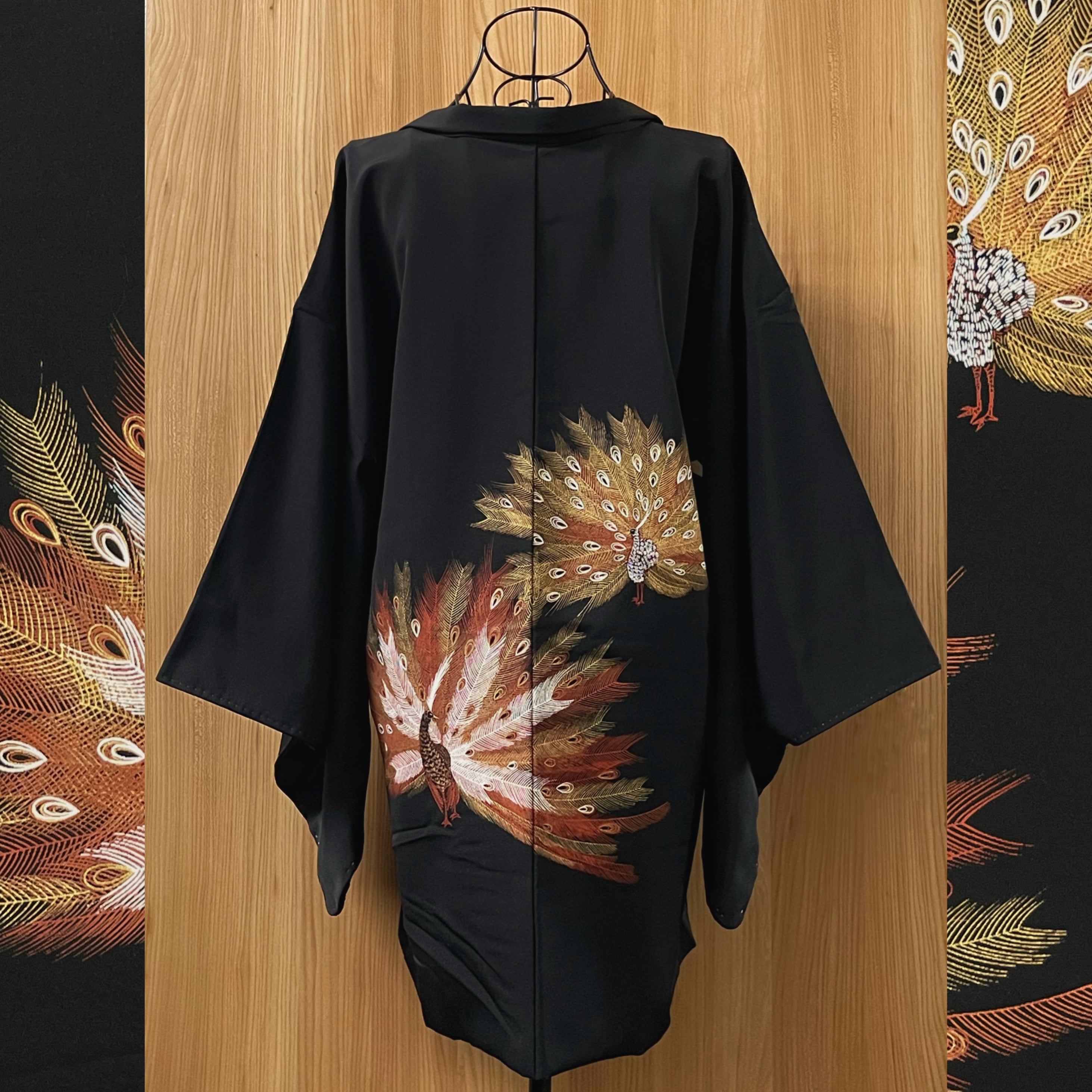 白色、赤褐色、金色の孔雀文様がデザインされた華やかで格好良い羽織です☺︎