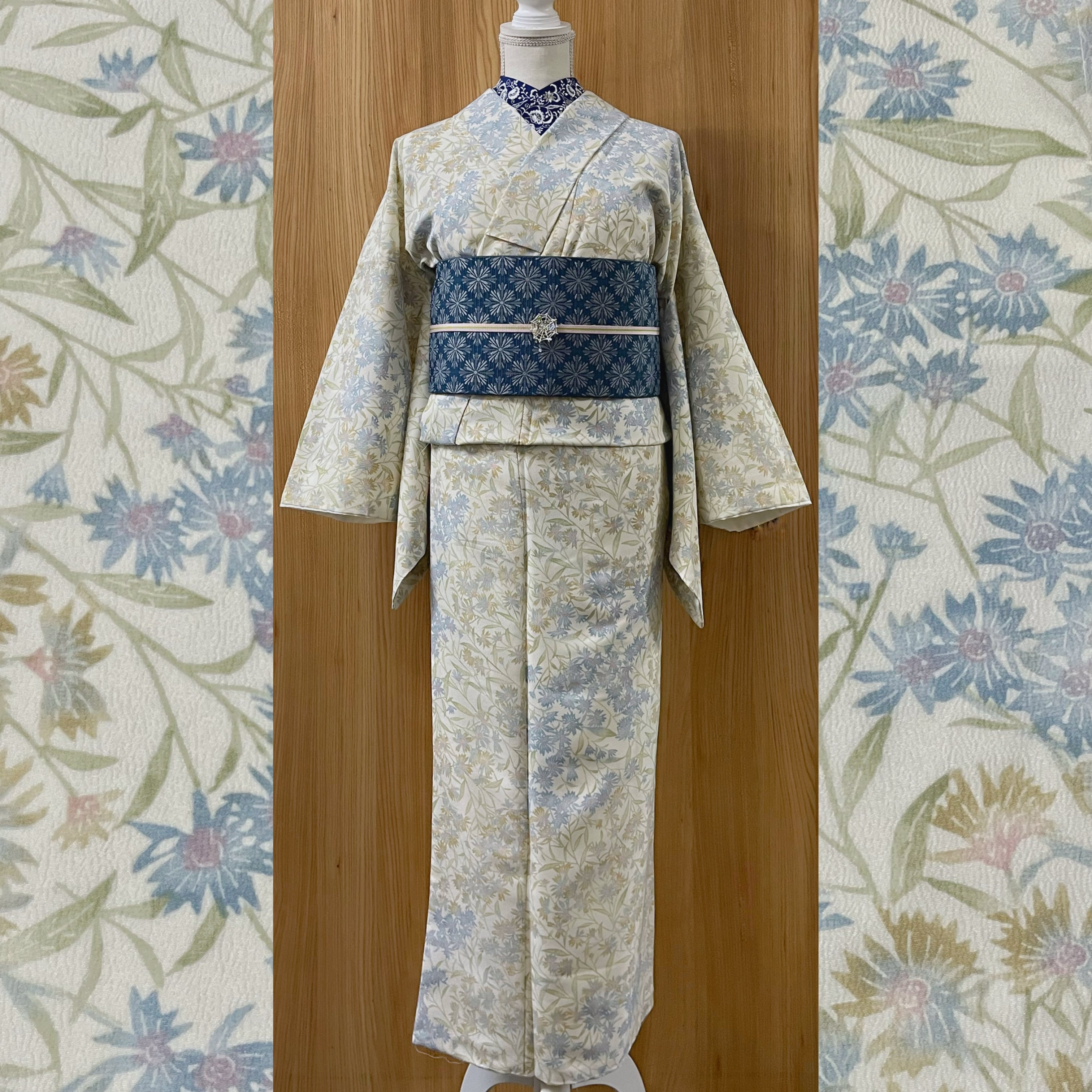 【新品】ペールトーンの草花模様 縮緬地洗える小紋着物