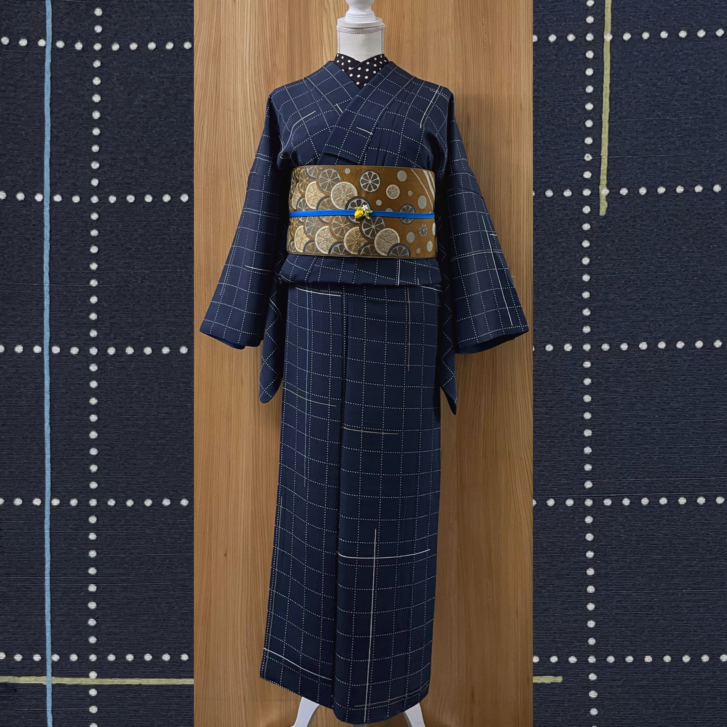 ・商品名:「ネイビーブルーに縦横ライン・ドット格子模様の小紋着物」