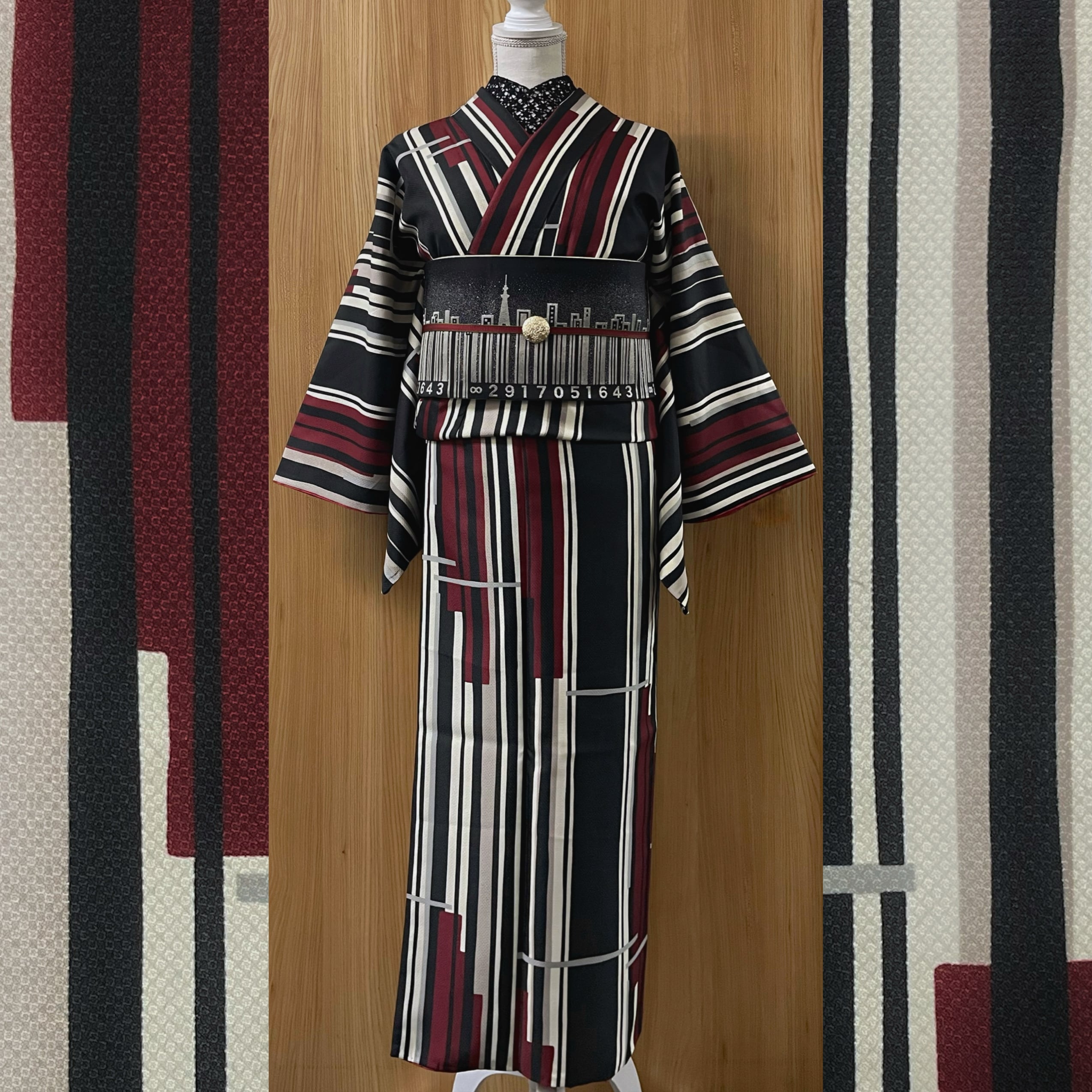 ・商品名:「ボルドーカラー×モノトーンの変わりストライプ洗える小紋着物」