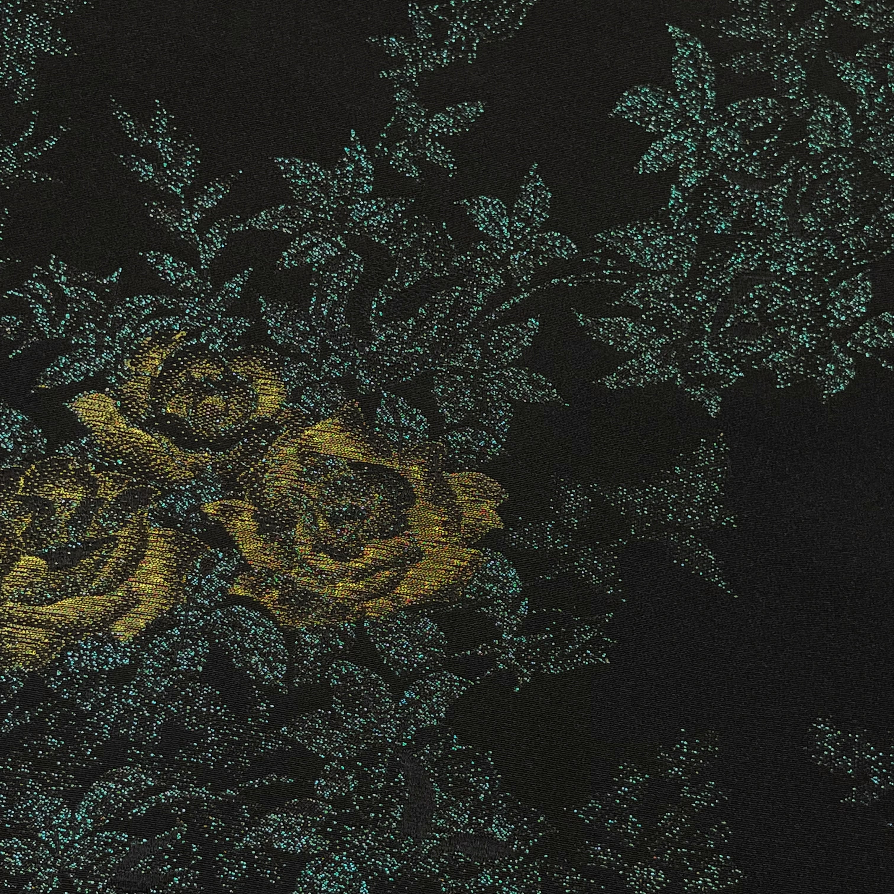 金色、グレージュ、水浅葱色(緑みの薄い青色)の金属糸を使用した薔薇模様がデザインされた華やかで美しい羽織です☺︎