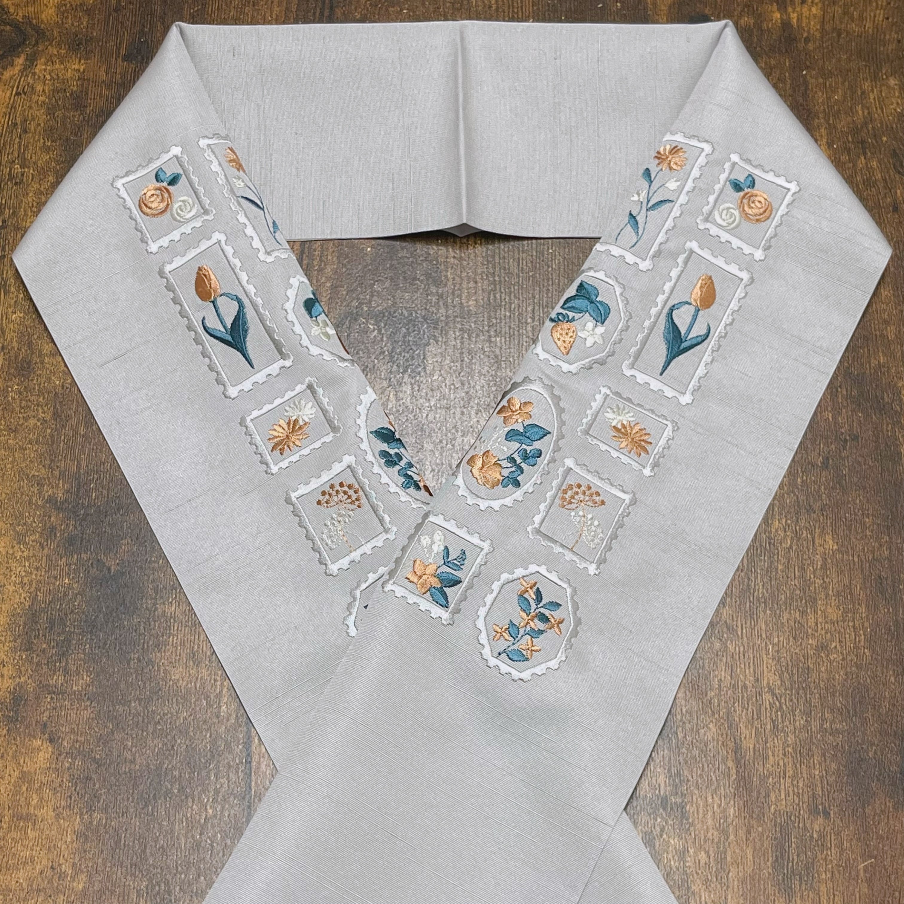 ライトグレーの縁取りの切手模様が刺繍された洋風で可愛らしい半衿です☺︎