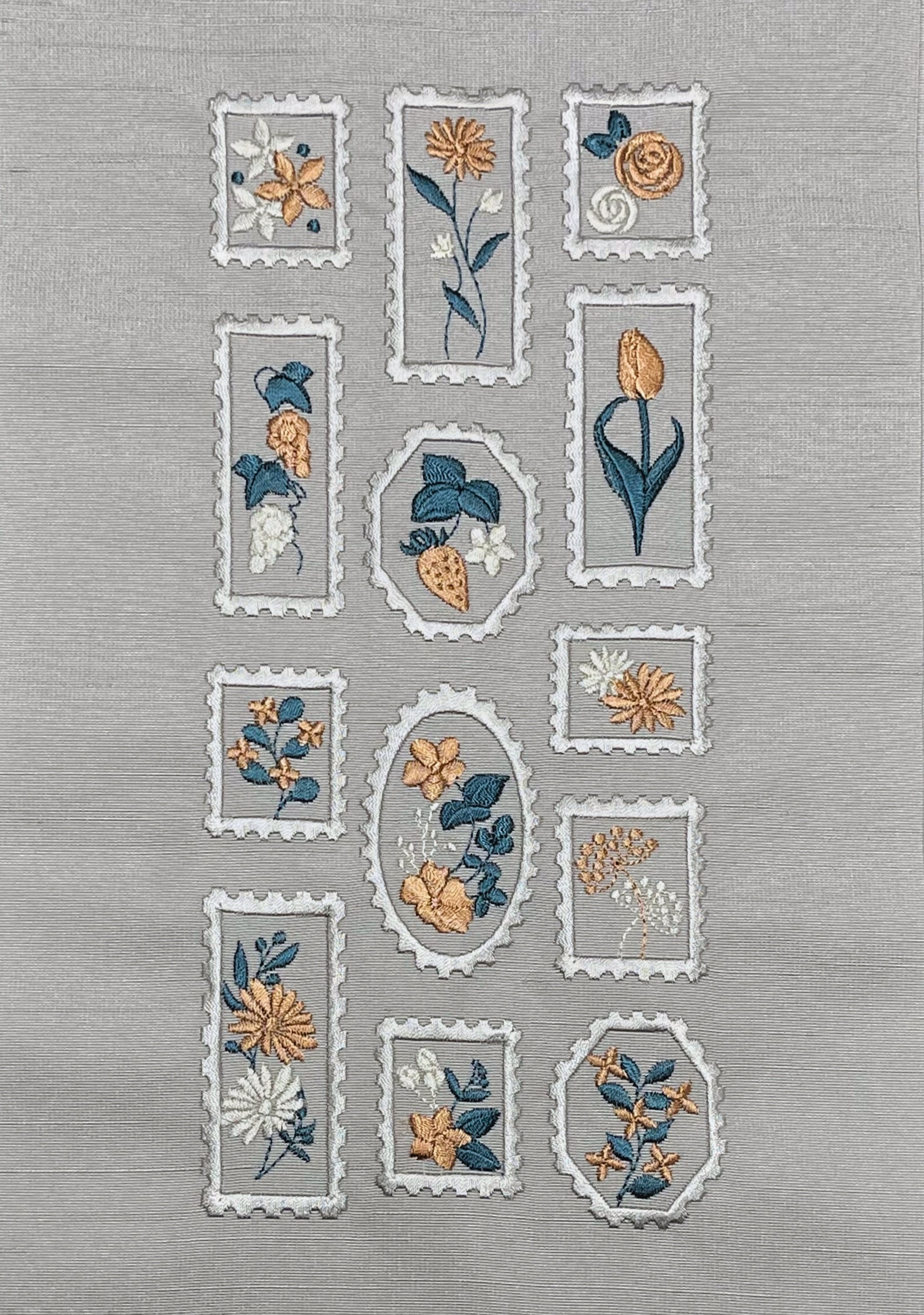 商品名:花柄の切手模様 刺繍半衿(白梅鼠色)