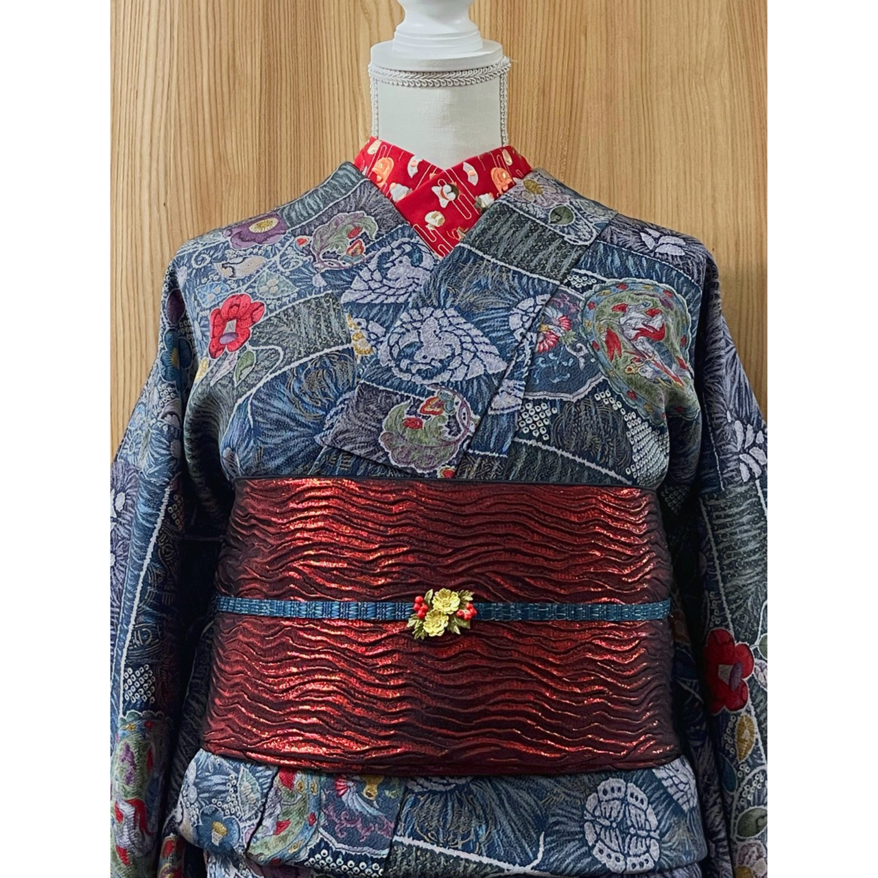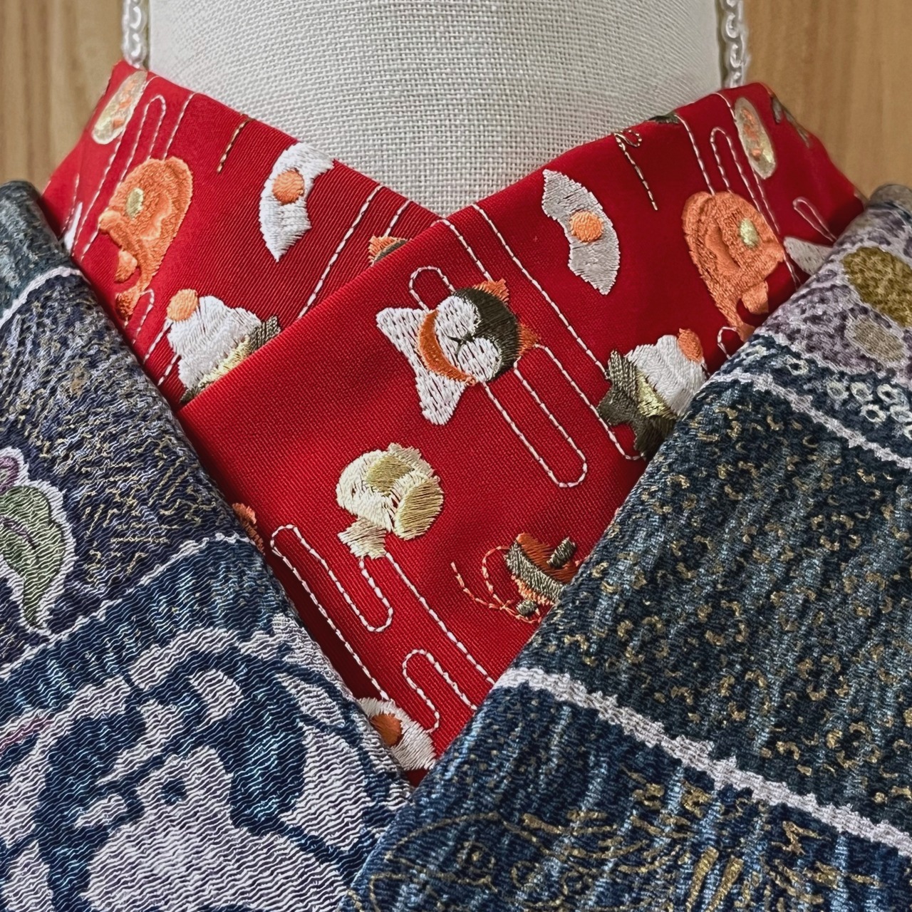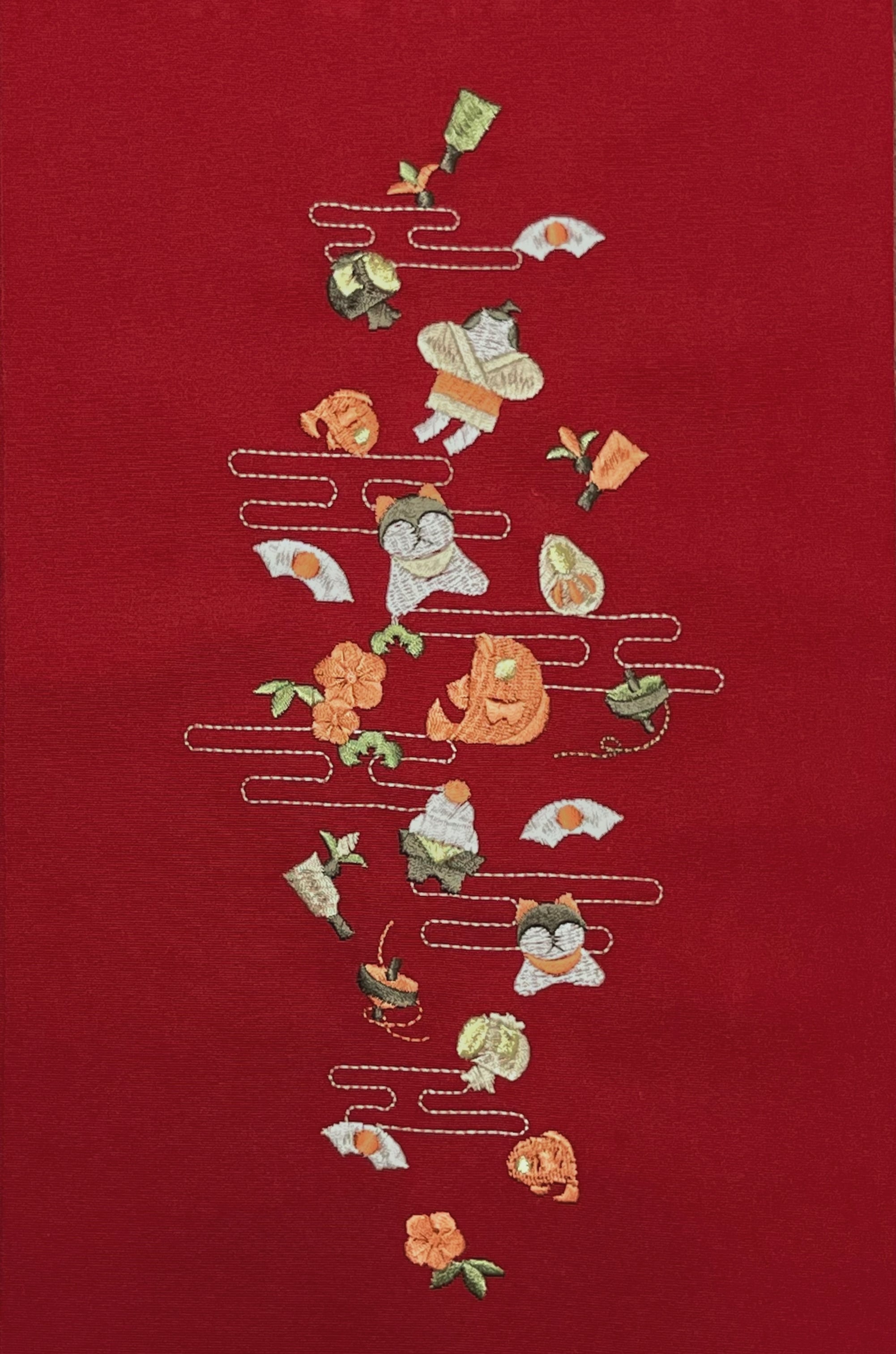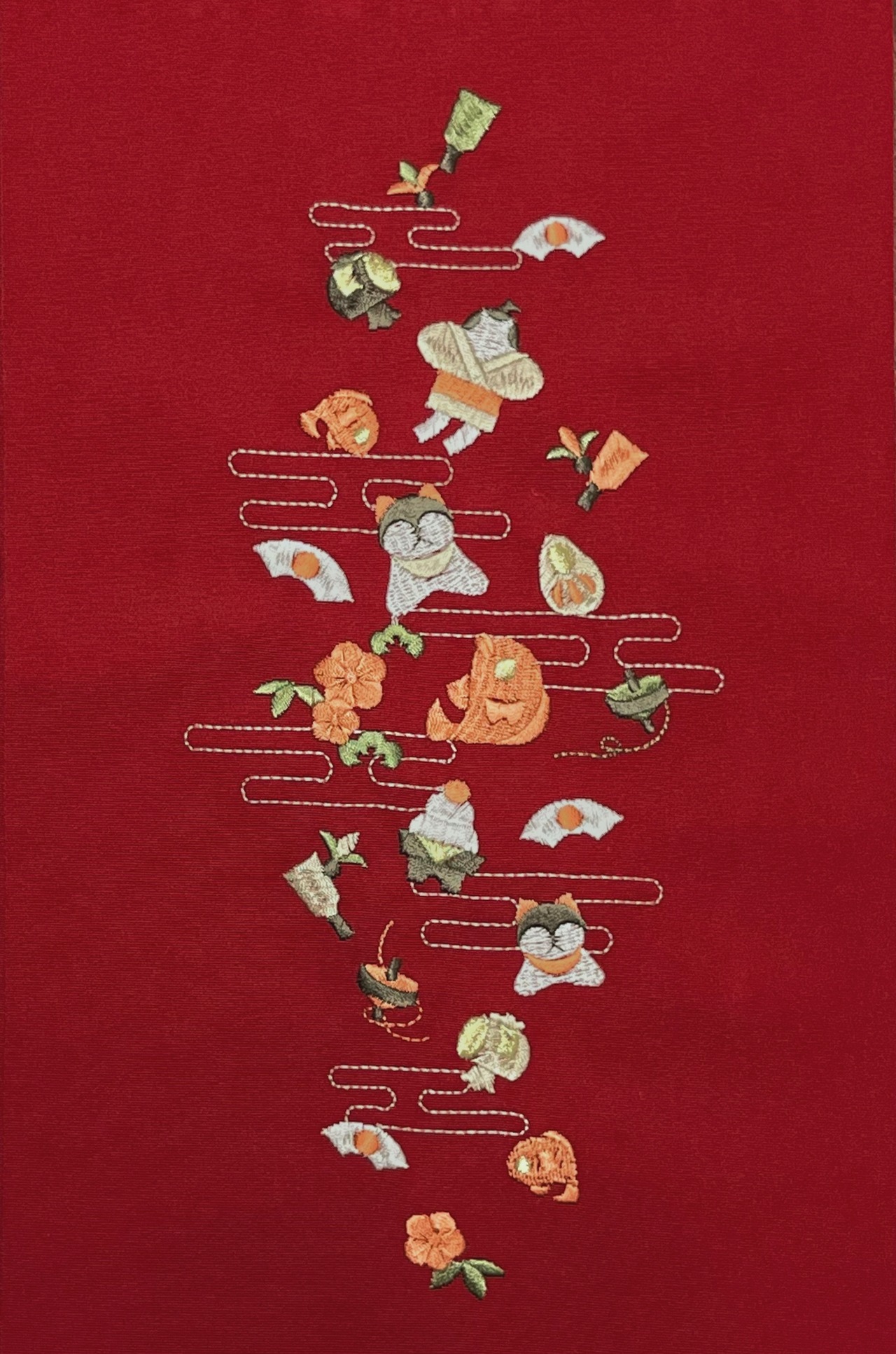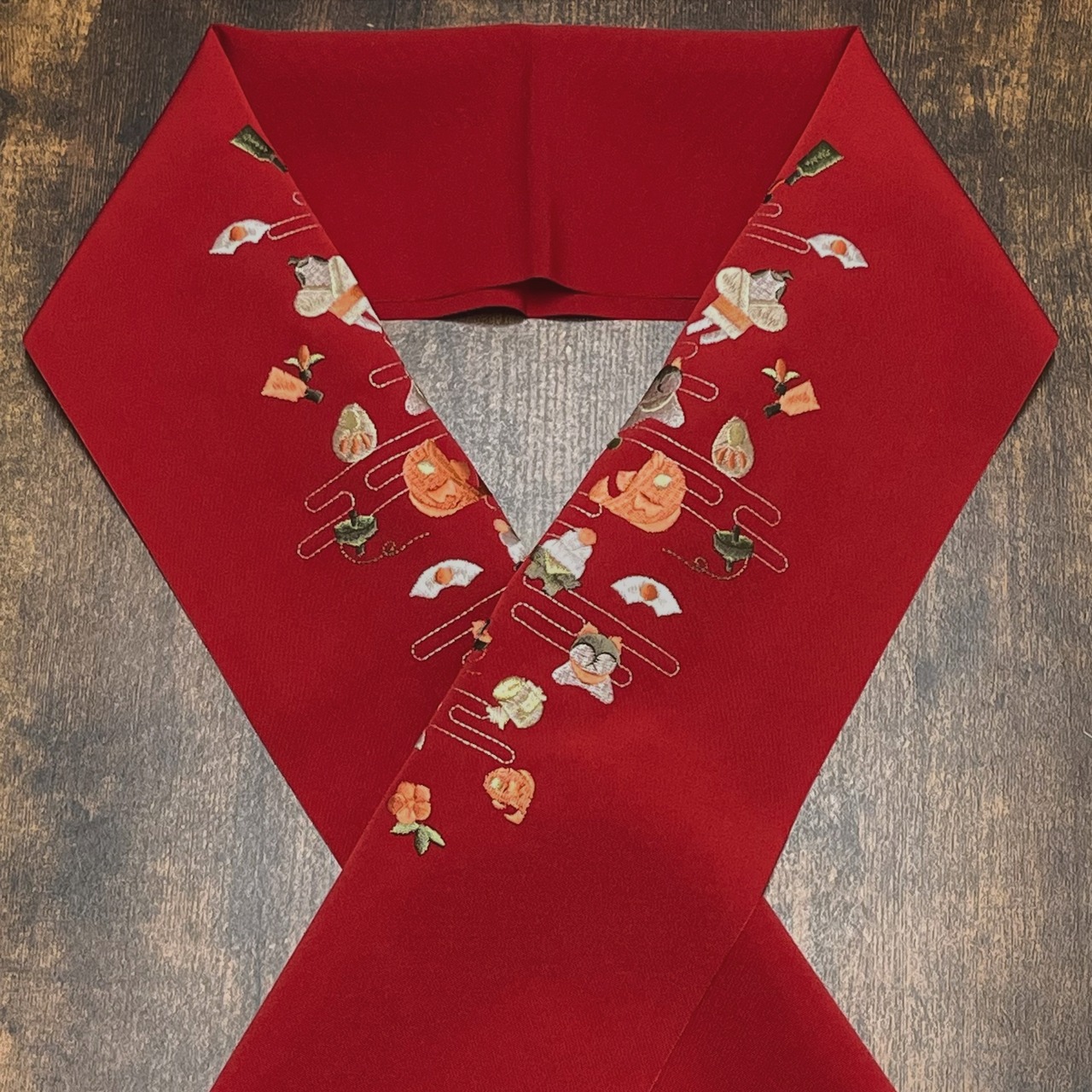 エ霞に鏡餅や羽子板、鯛、松竹梅、打ち出の小槌、郷土玩具が刺繍された華やかで可愛らしい半衿です☺︎