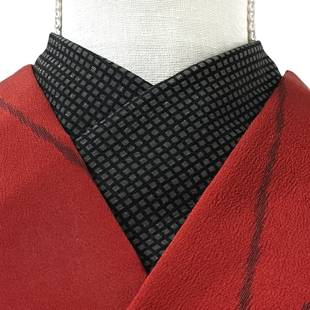 色・質感:格子状の織柄が入った鈍色(鈍いグレー)の生地に黒色の格子柄がデザインされた