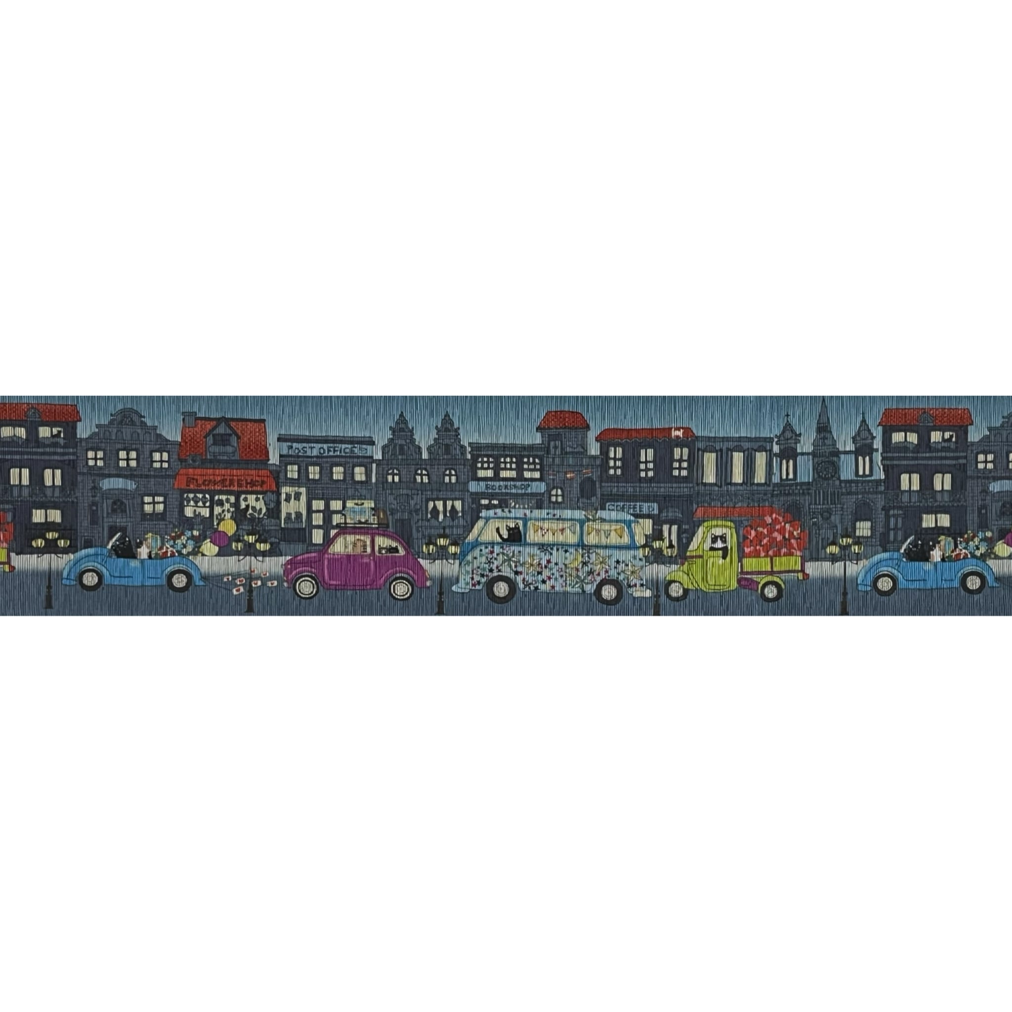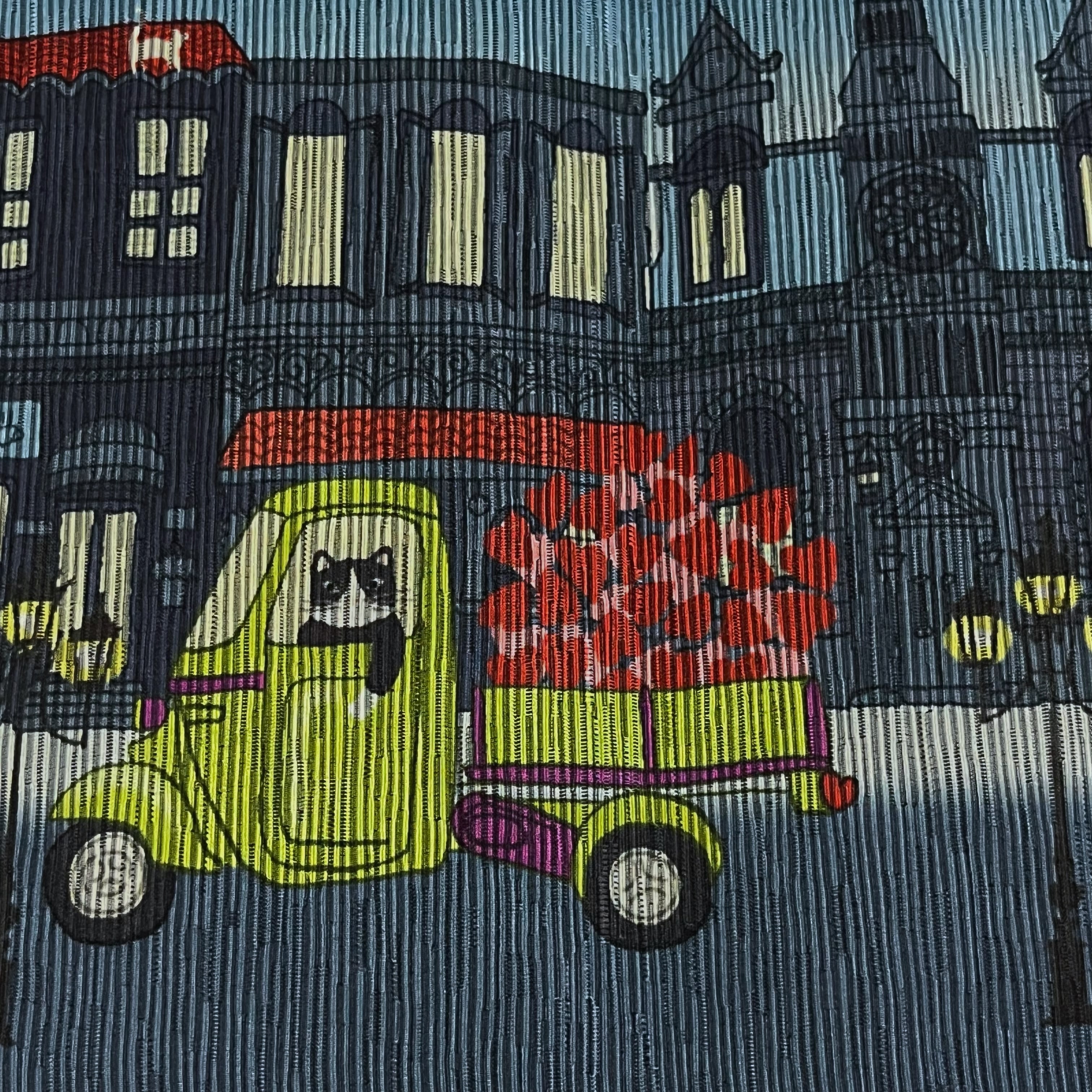 よく見ると柄は背景の建物と車との組み合わせがバラバラになるようデザインされています。