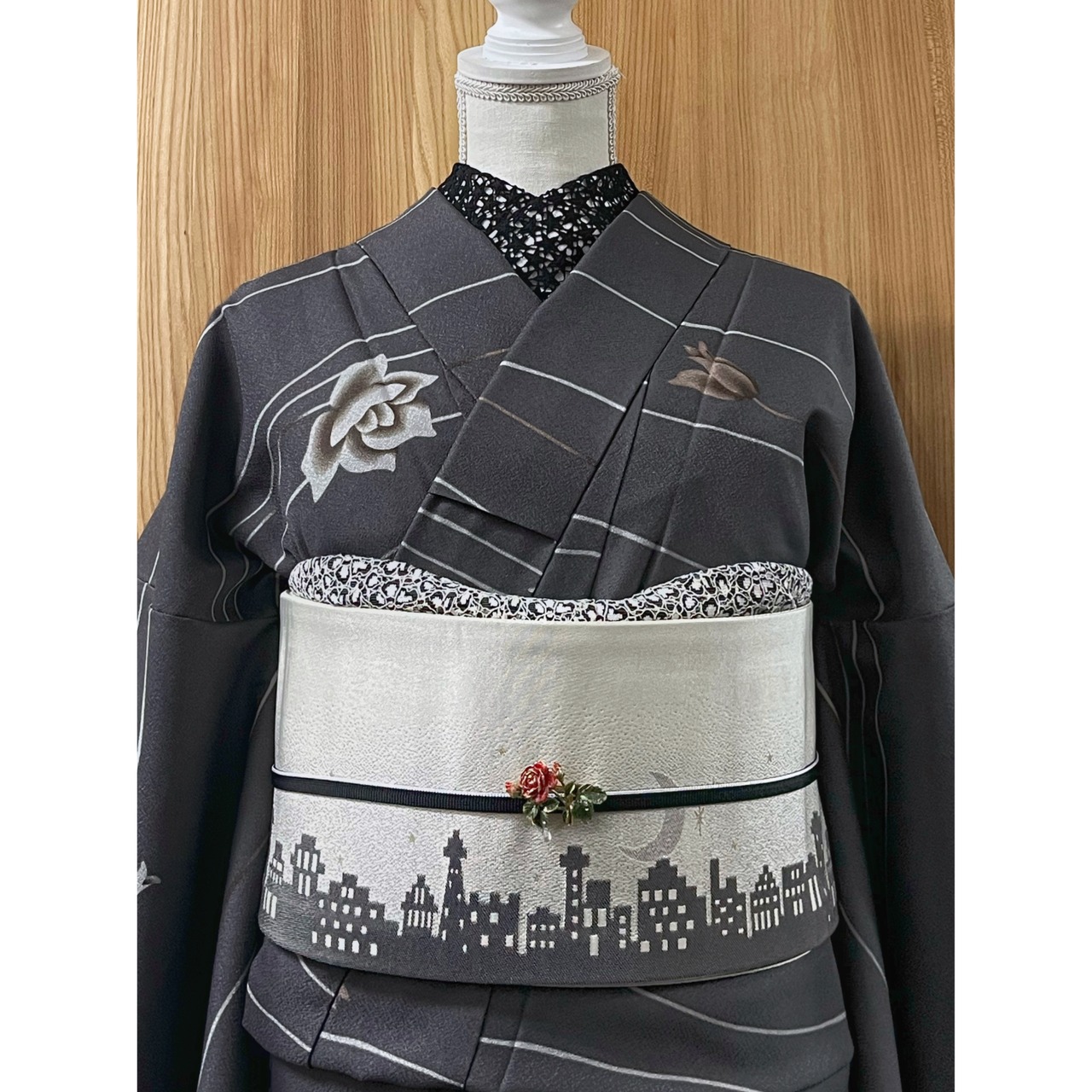 ・商品名:「よろけボーダーに抽象薔薇模様の洗える小紋着物」