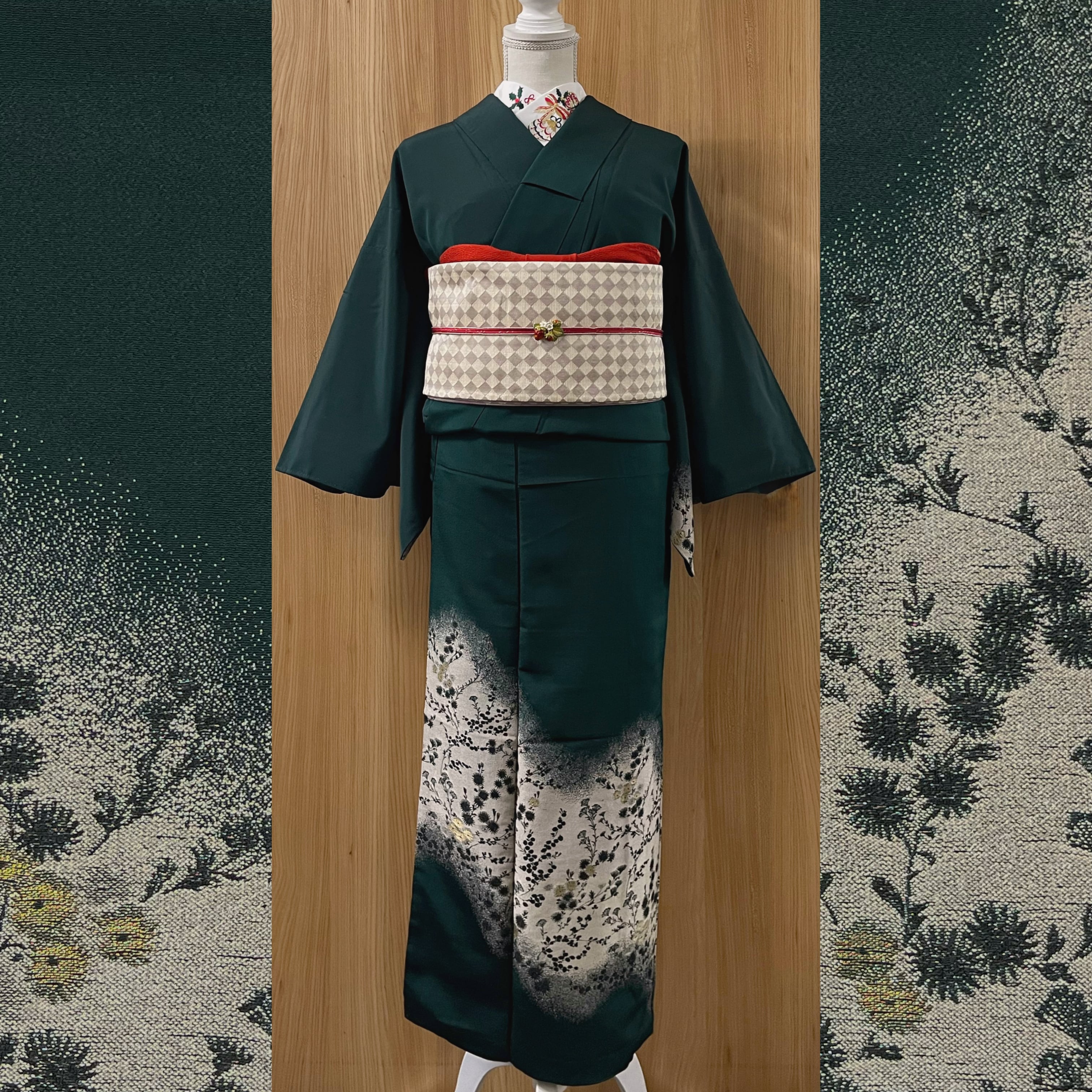 ・商品名:「ヴィンテージ 高麗納戸色に草花模様のお召着物」