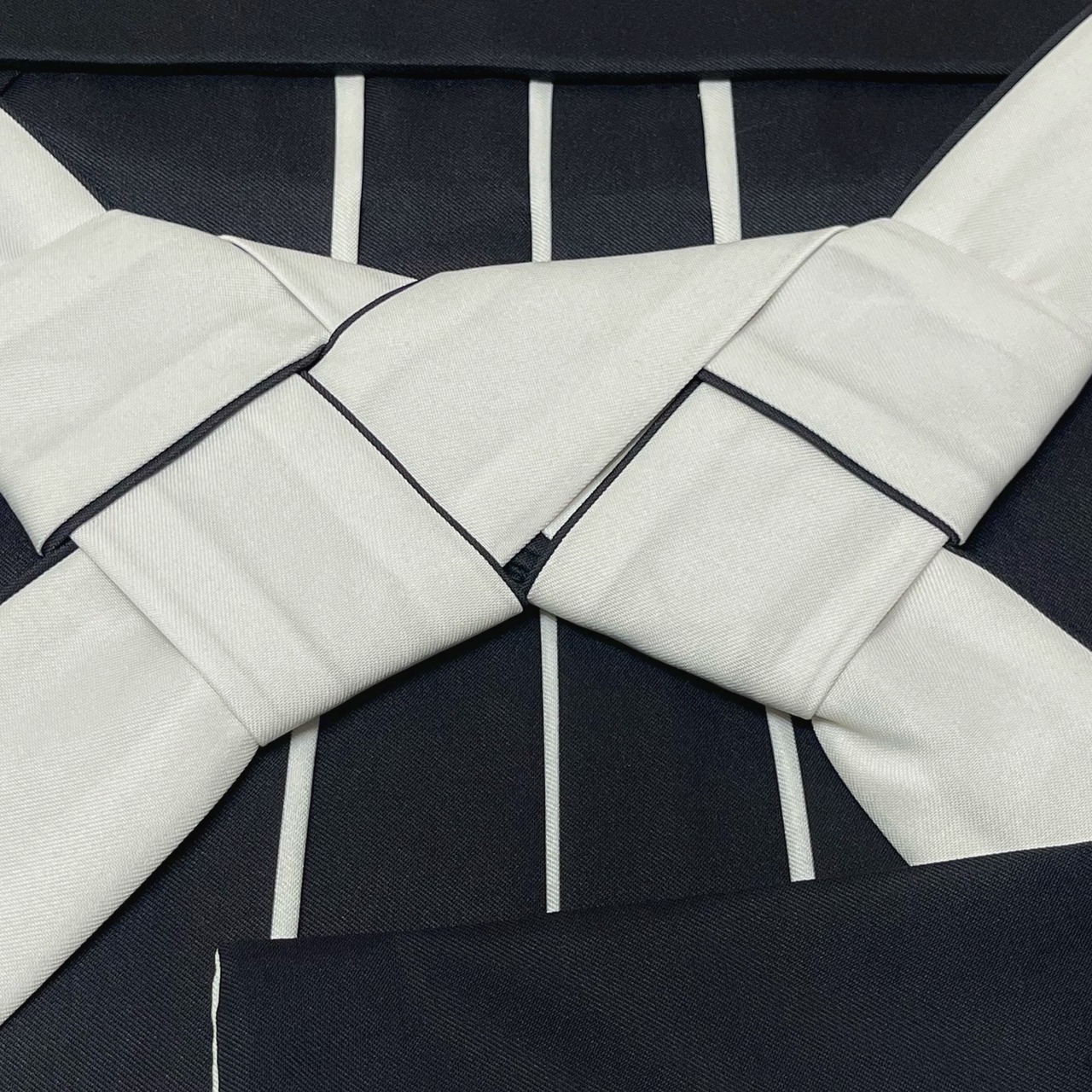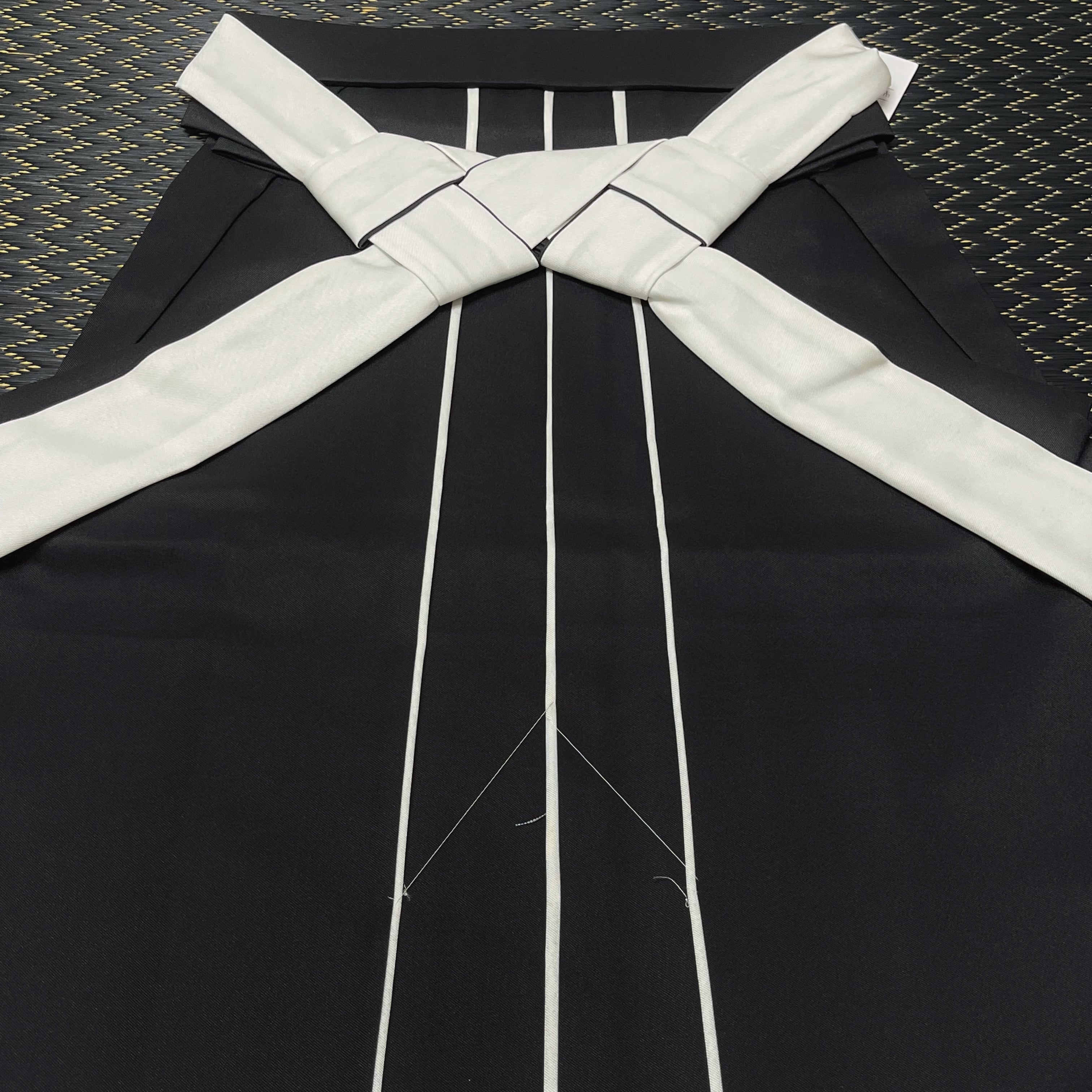 後ろ紐の表は黒色、紐裏はオフホワイトの生地を組み合わせています。