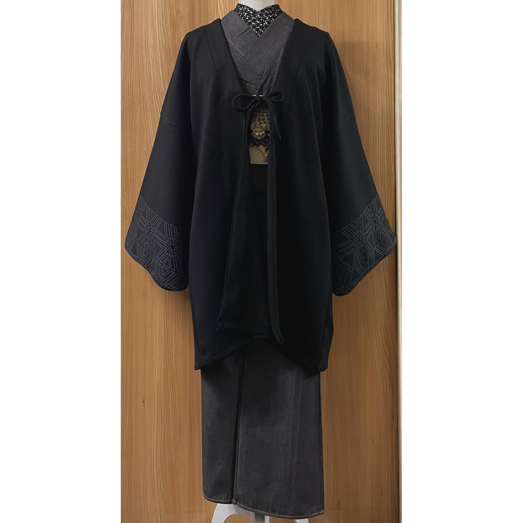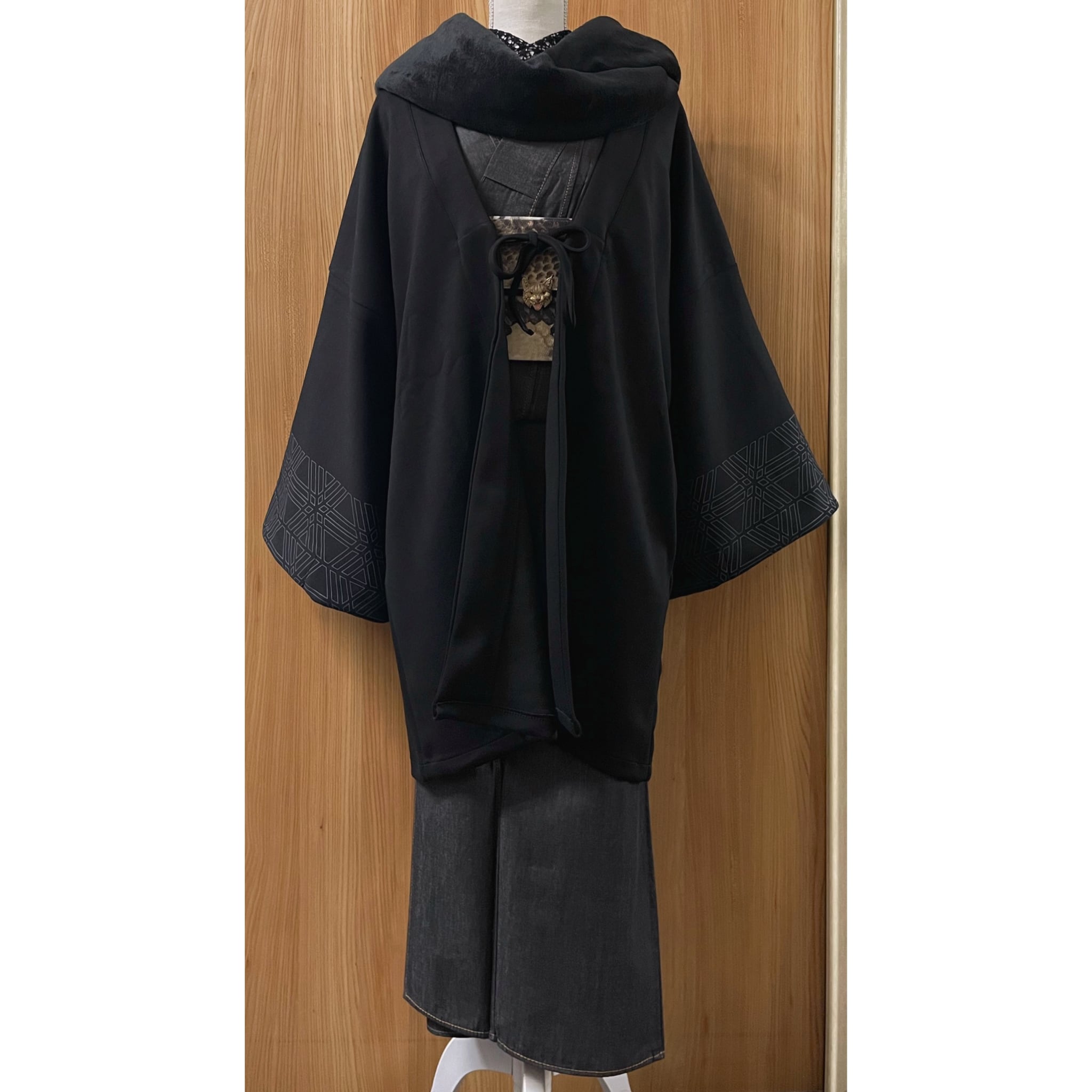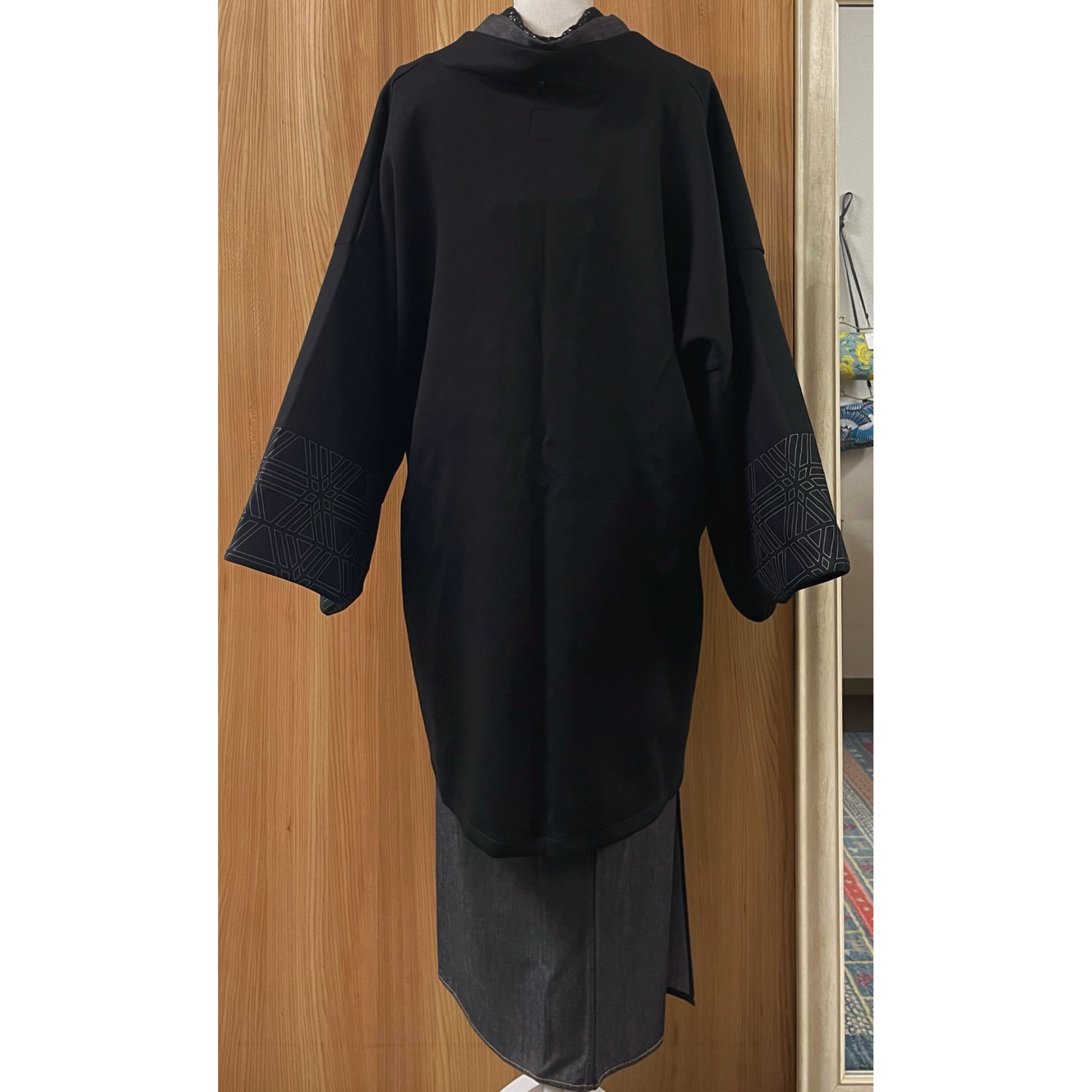 スウェット素材なさらりと柔らかな黒色のコートの袖口には伝統木工技術「組子」文様をテキスタイル落とし込んでいます。