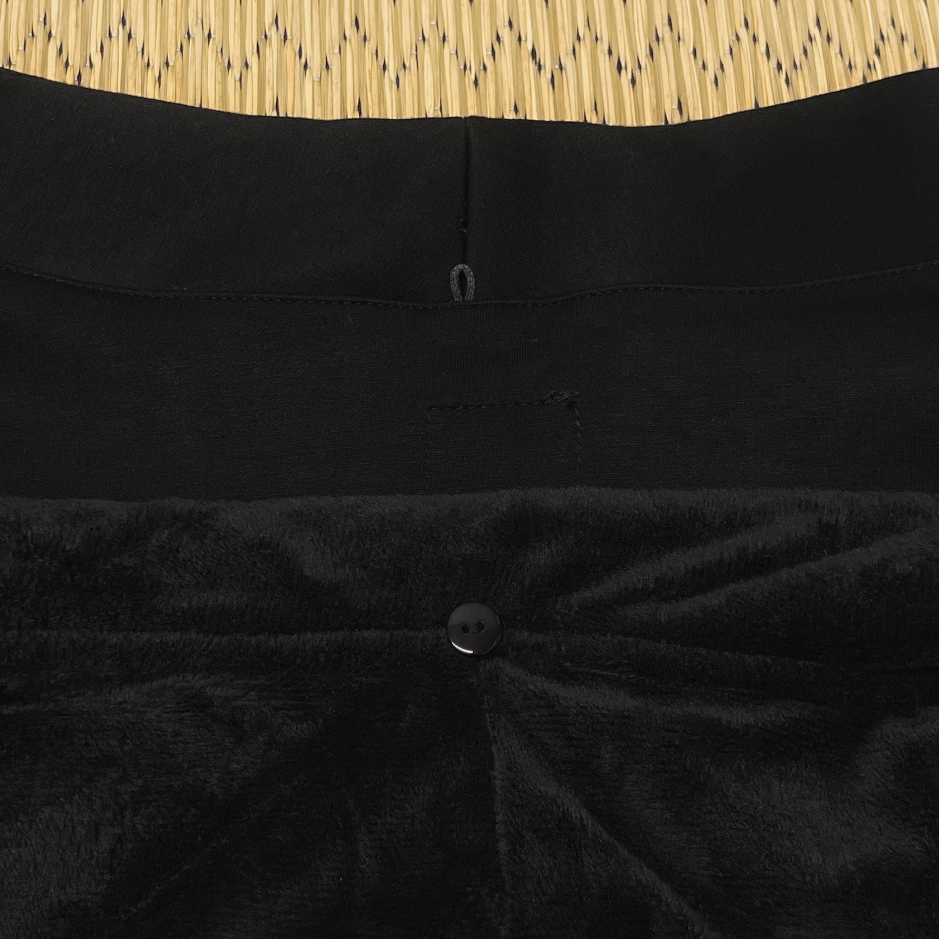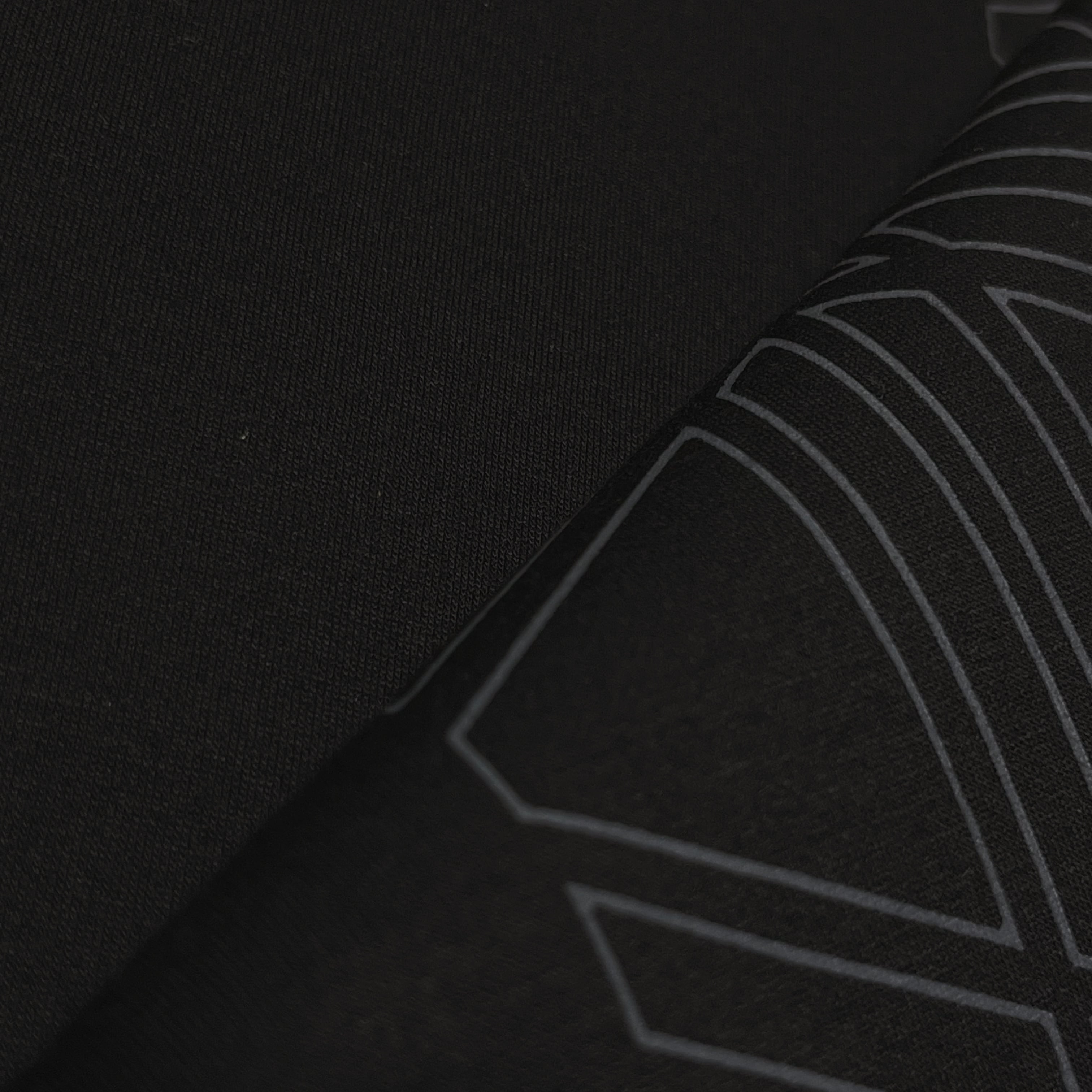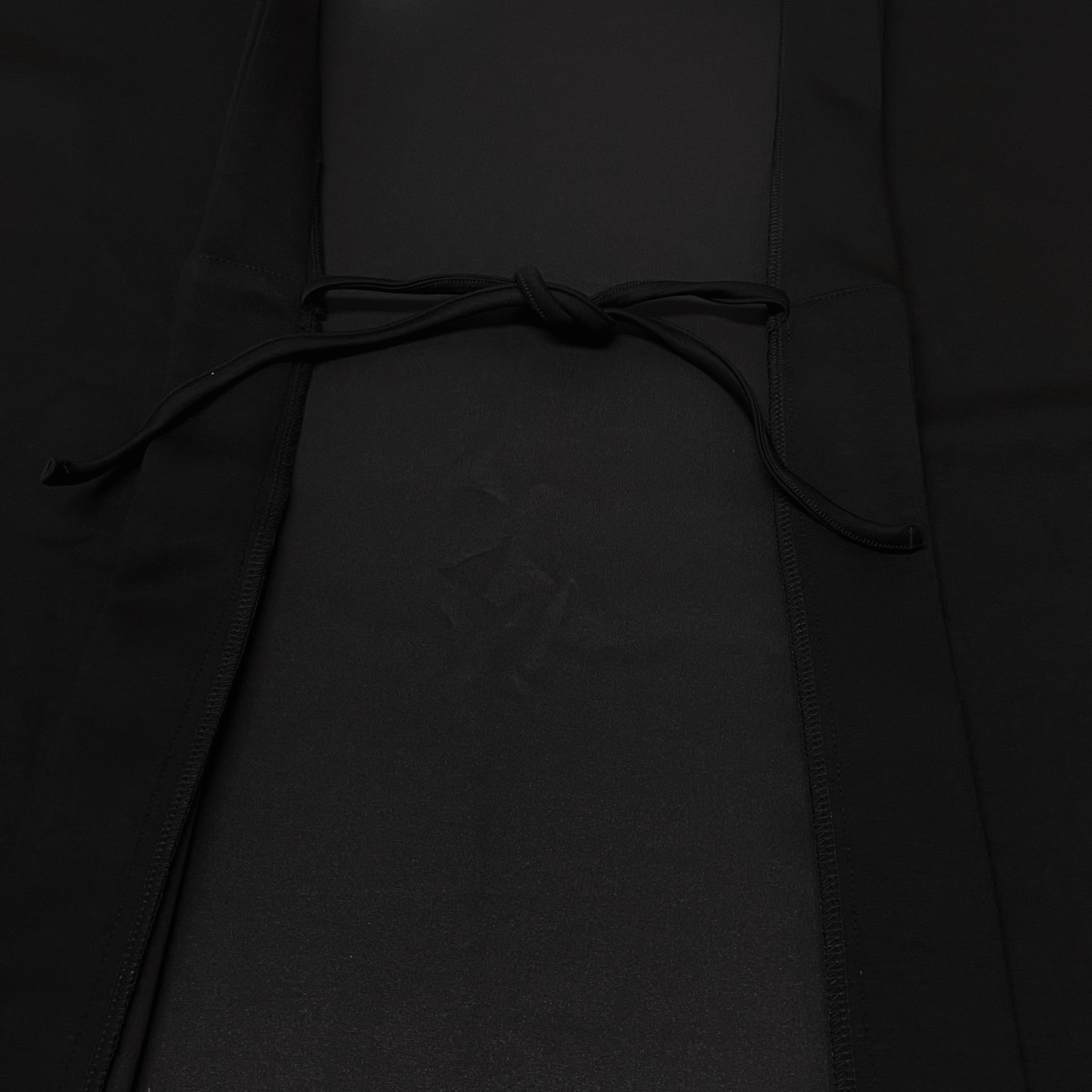 スウェット素材なさらりと柔らかな黒色のコートの袖口には伝統木工技術「組子」文様をテキスタイル落とし込んでいます。
