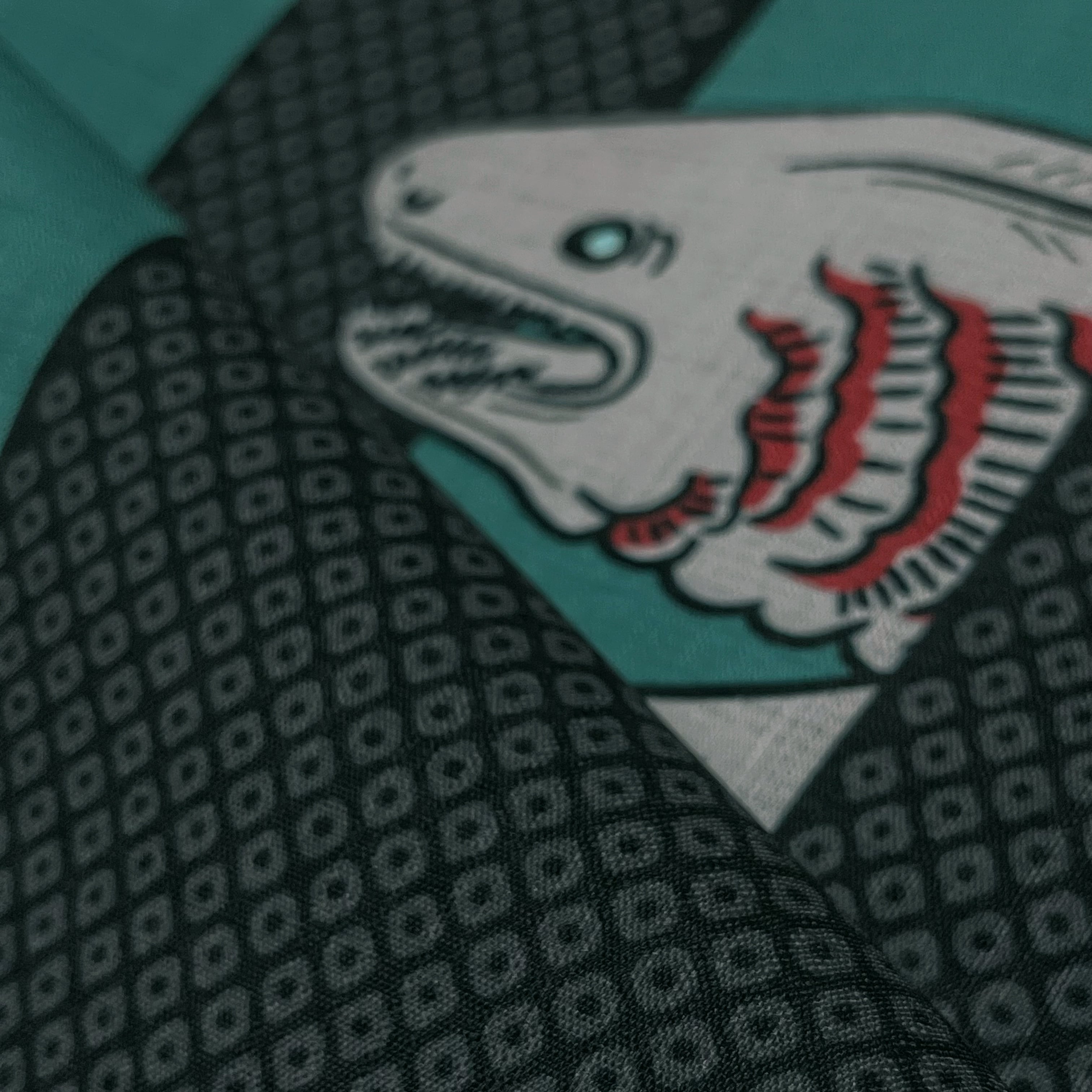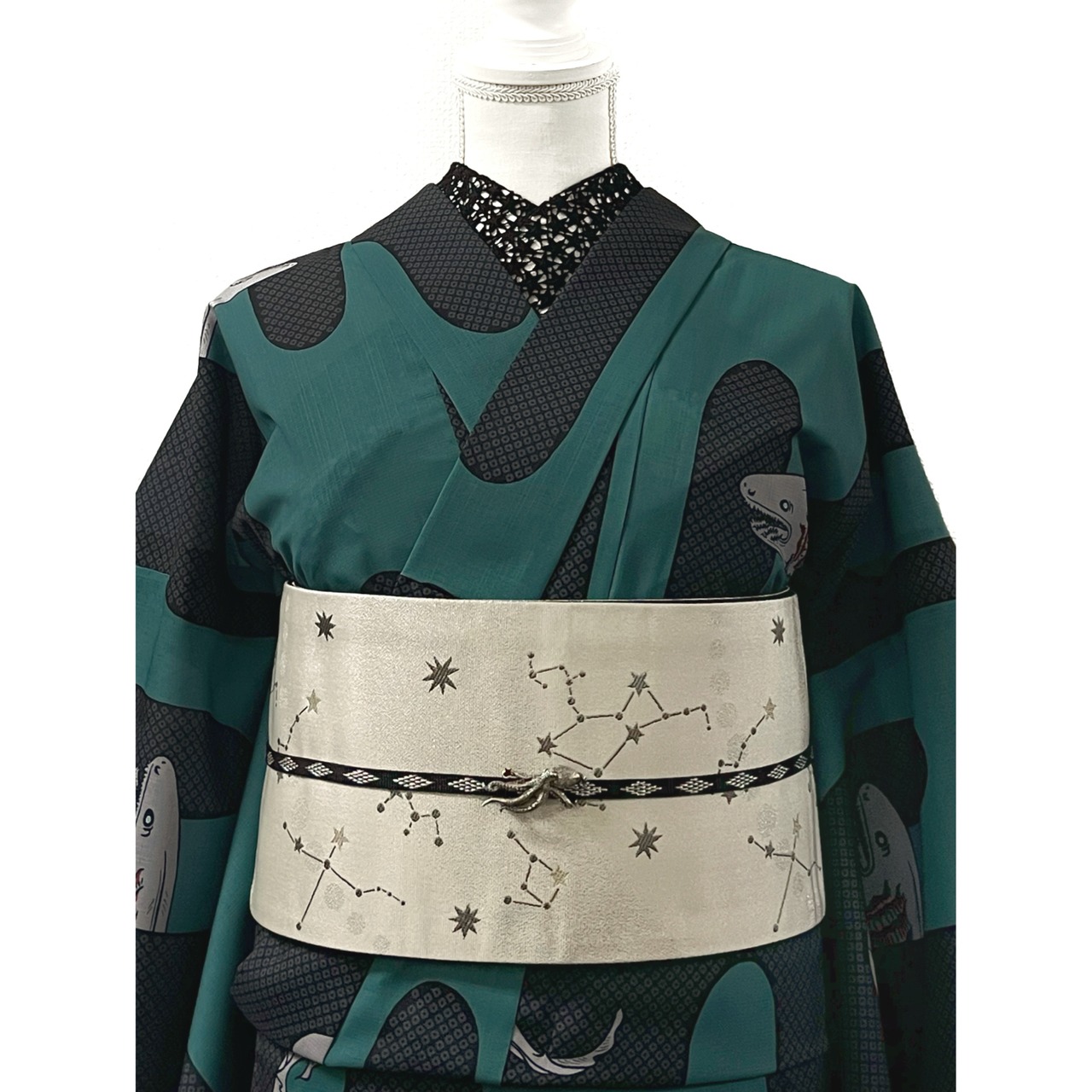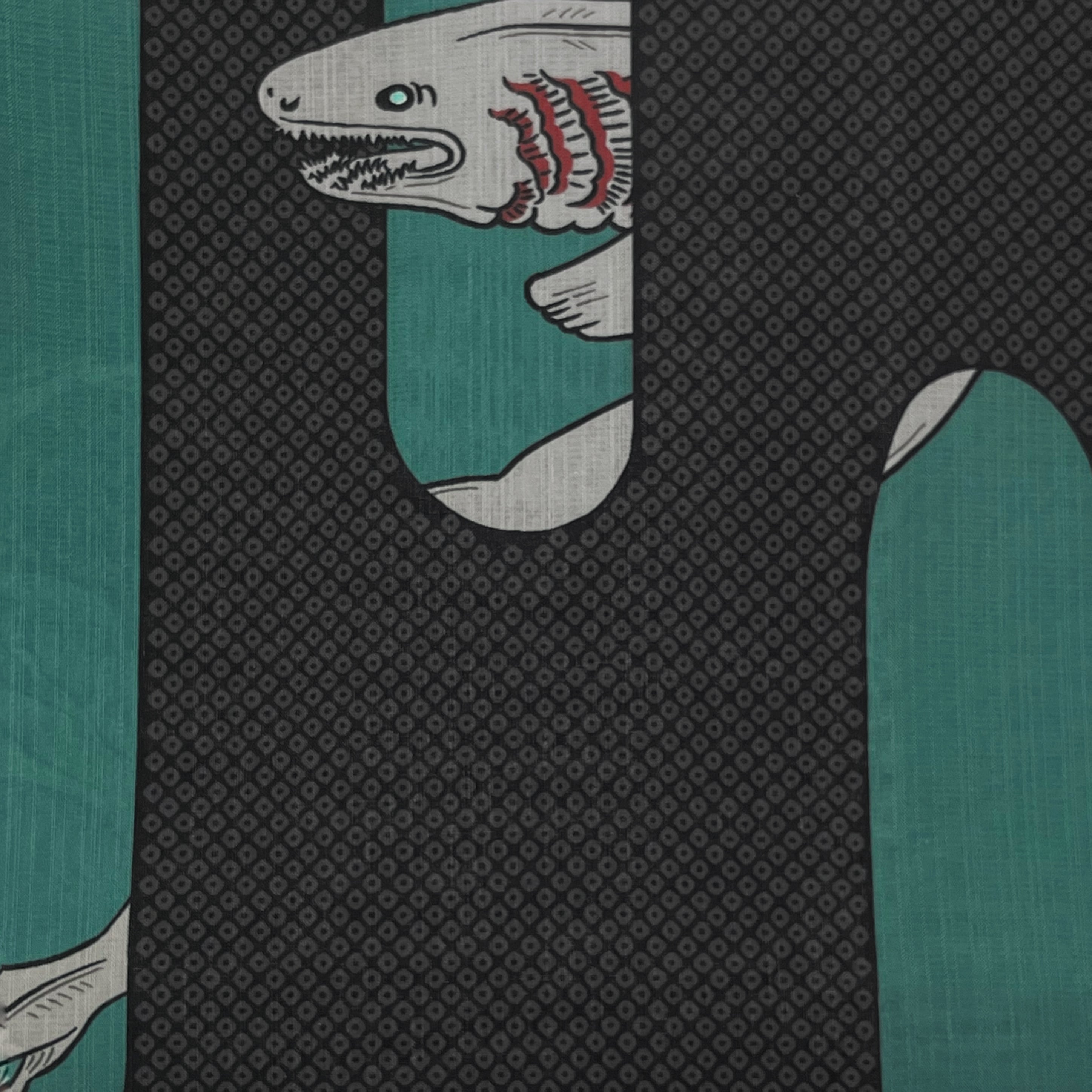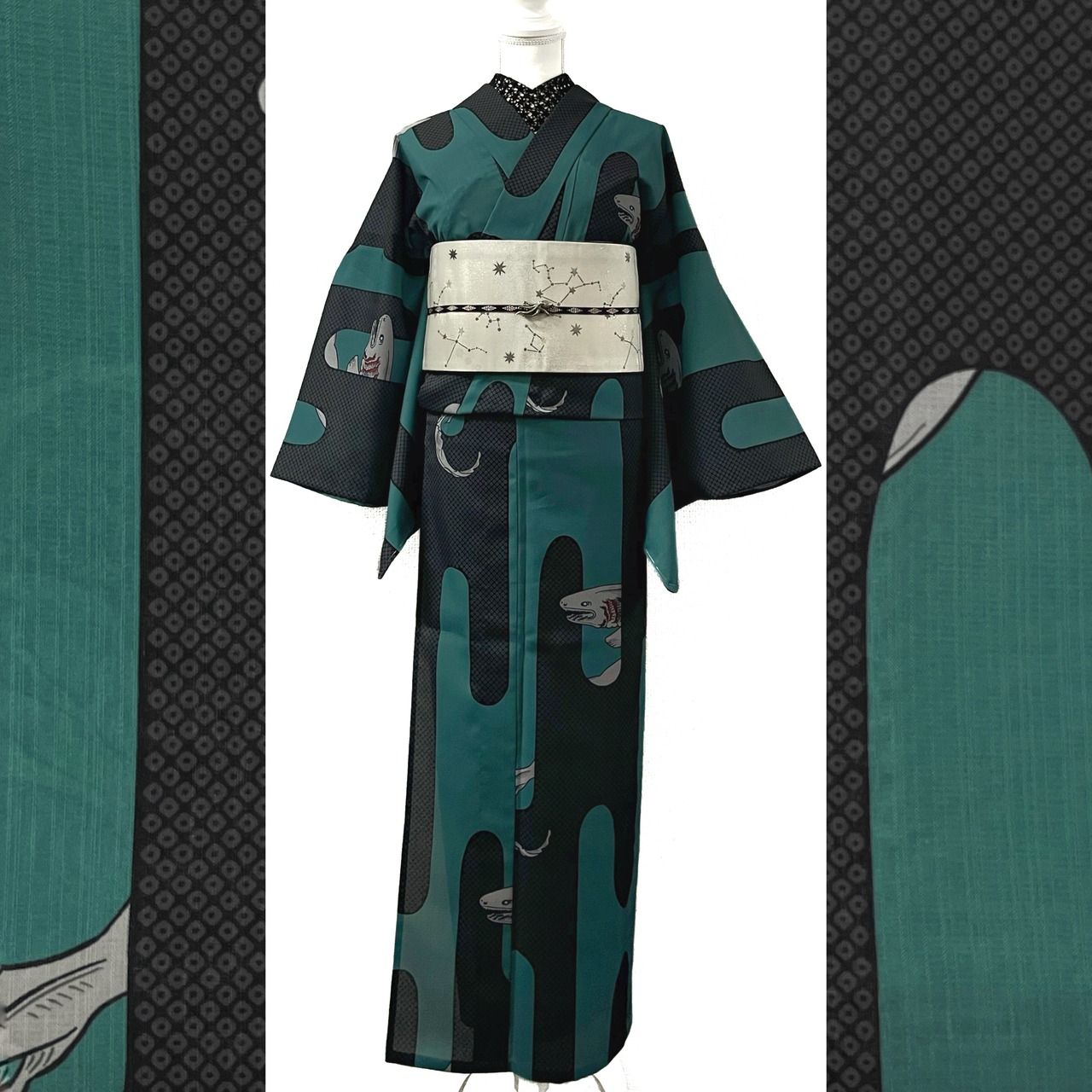 疋田文様入りの壺垂れ風な縦エ霞から見え隠れする深海のサメ『ラブカ』がデザインされた