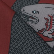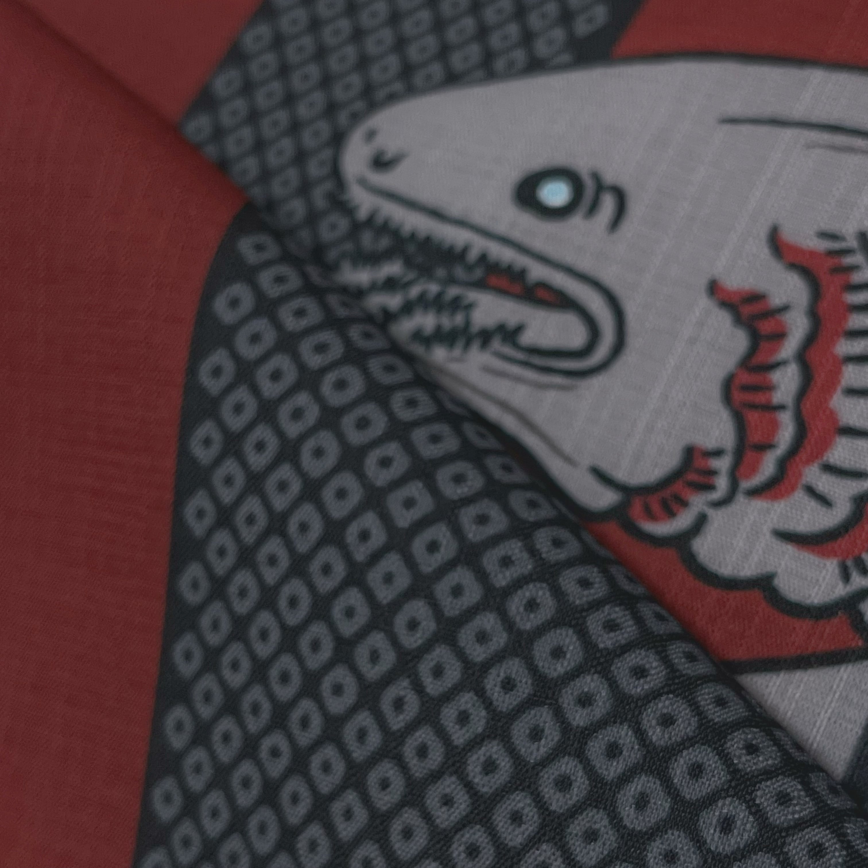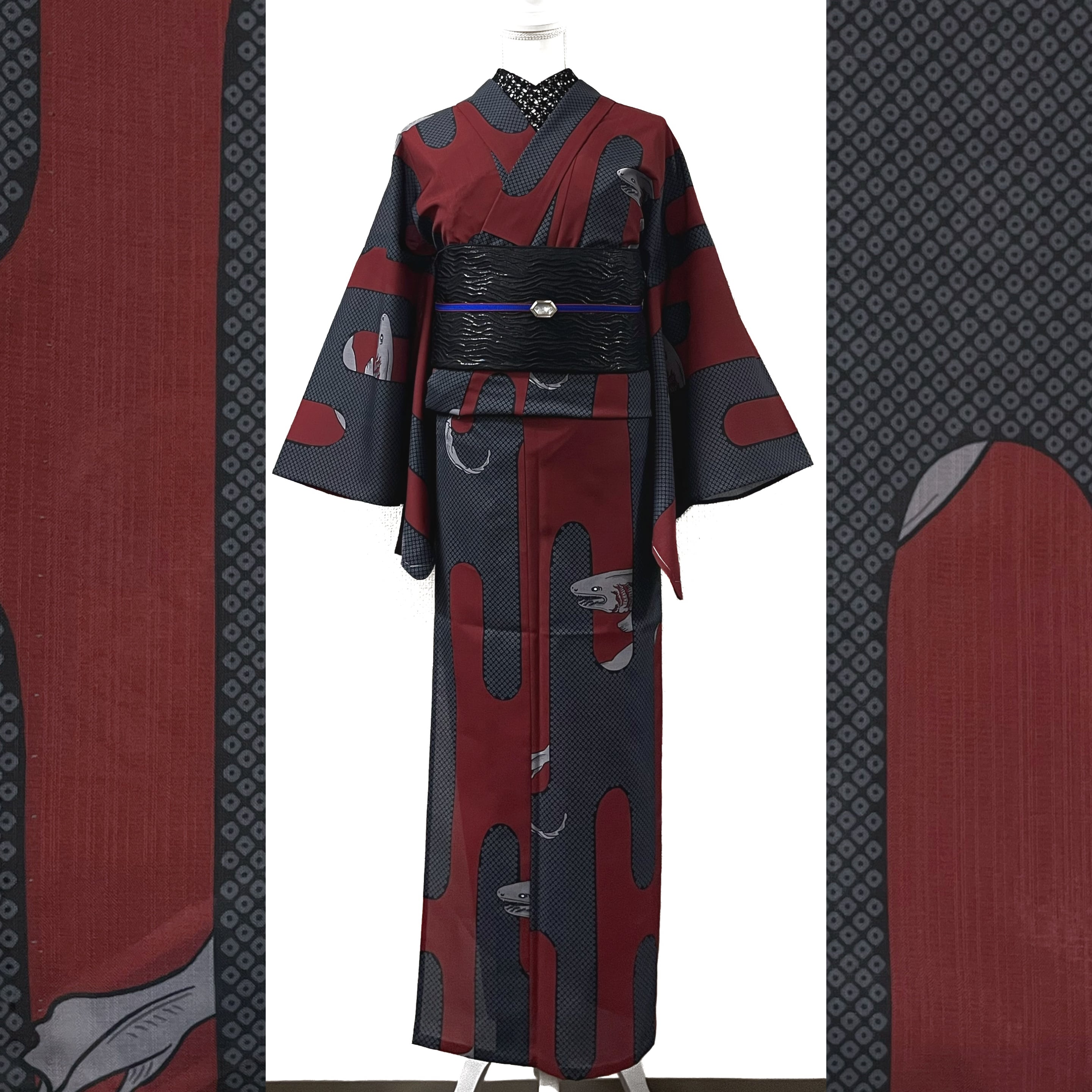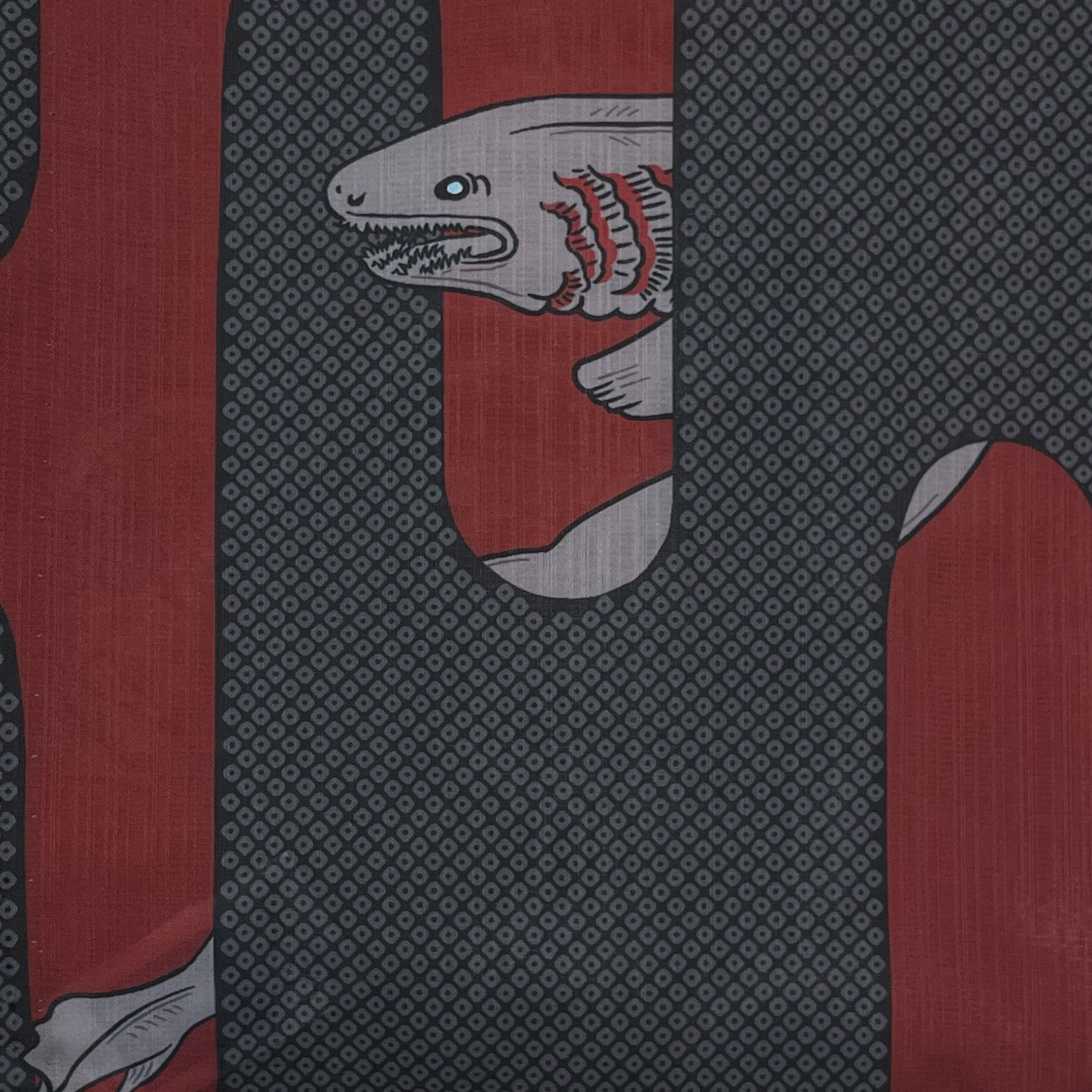 疋田文様入りの壺垂れ風な縦エ霞から見え隠れする深海のサメ『ラブカ』がデザインされた