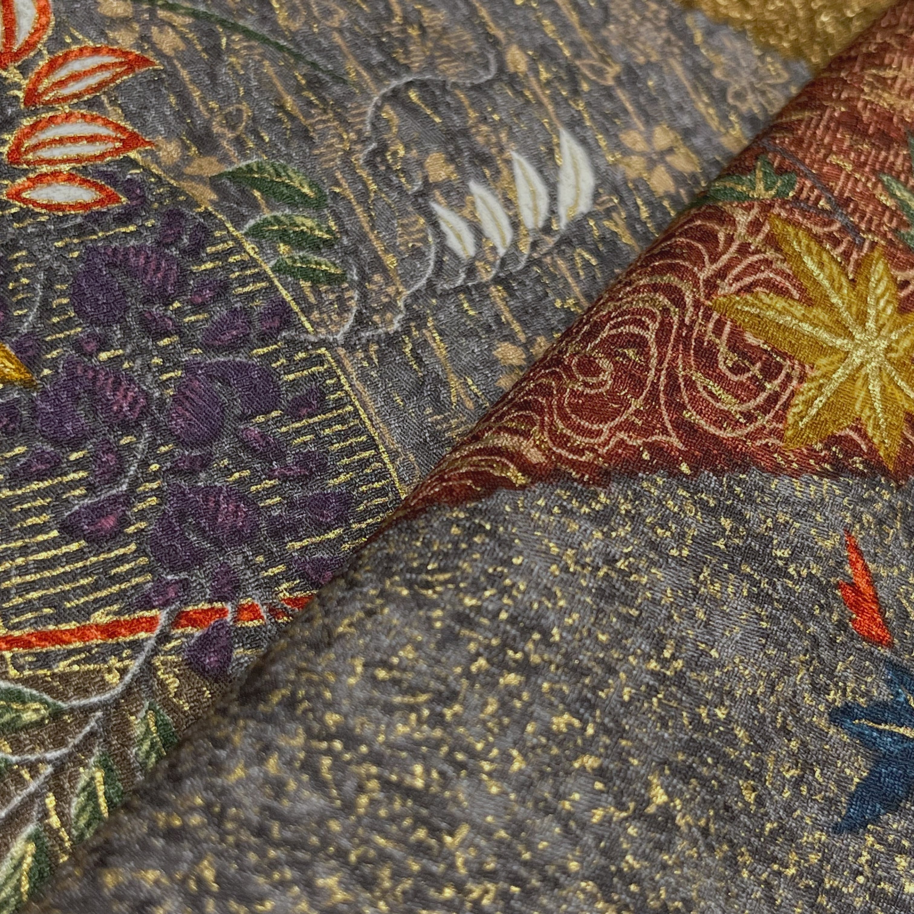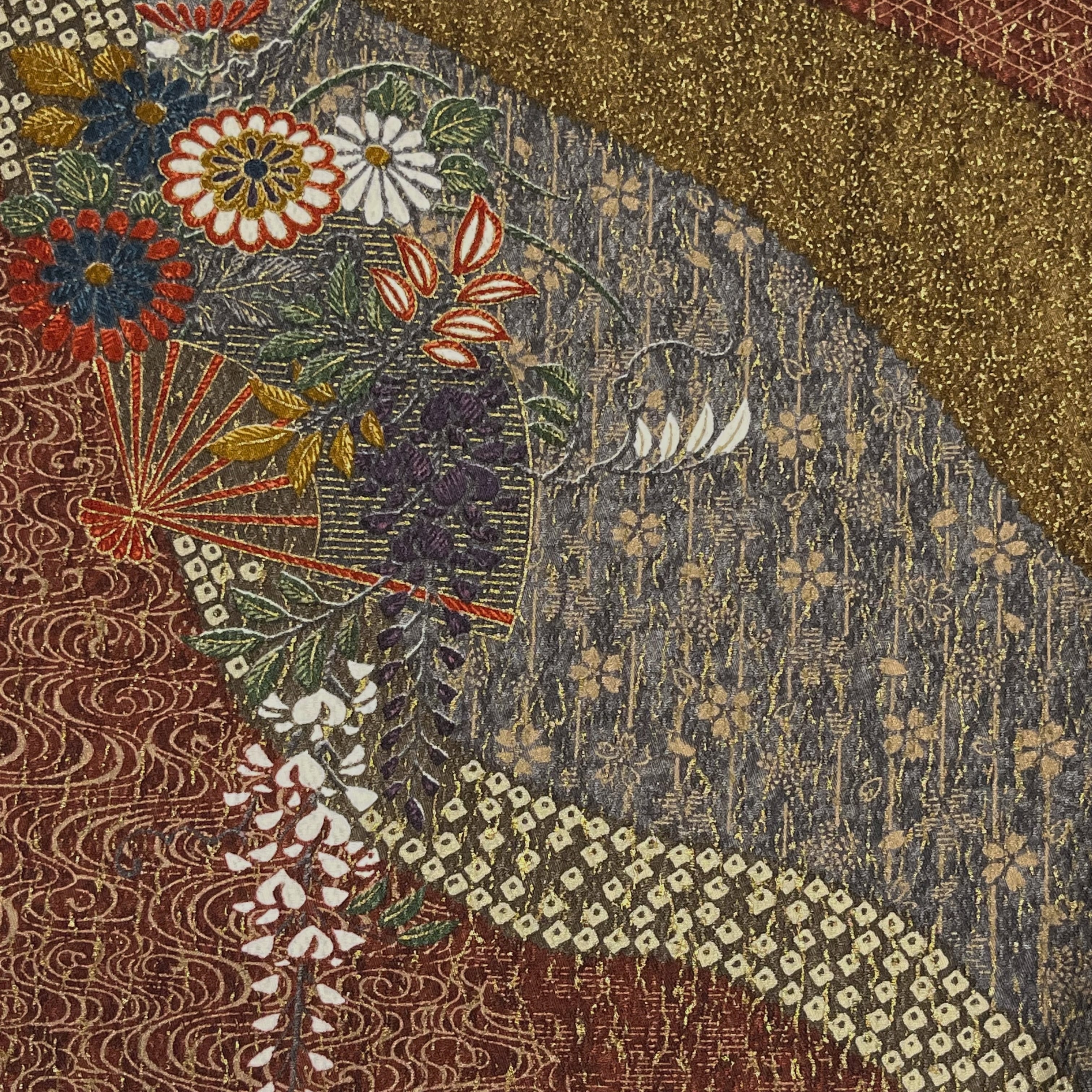・色柄説明:縮緬地に桔梗鼠色(青紫みのグレー)、媚茶色(やや黒ずんだ黄褐色)、銀煤竹色(赤黒い色に銀色を加味したような色)、海老茶色(赤みの茶色)の道長取りに