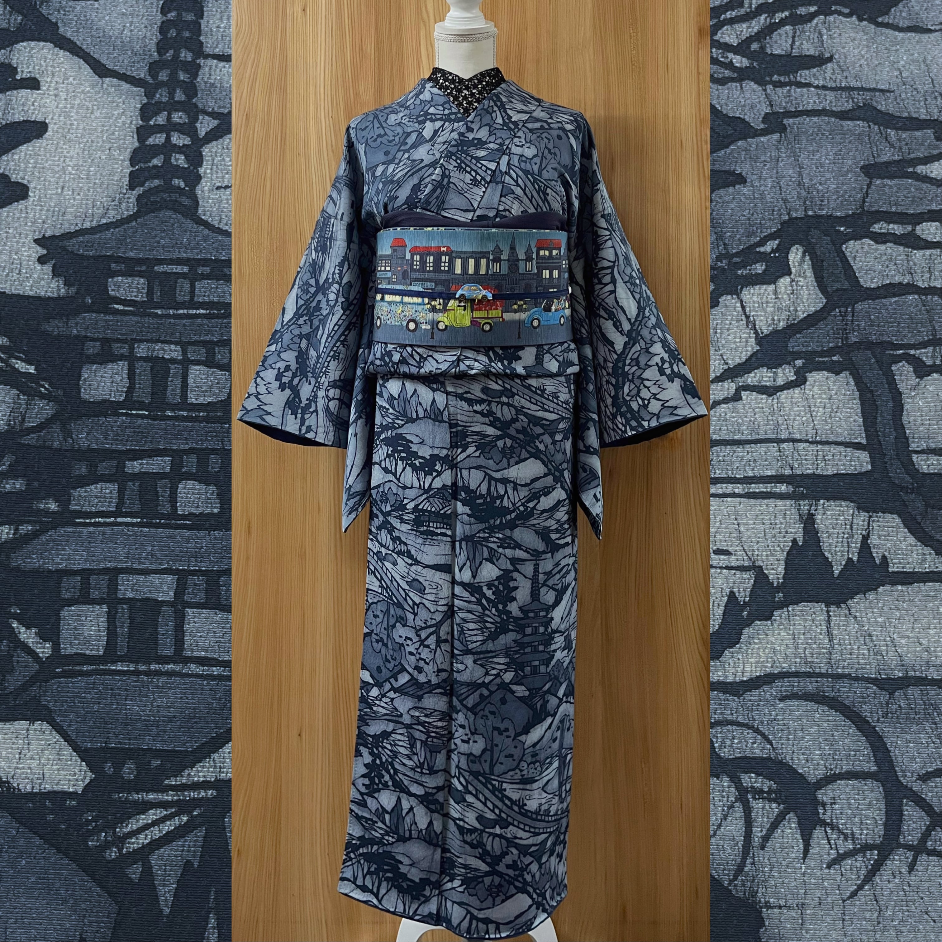 ・商品名:「空色鼠色の寺塔風景文様小紋着物」