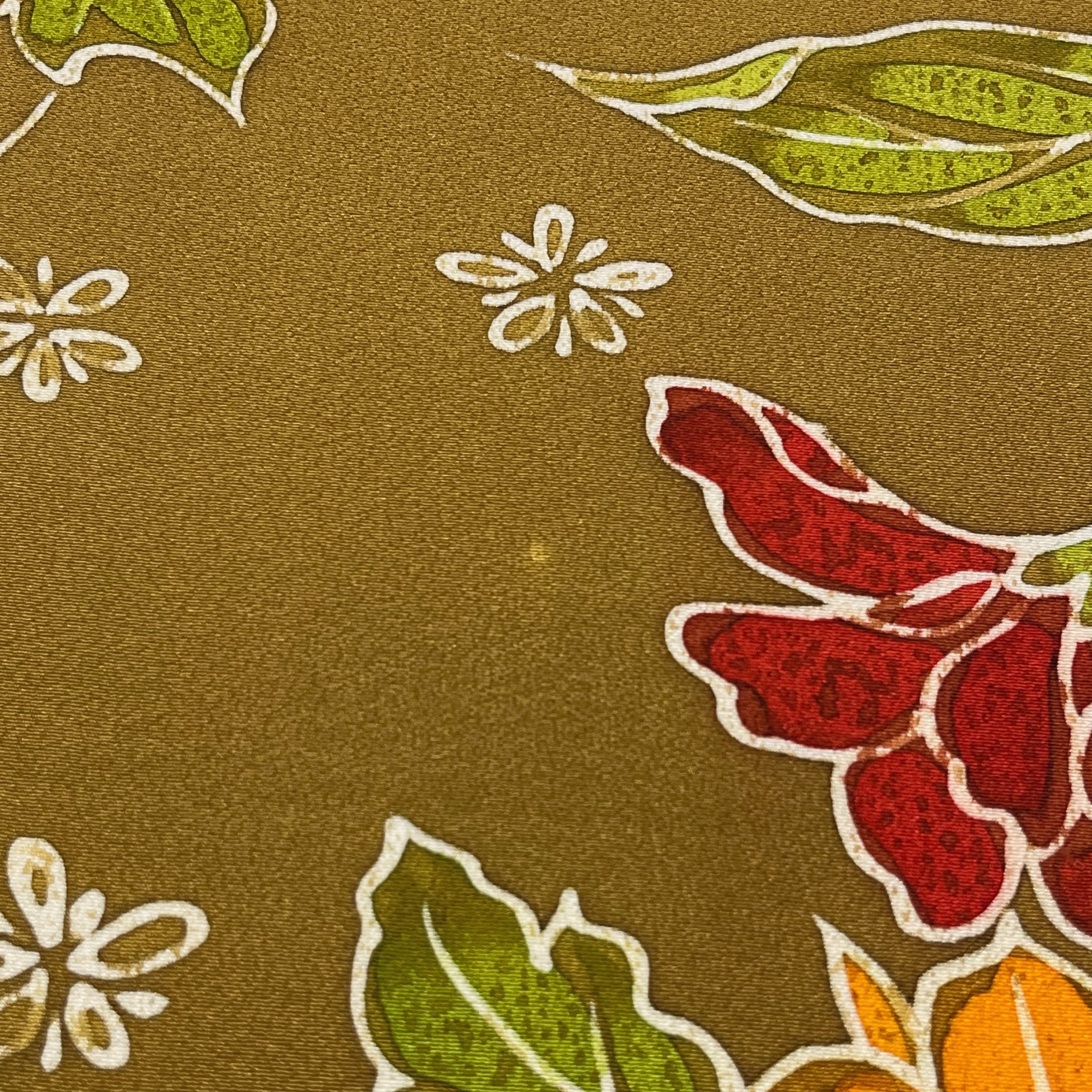 白色、紅色、オレンジ色、若草色、茶色の小花柄と枝花模様がデザインされた