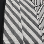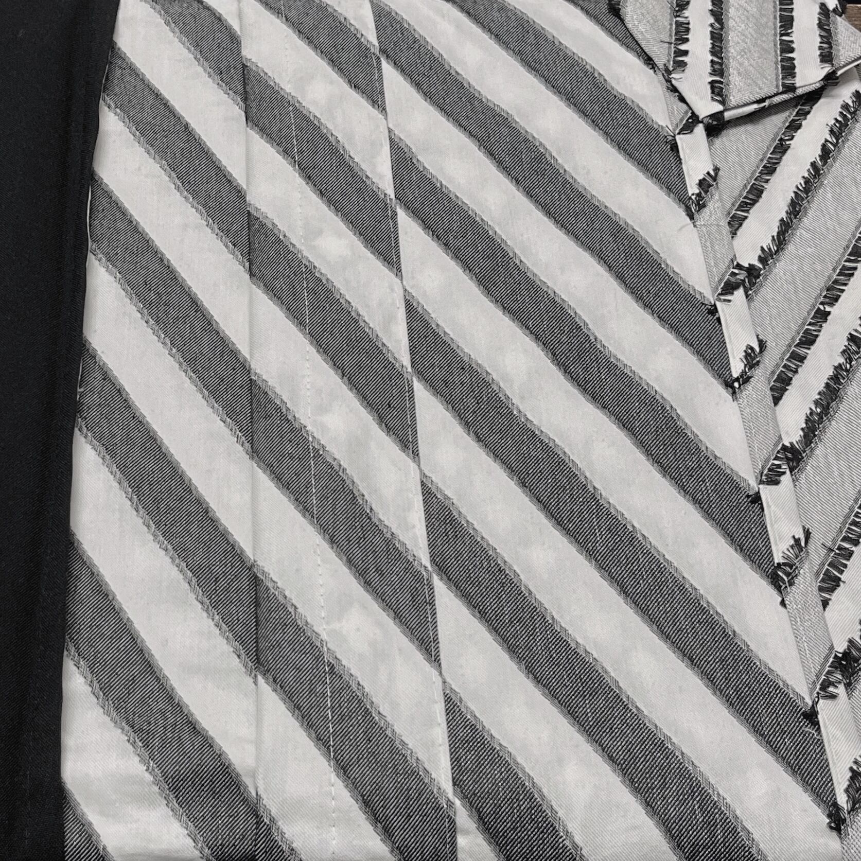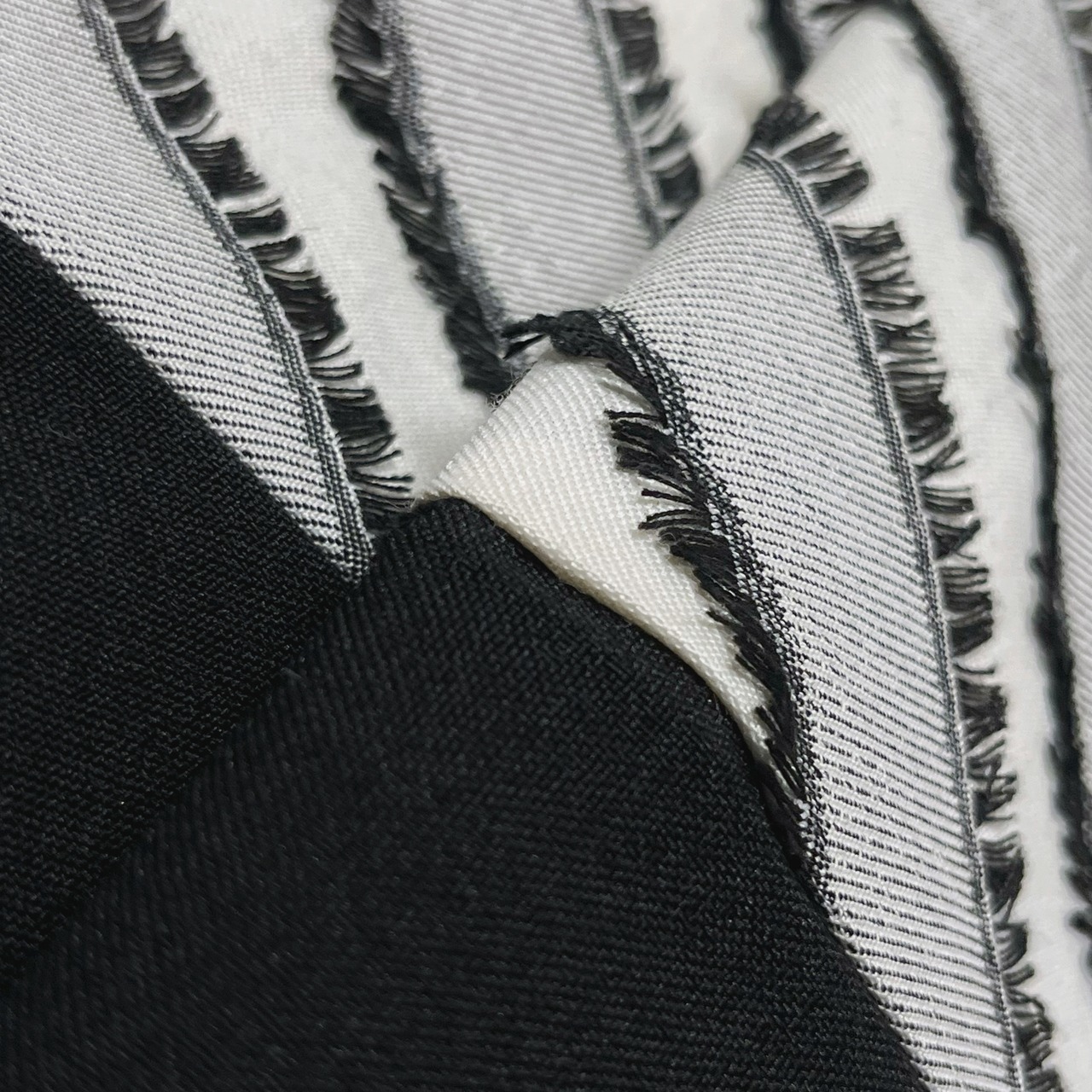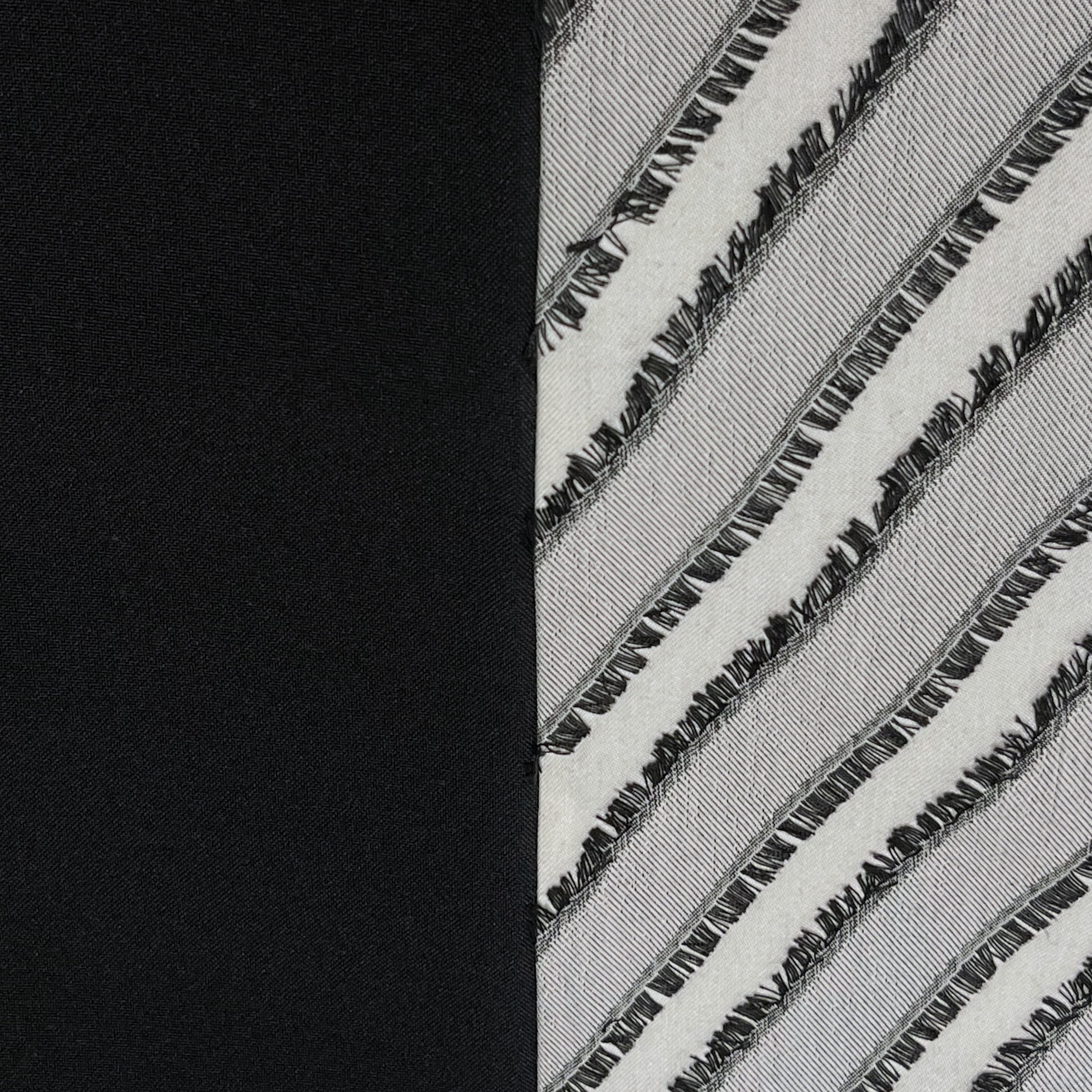 乳白色(淡いグレー)に黒色の短めなフリンジでできた斜めストライプが織り込まれた個性的なテキスタイルな左身頃を合わせた