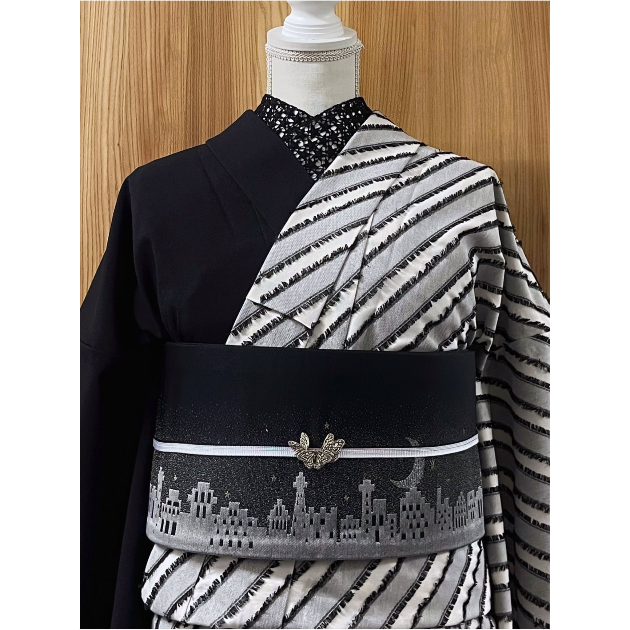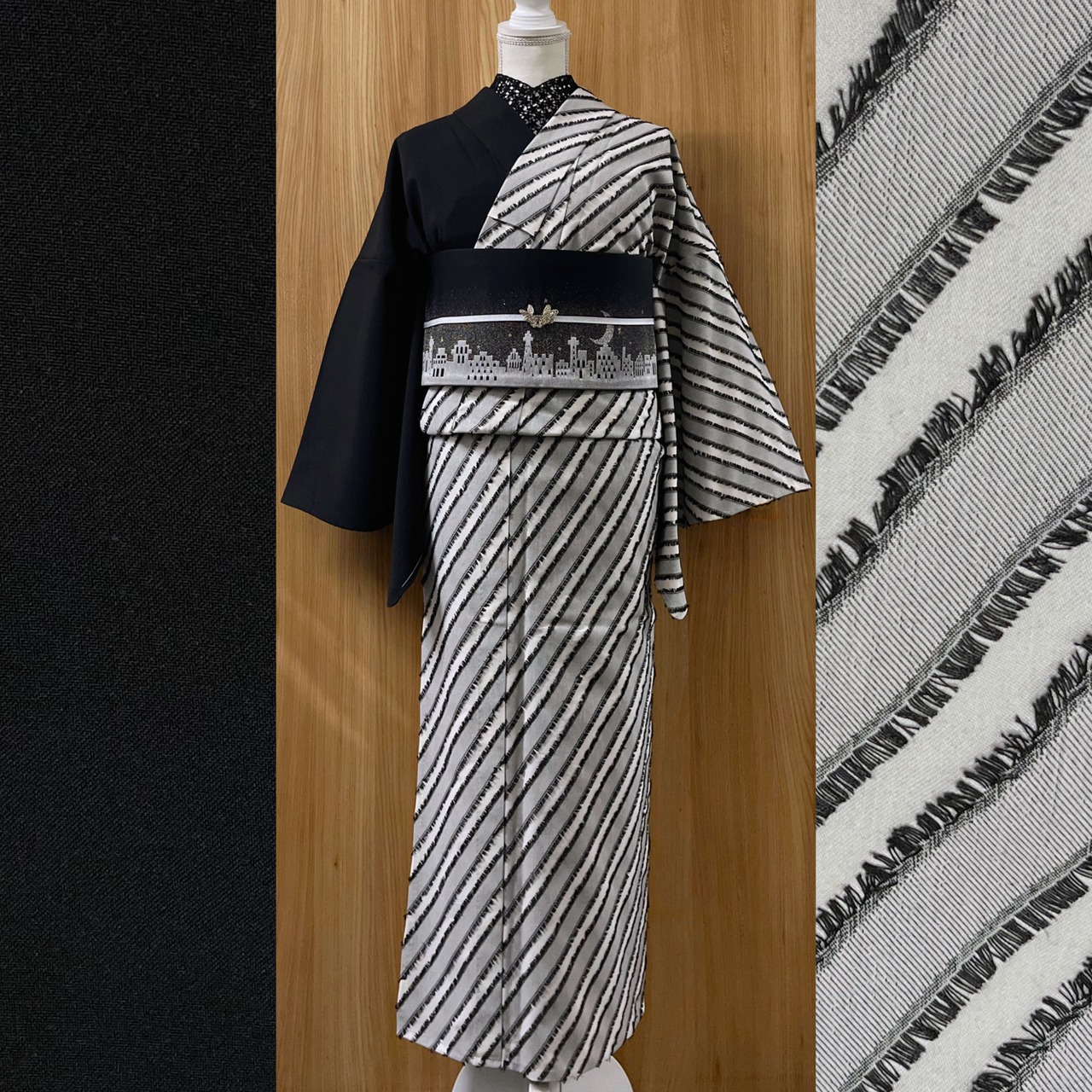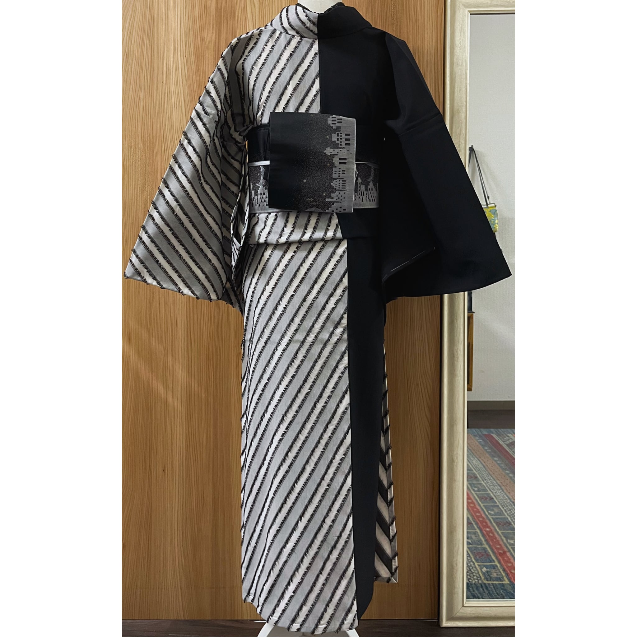 商品名:「撫松庵 フリンジ斜めストライプの片身替わり単衣着物」