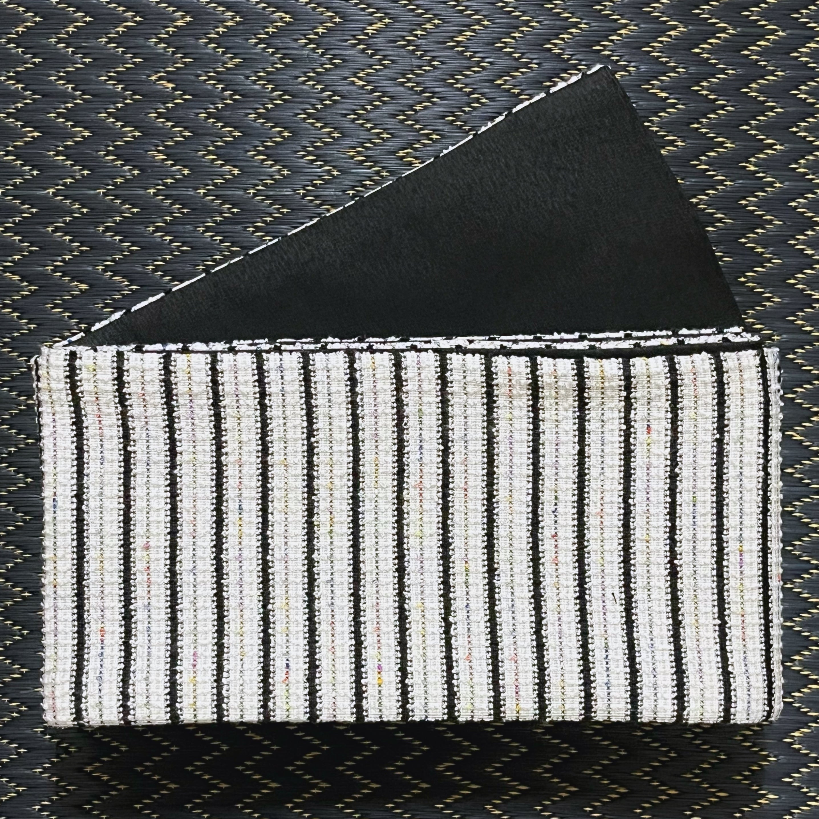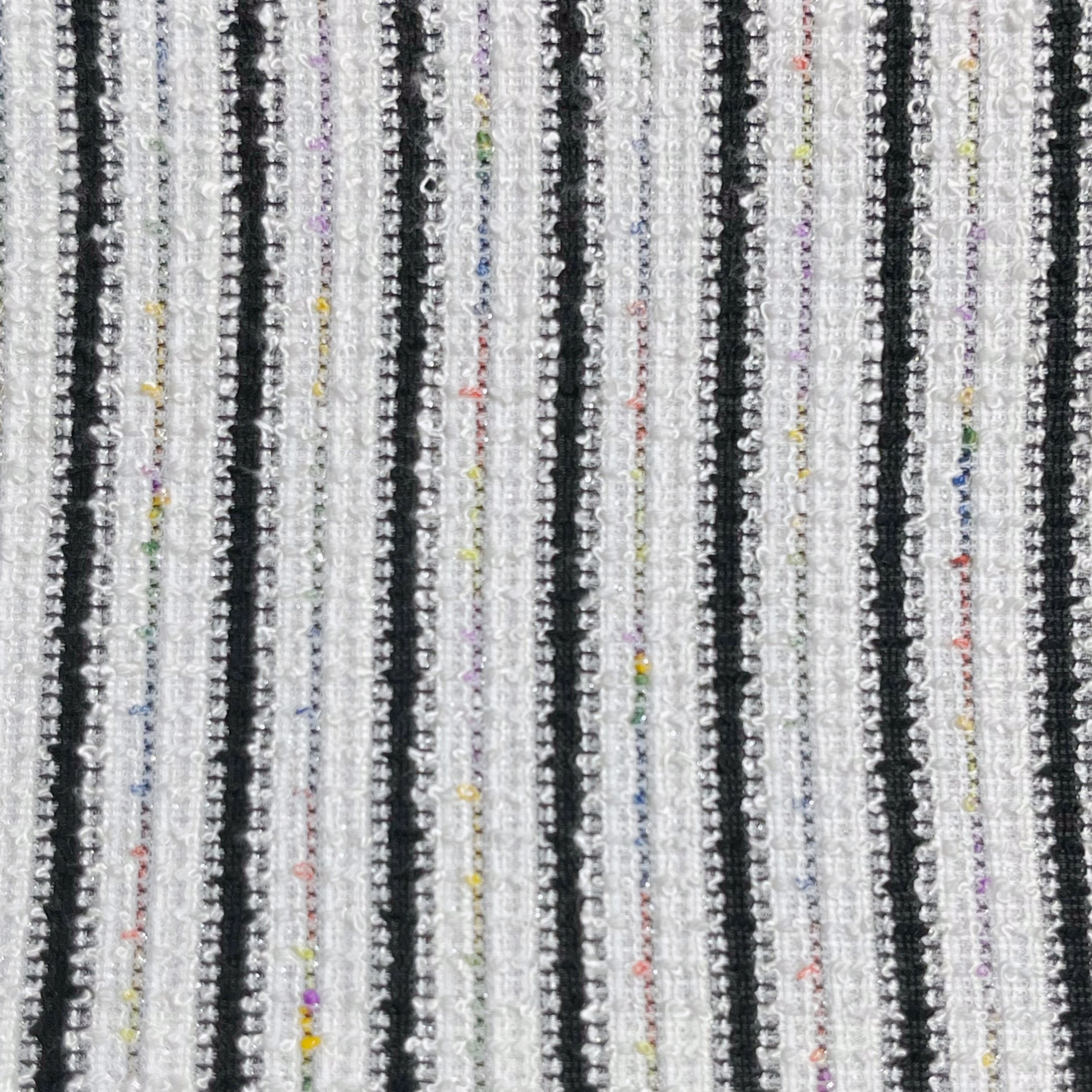 色柄説明:銀糸を織り込んだ白色と、黒色、レインボーカラーのストライプ柄に織り込まれたツイード素材が上品でモダンな洋装MIXにもオススメな半幅帯です☺︎