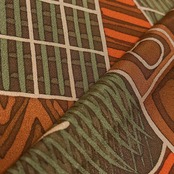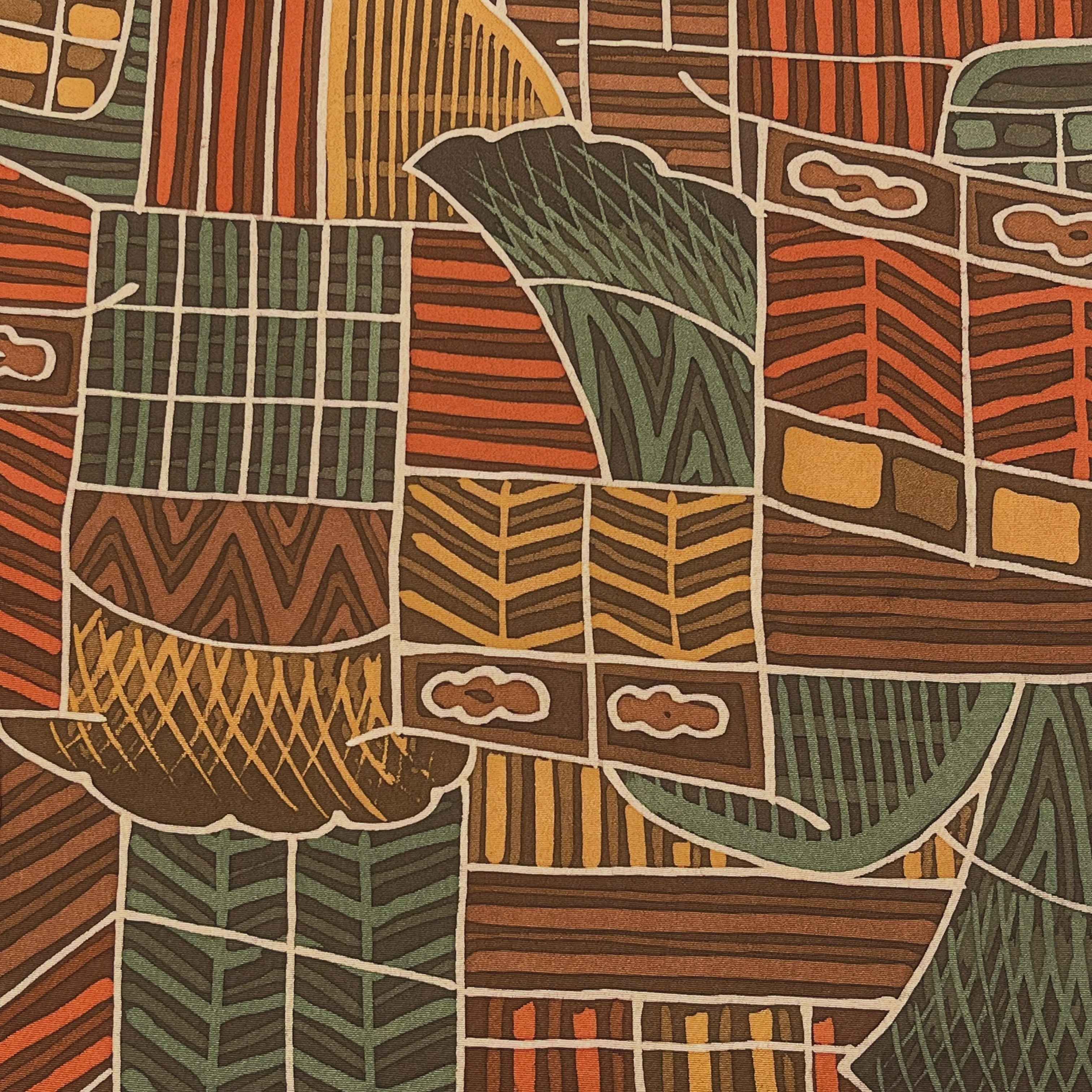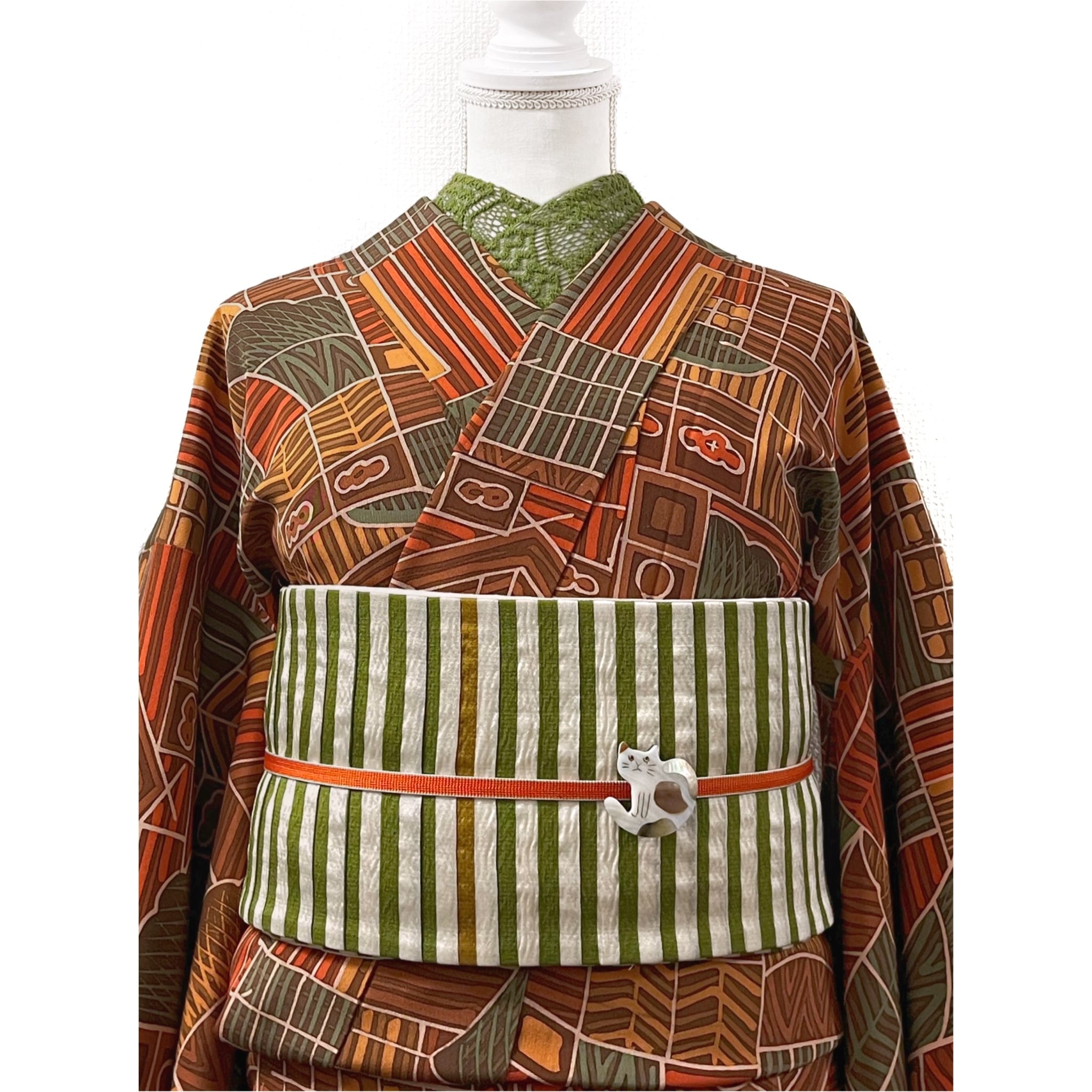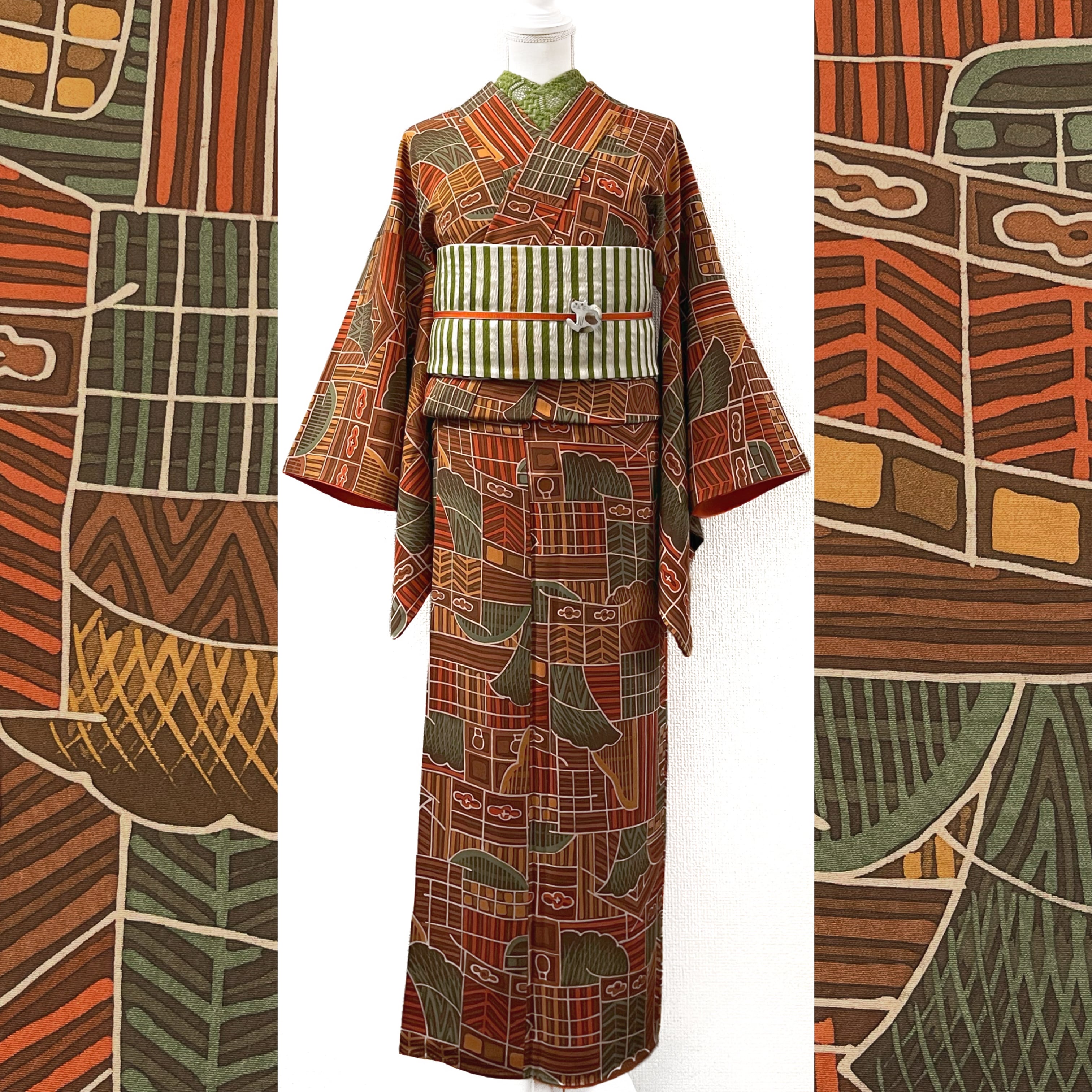 抽象的な家屋や生垣文様がデザインされたレトロモダンな小紋着物です☺︎