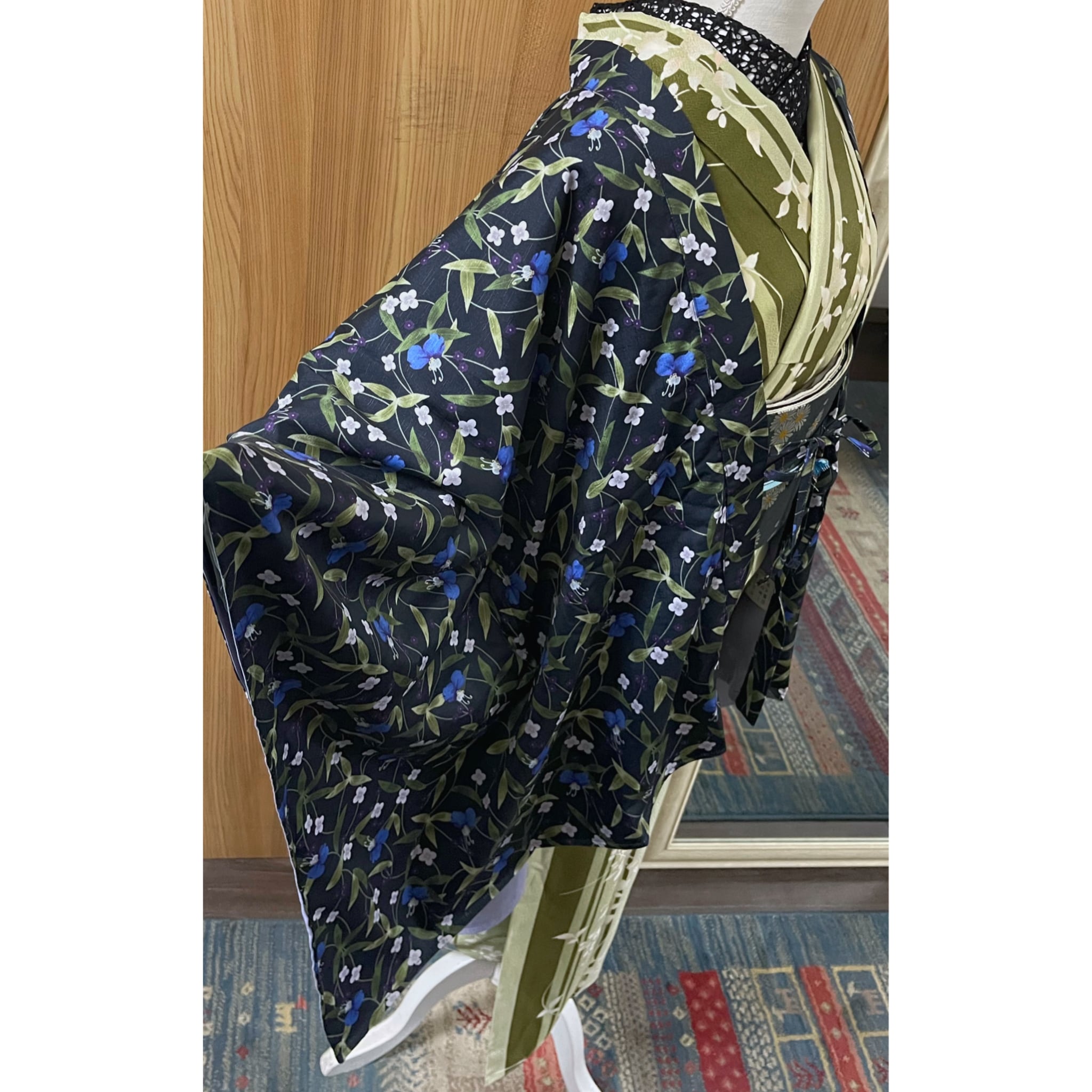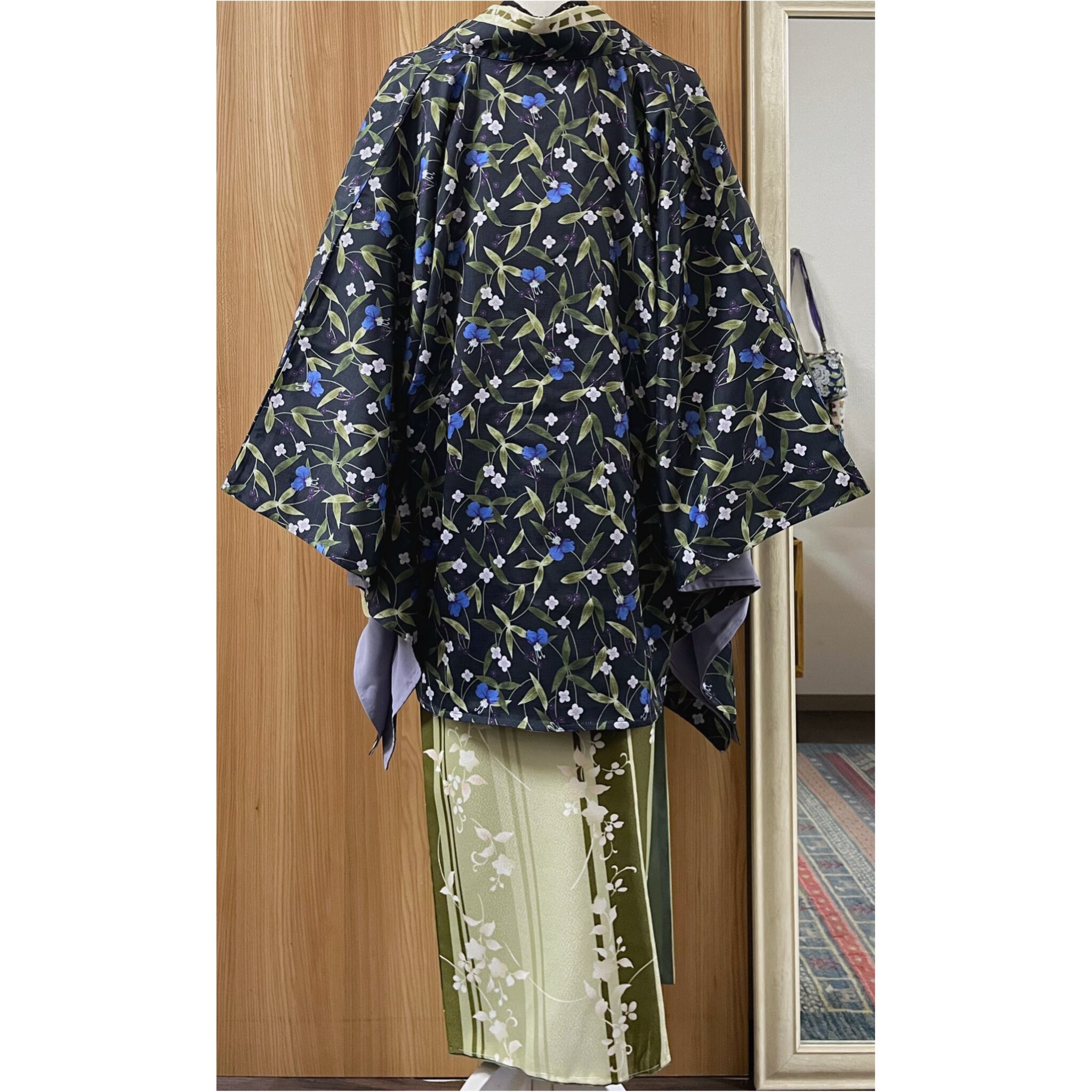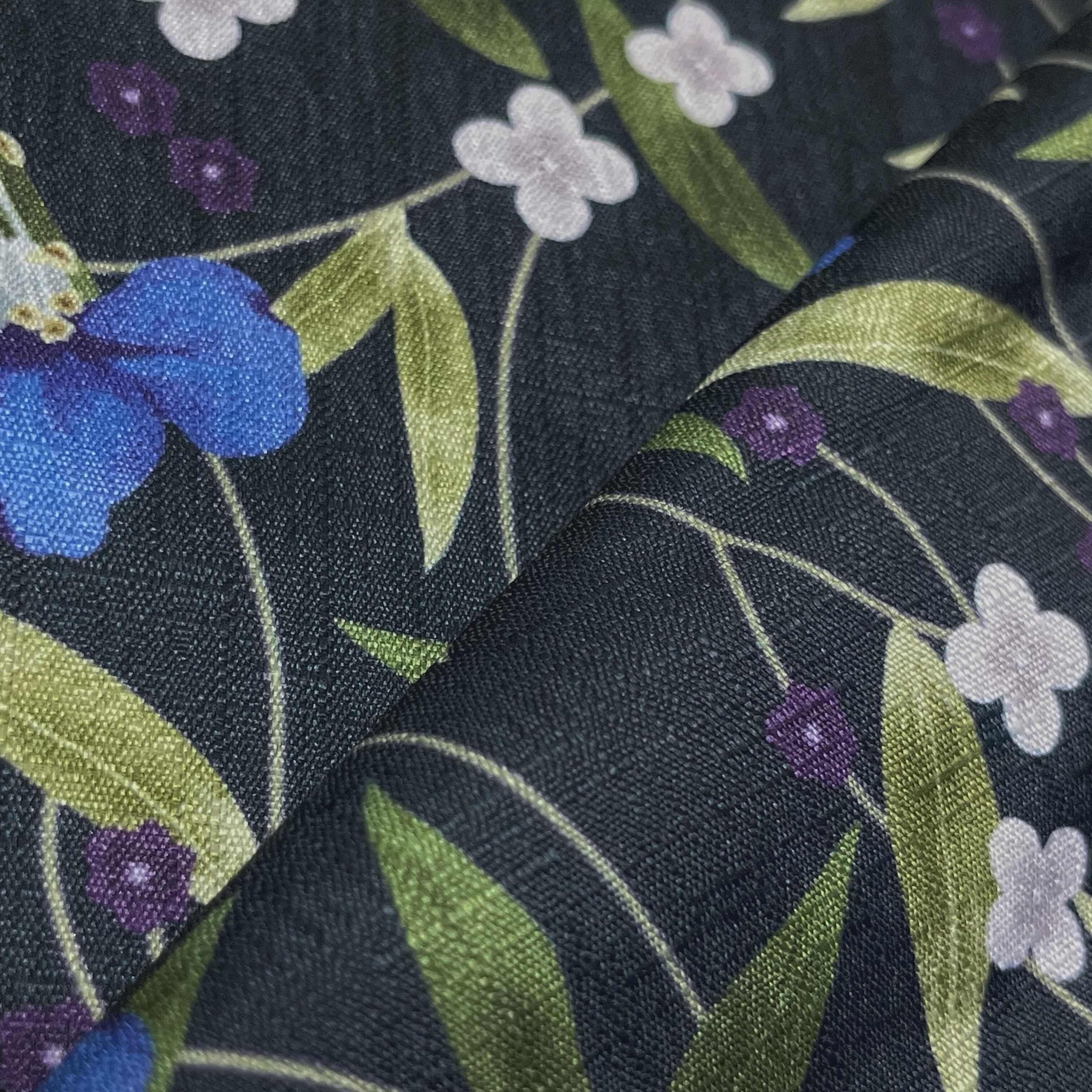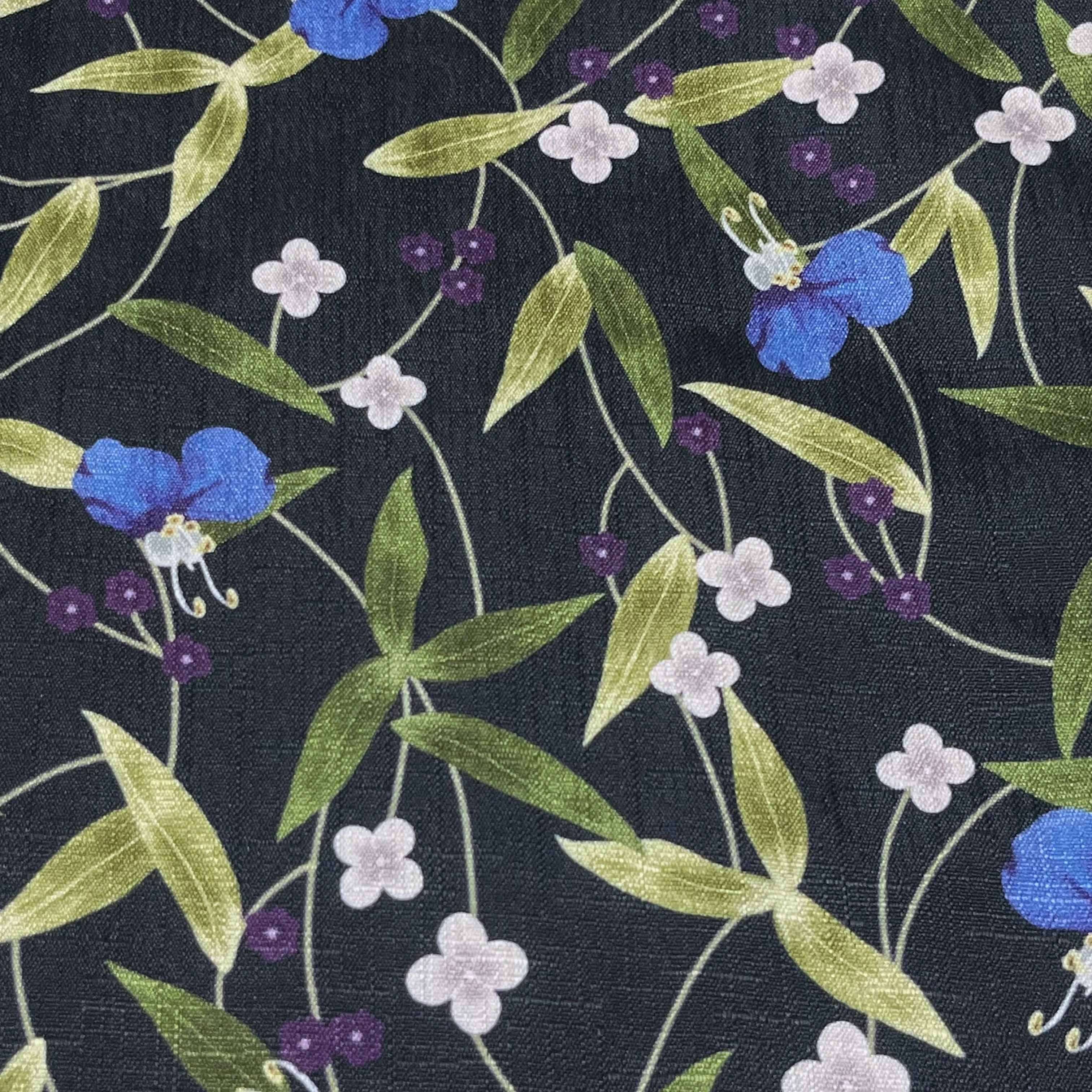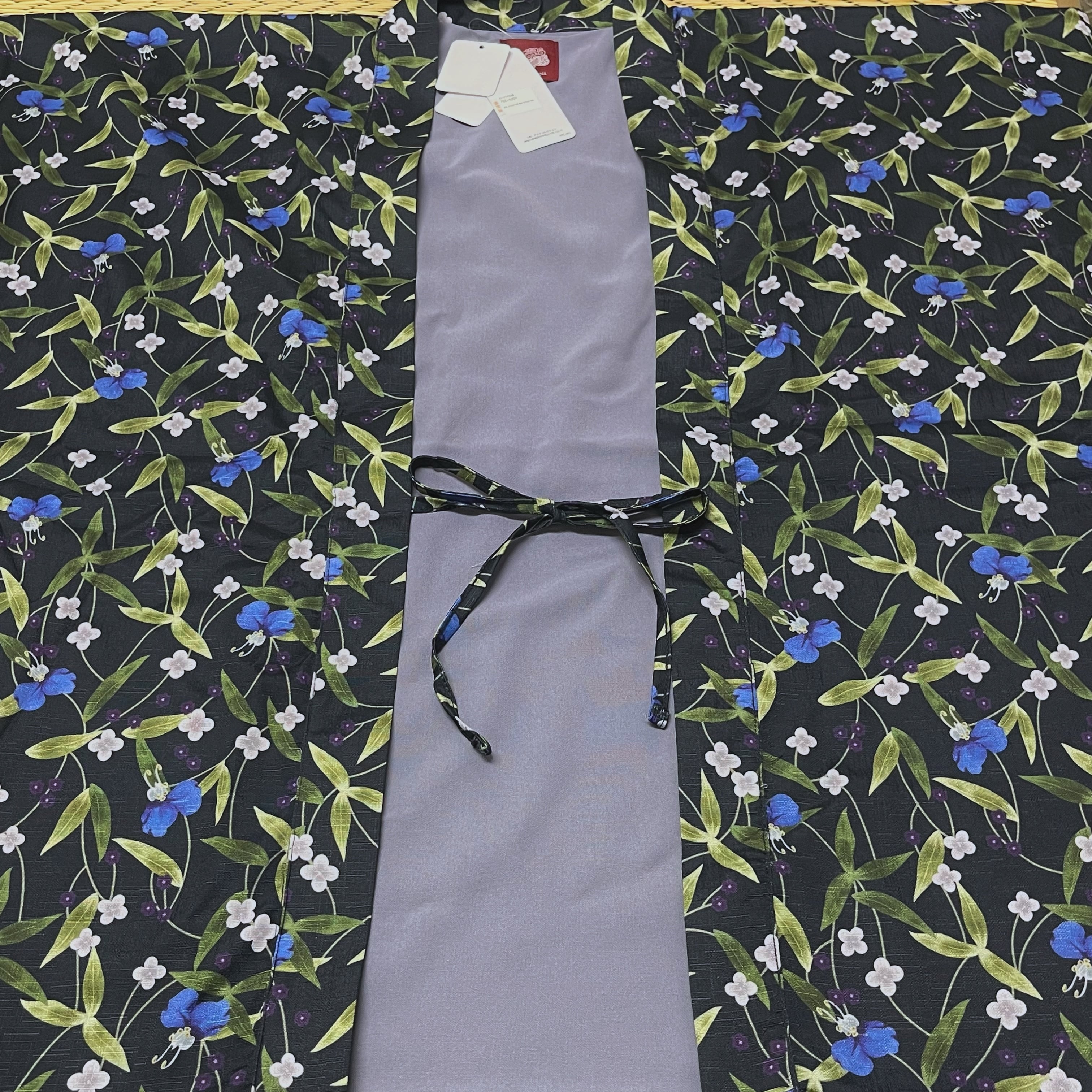 ラピスラズリカラーや濃色、ライトグレーの露草や小花模様がデザインされたゆったりサイズの羽織です。