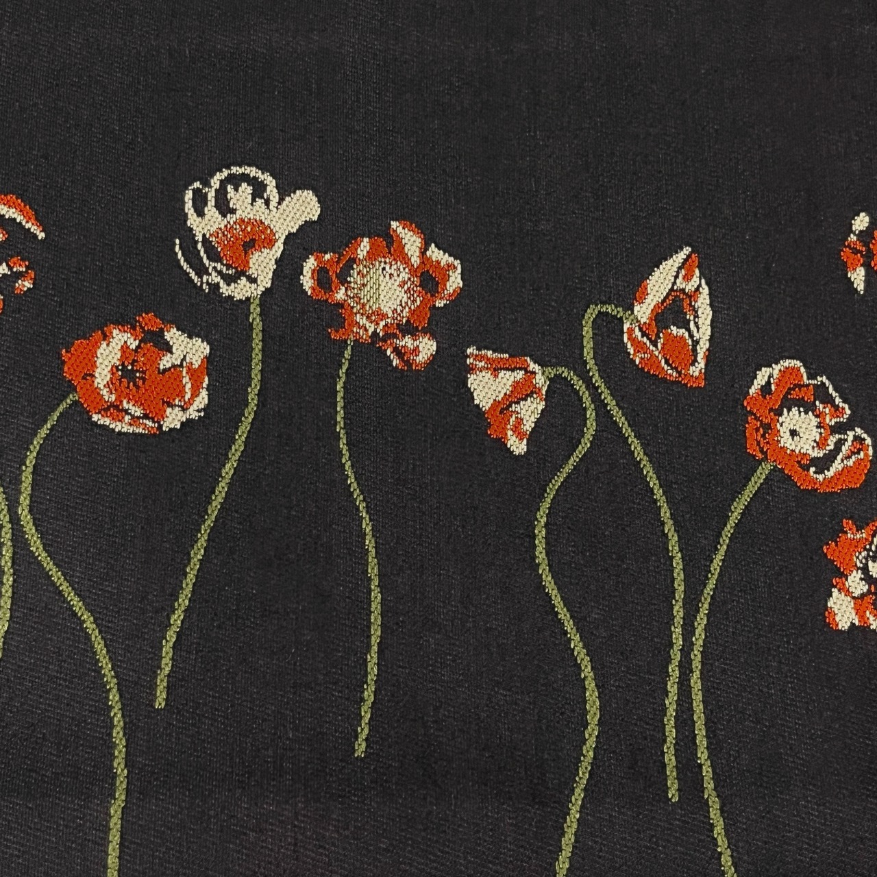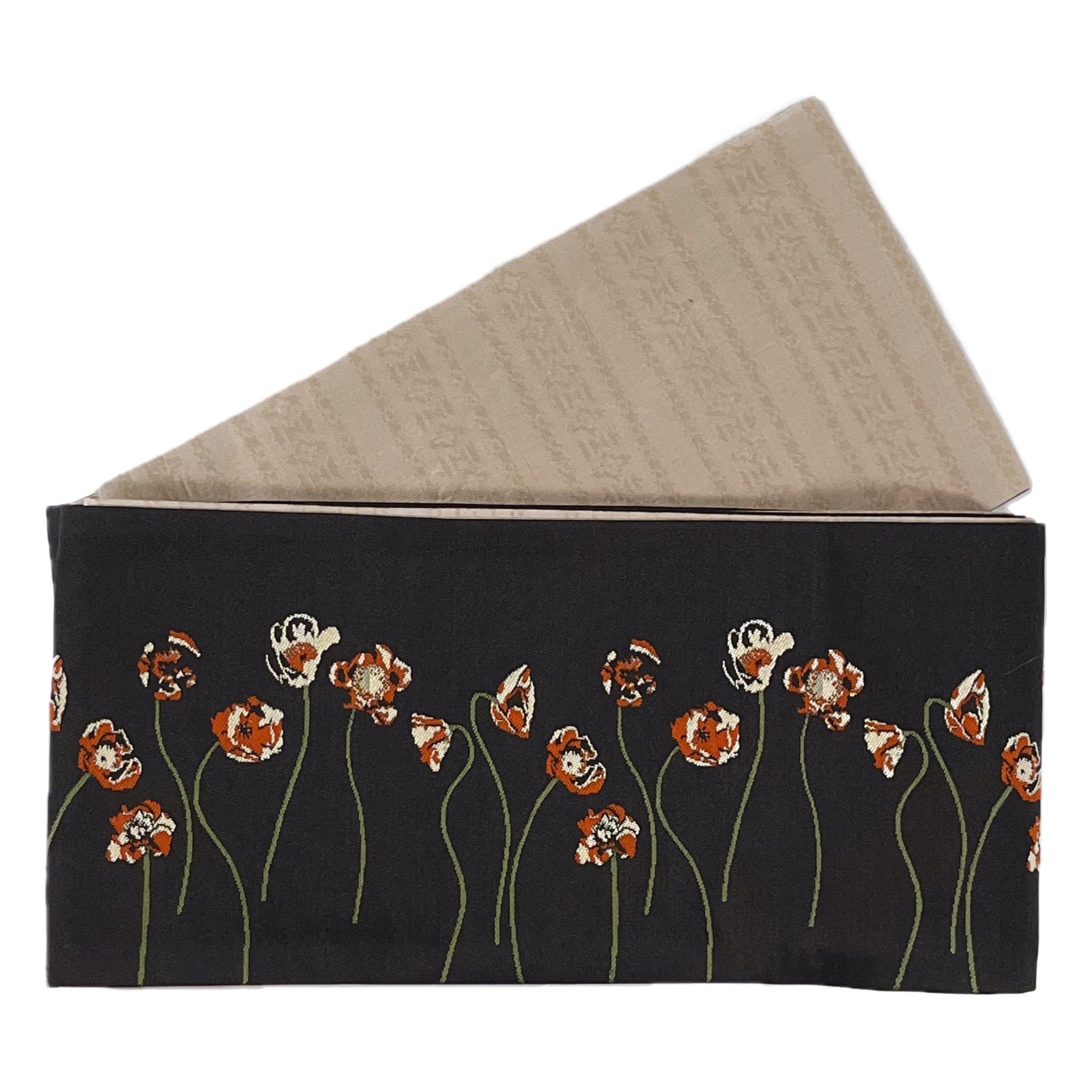 象牙色、朱色、オリーブグリーンの抽象的なポピーの花模様がデザインされたレトロガーリーな正絹半幅帯です☺︎