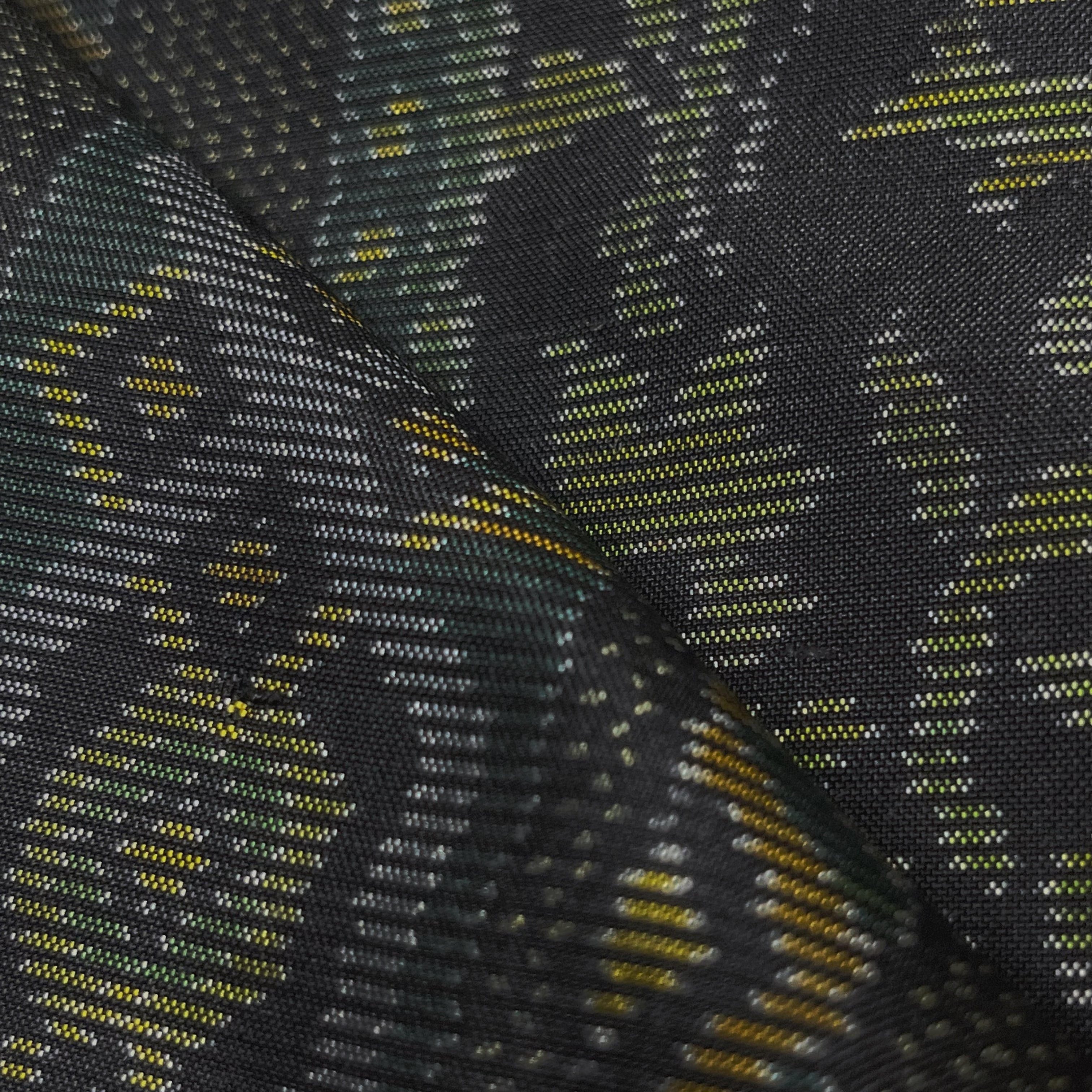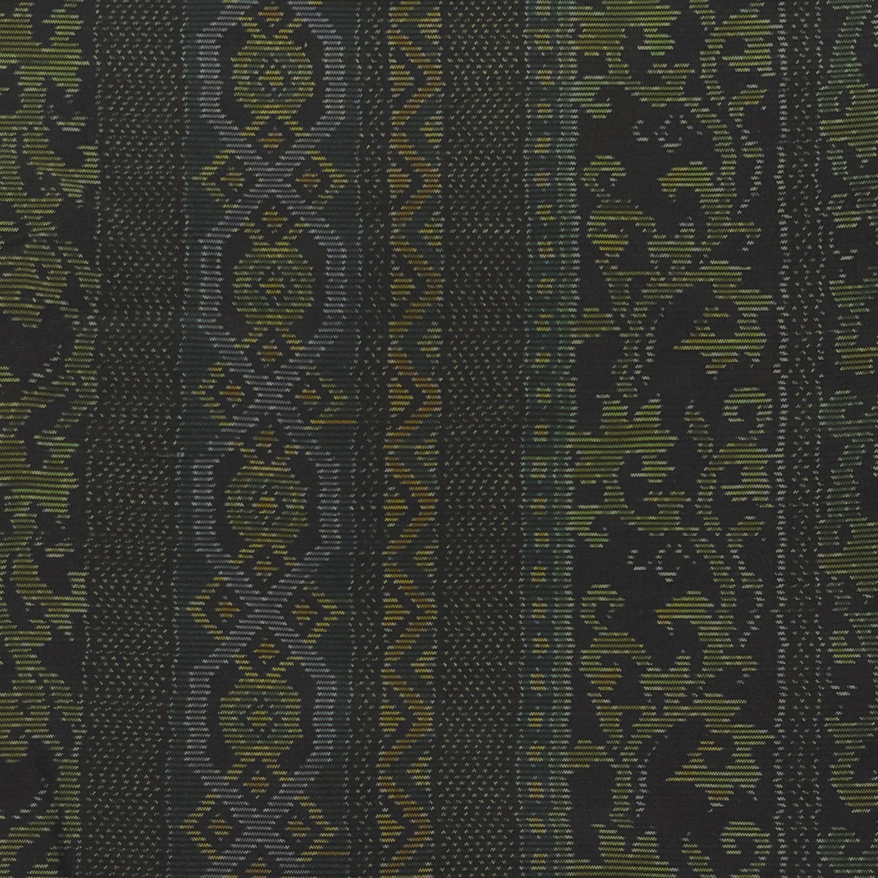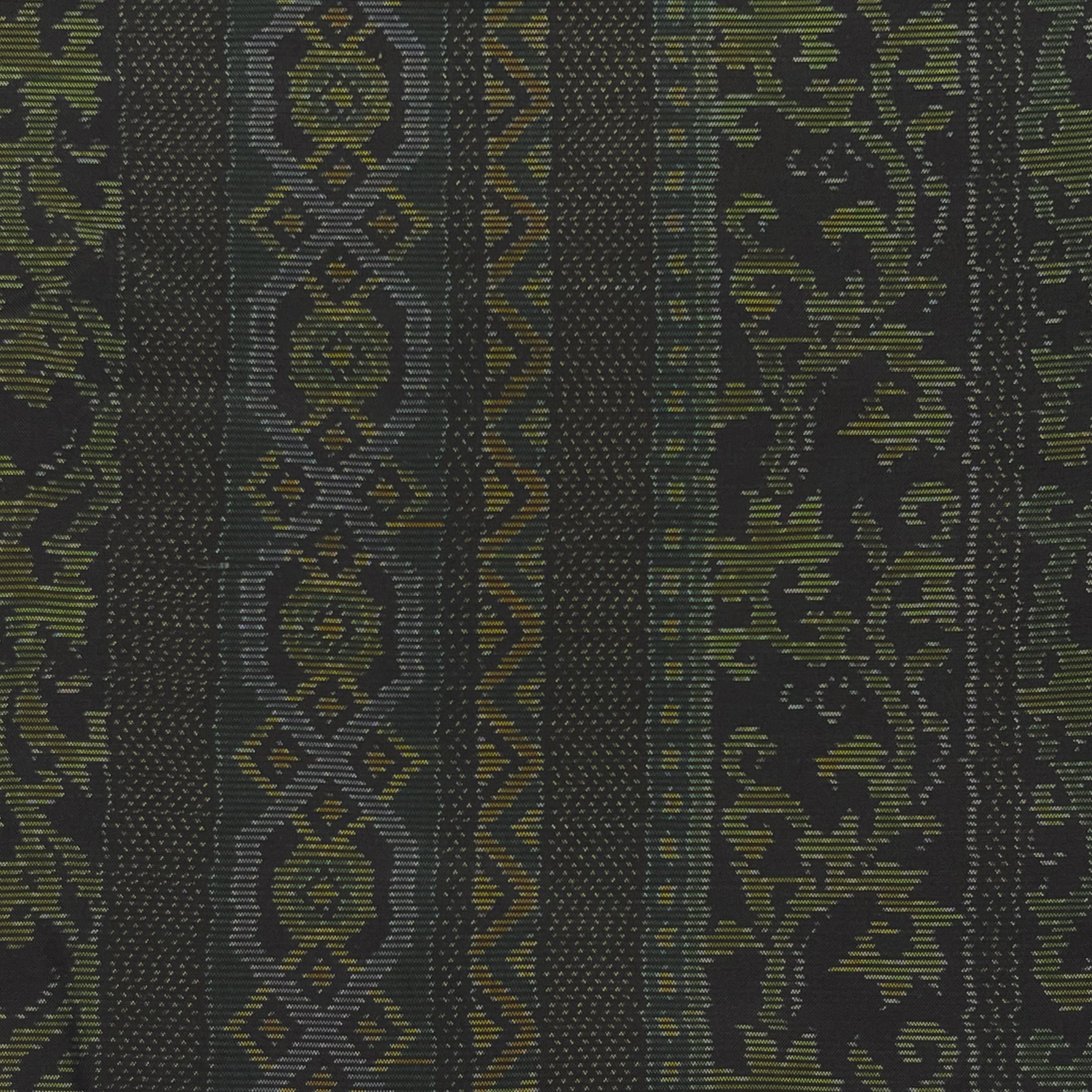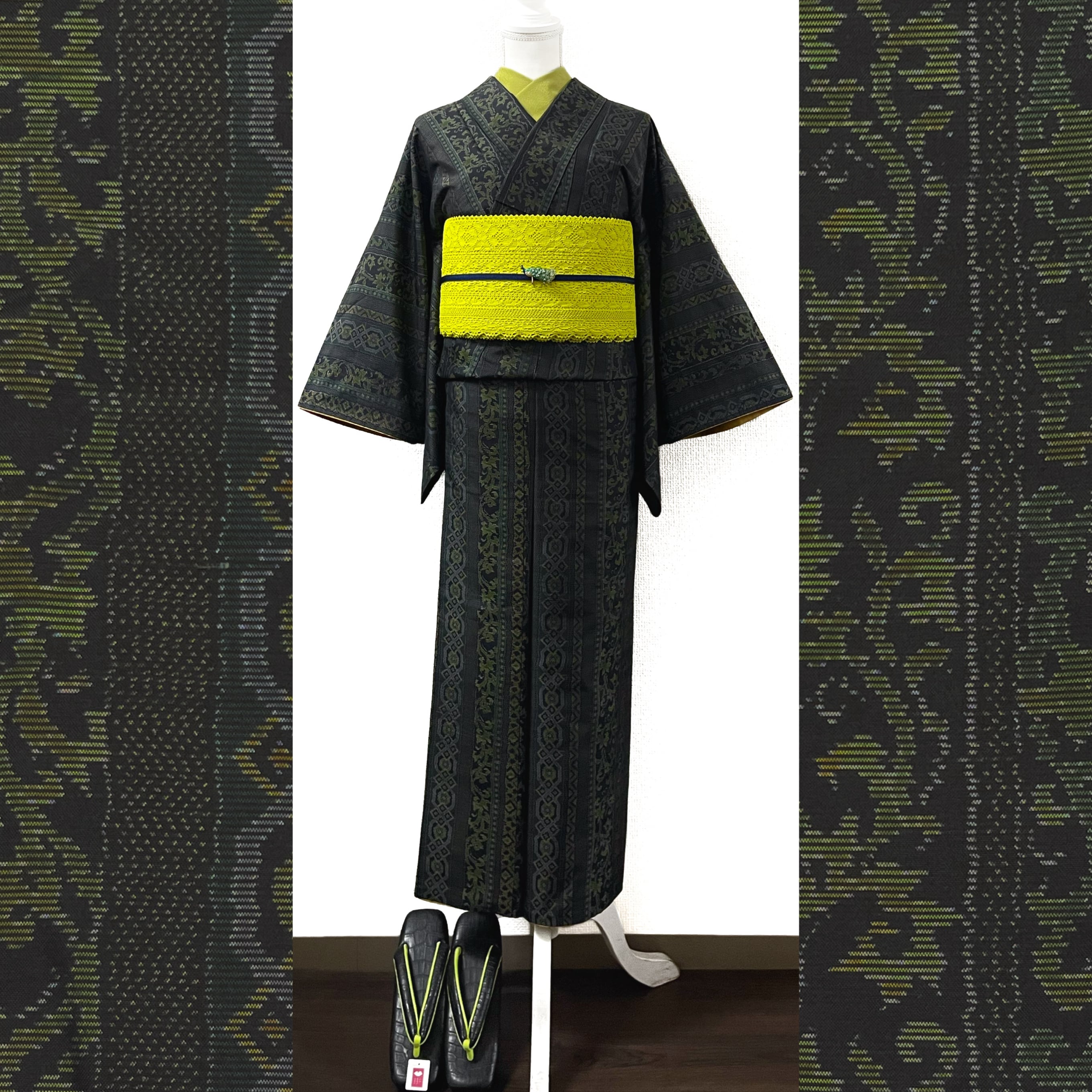 生成色、レモンイエロー、山吹色、若草色、深緑色、ブルーグレーの唐草や幾何学模様でできたストライプ柄がデザインされた