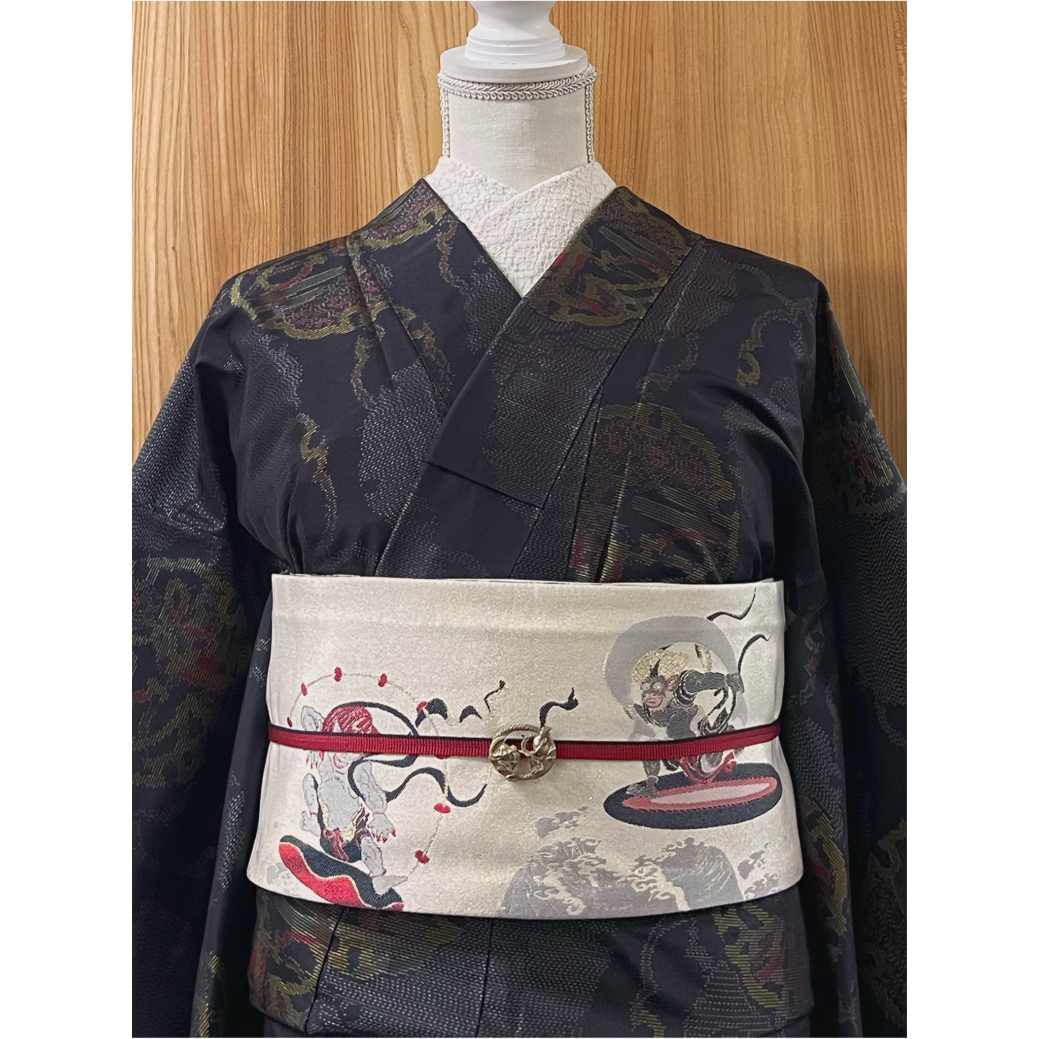 商品名:「風神雷神図風リバーシブル半幅帯(オフホワイト)」