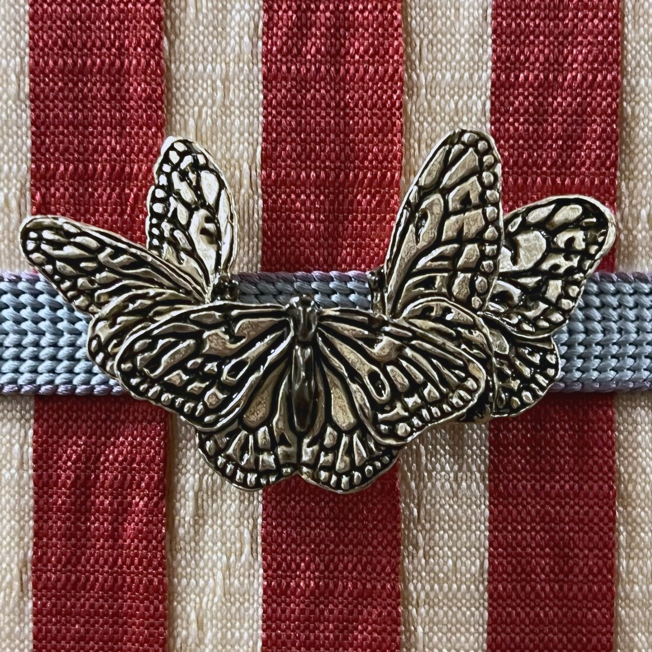 色・質感:アンティーク調な落ち着いたツヤ感のシルバーで、翅の模様に合わせて黒色が刷り込まれています。