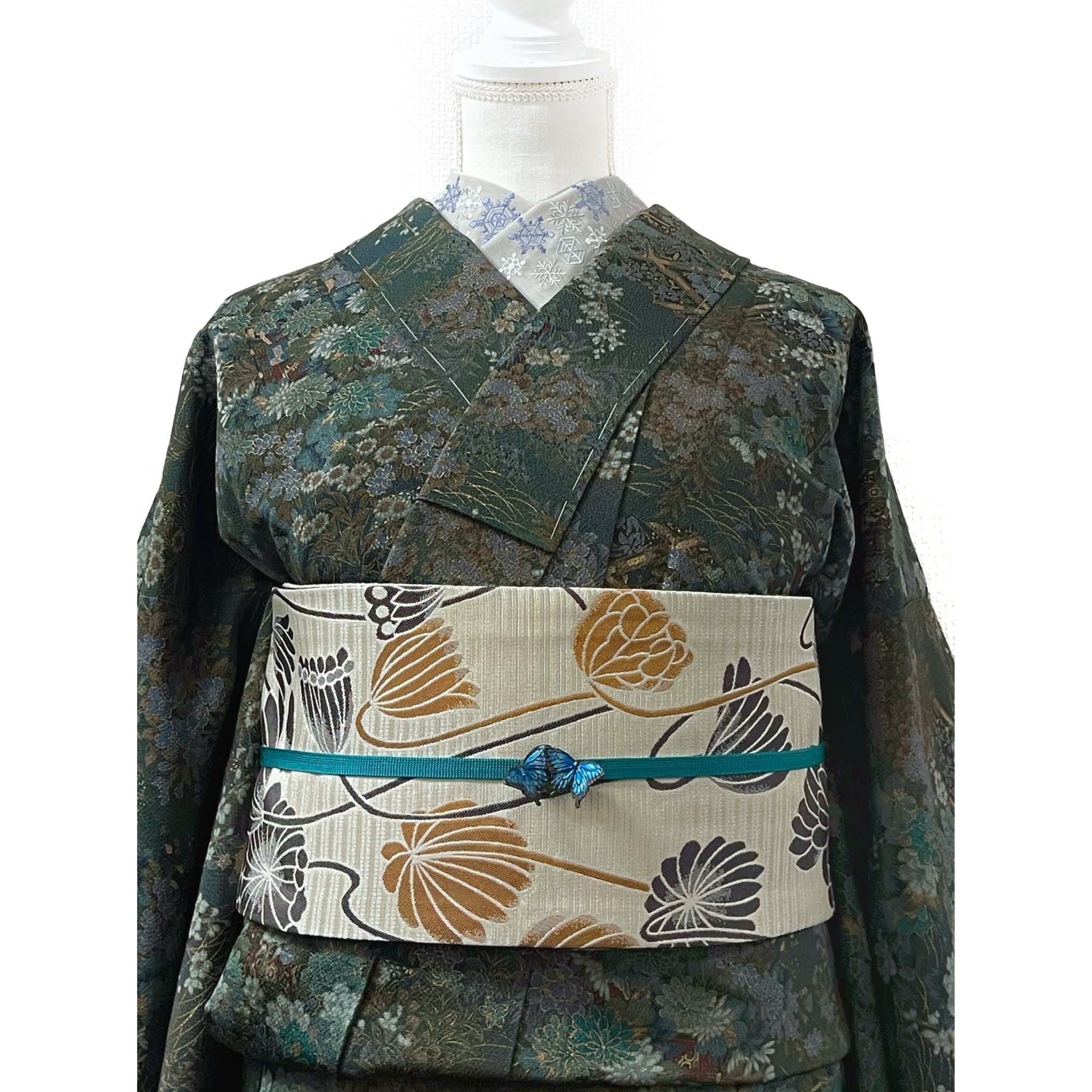 黒、ライトグレー、カラシ色で蓮の花模様が織り込まれたシックでモダンな一本です☺︎