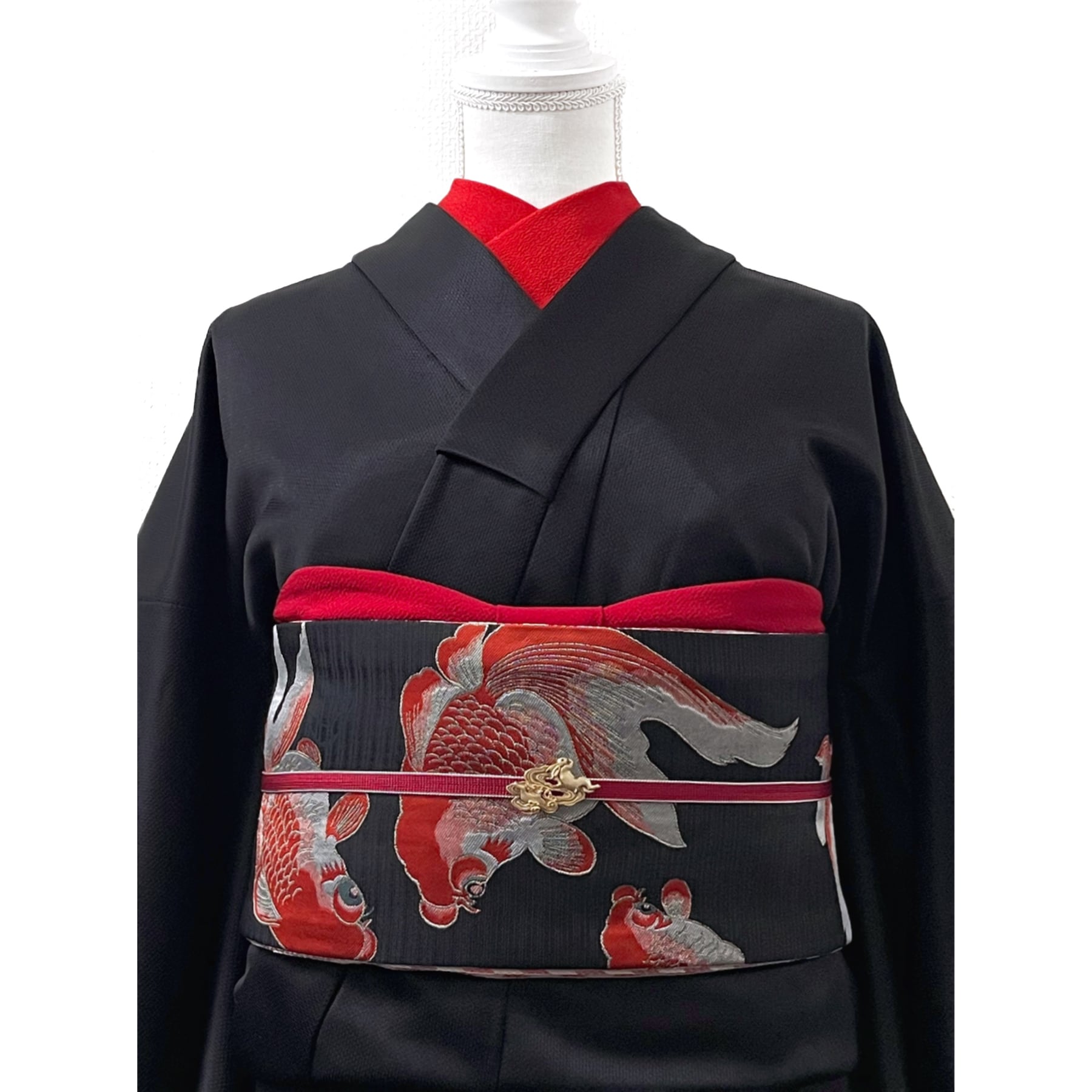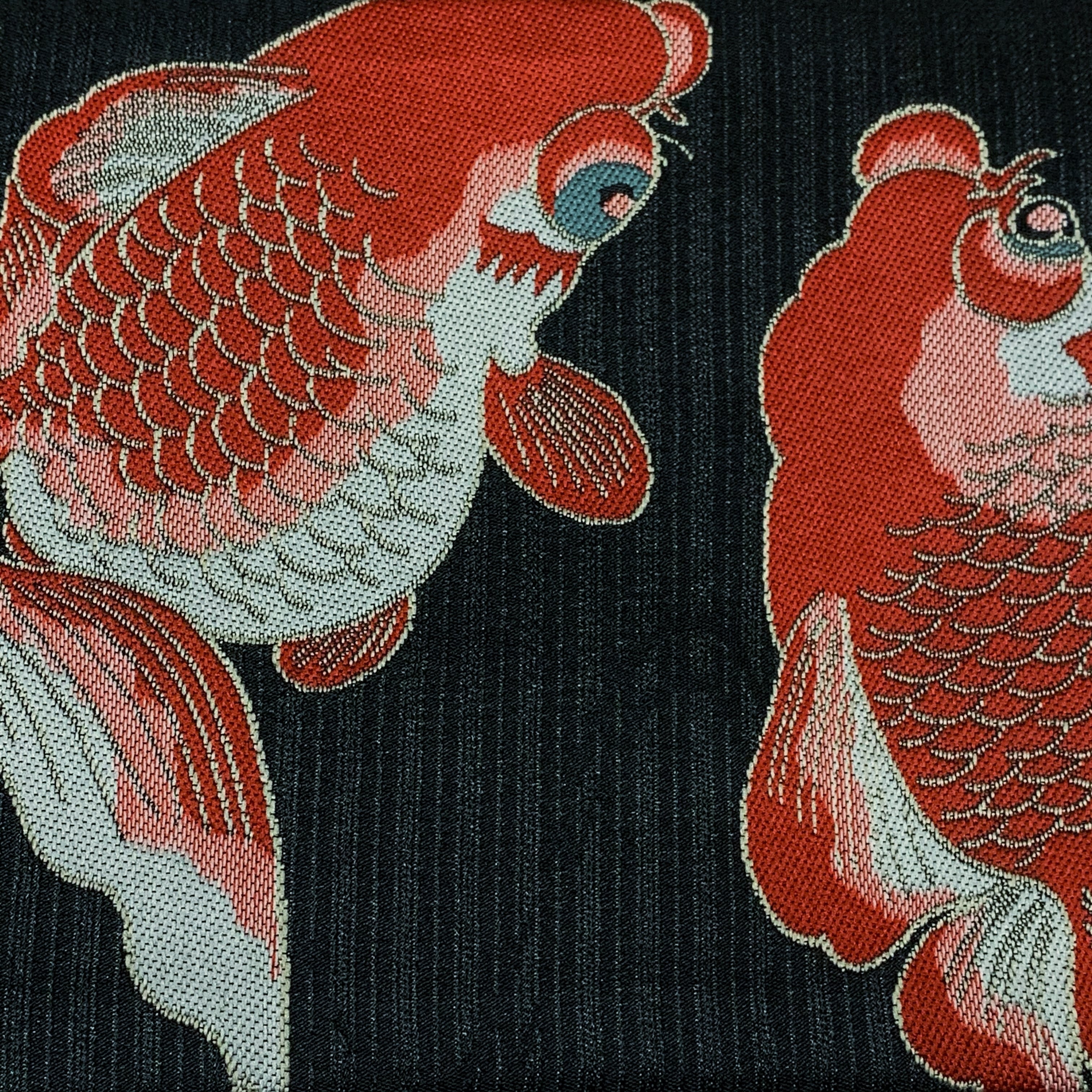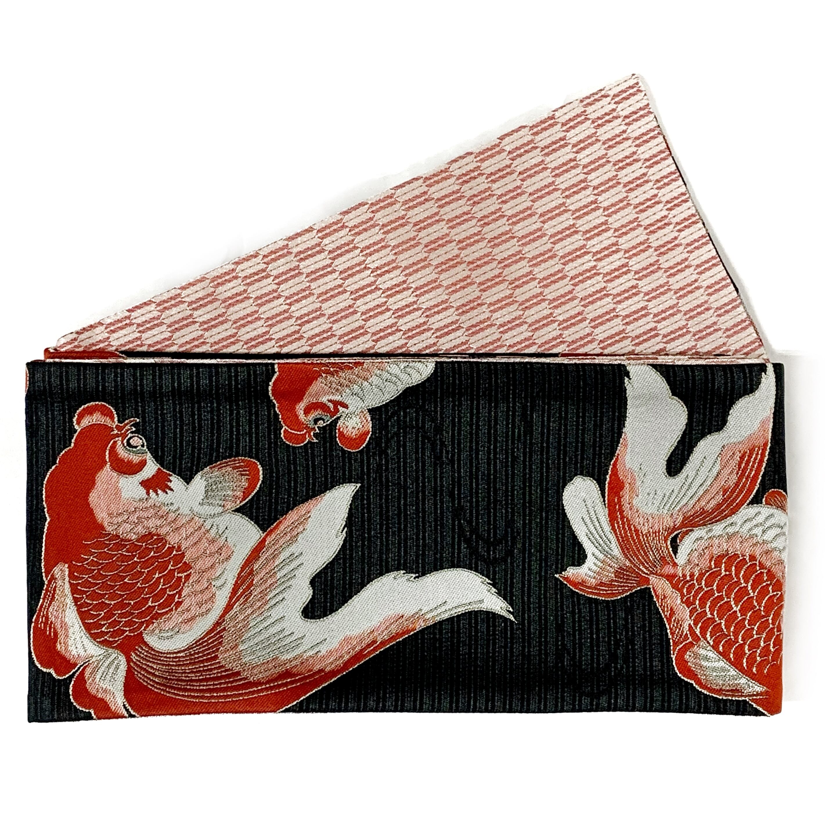 色柄説明:光沢のある黒のしっかりと凹凸のある縦縞と流水文様の地に赤、ライトグレー、赤みのピンク、ブルーグレーの金魚柄が大胆に織り込まれた粋でモダンな一本です☺︎