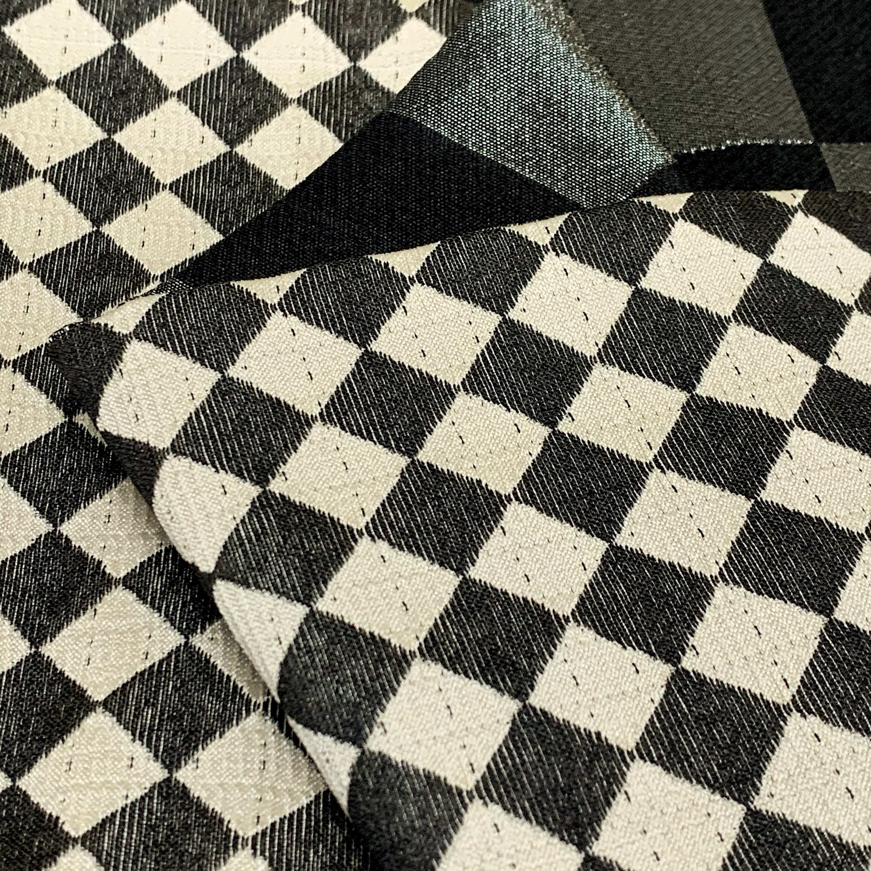 色柄説明:縦縞の凹凸のある織り柄が高級感のあるオフホワイトの地に、ほぼ黒に近いダークグレーのダイヤ模様が織り込まれた